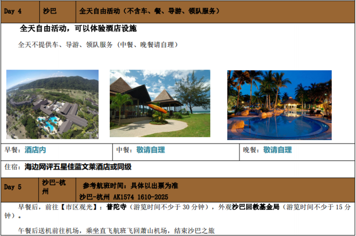 3、沙巴 4 晚配套酒店住宿(大床/标准间),不含单房差;