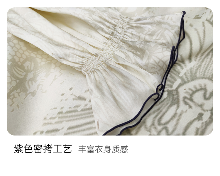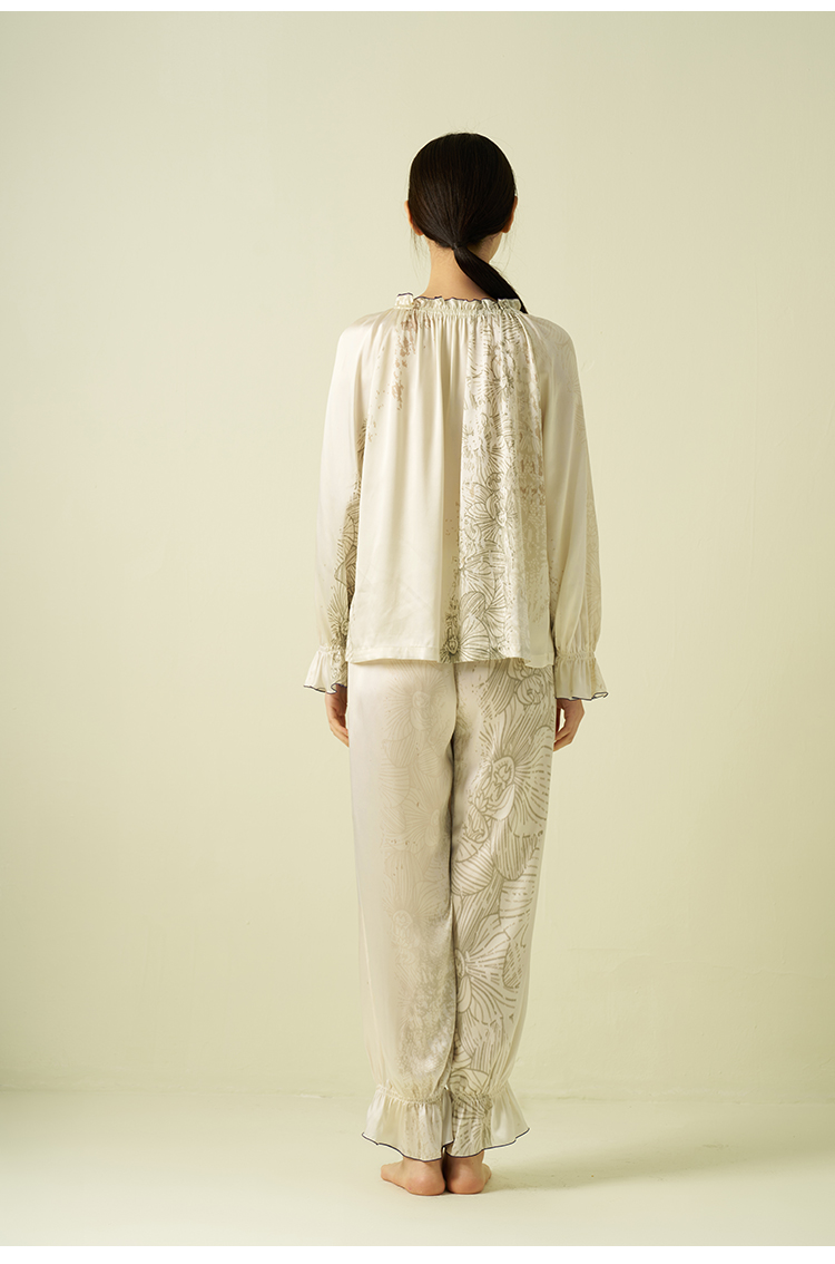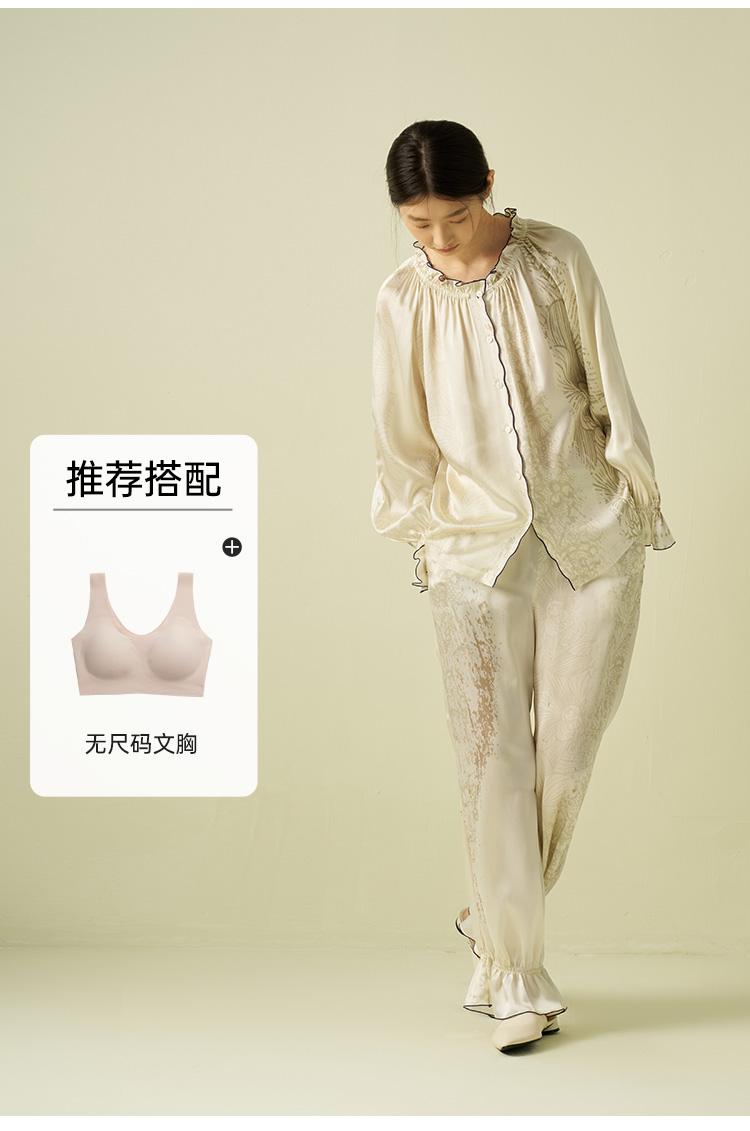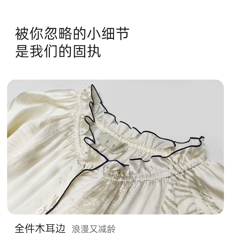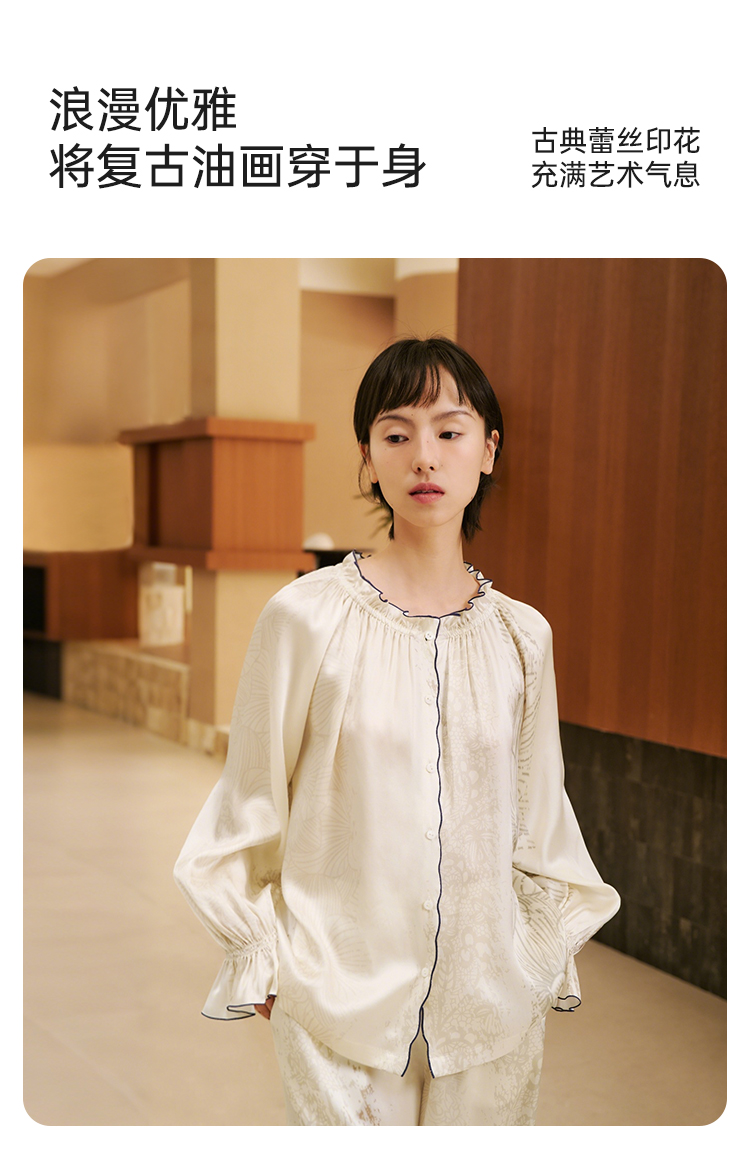宫廷风』桑罗波纹蕾丝圆领长袖家居服套装100%桑蚕丝2025年新款