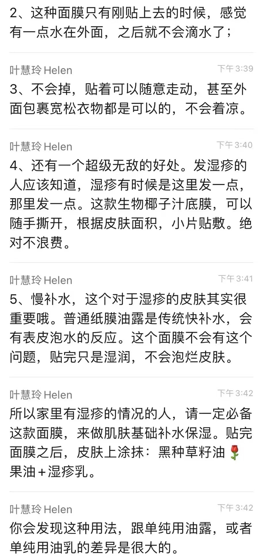 从2月开始,罗甘我已经用了好几盒了,非常喜欢,AyuSkAma的膜纸太好贴了!打开是三层膜,用时取中间一张,因为是生物纤维,属于慢补水膜,上脸之后贴合度非常好!凉凉的,非常降烫,并且真的有帮助!罗甘是湿疹也可以用的,自己撕成合适的大小贴在身上湿疹部位就可,不会滴水,也不易掉,淡淡的草本香,特别舒缓!