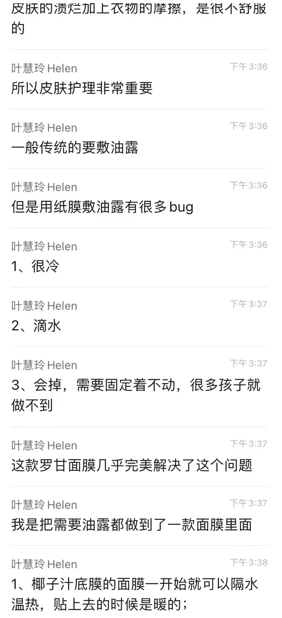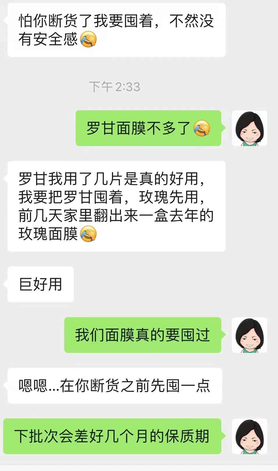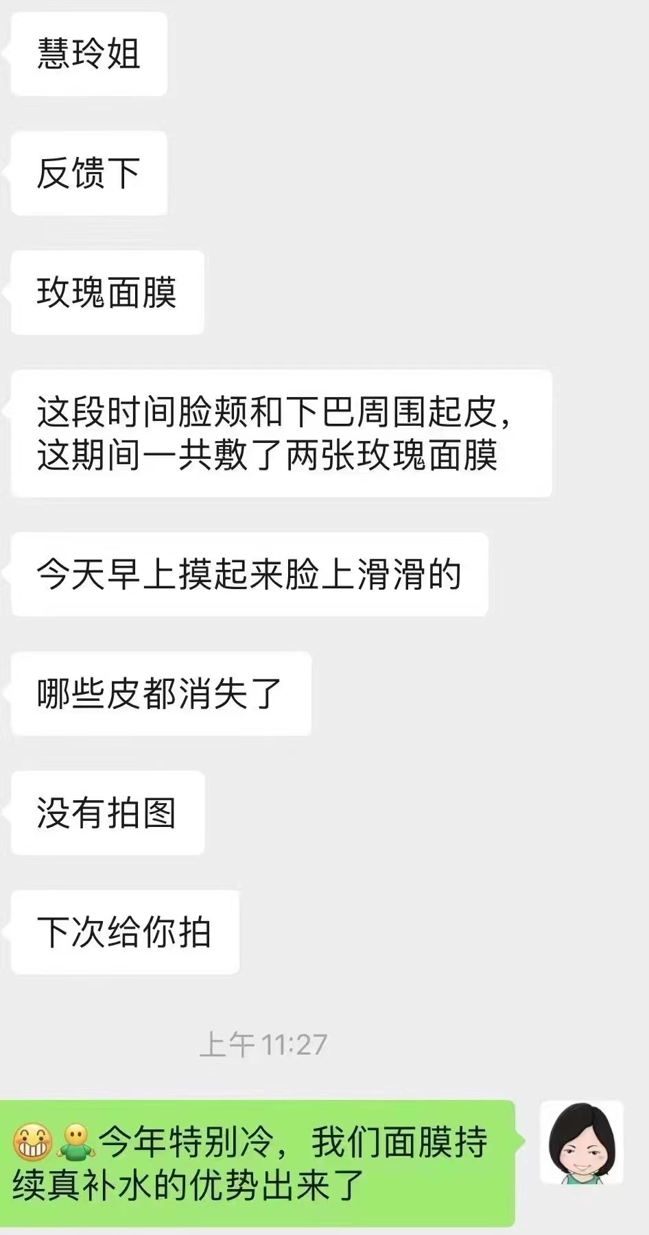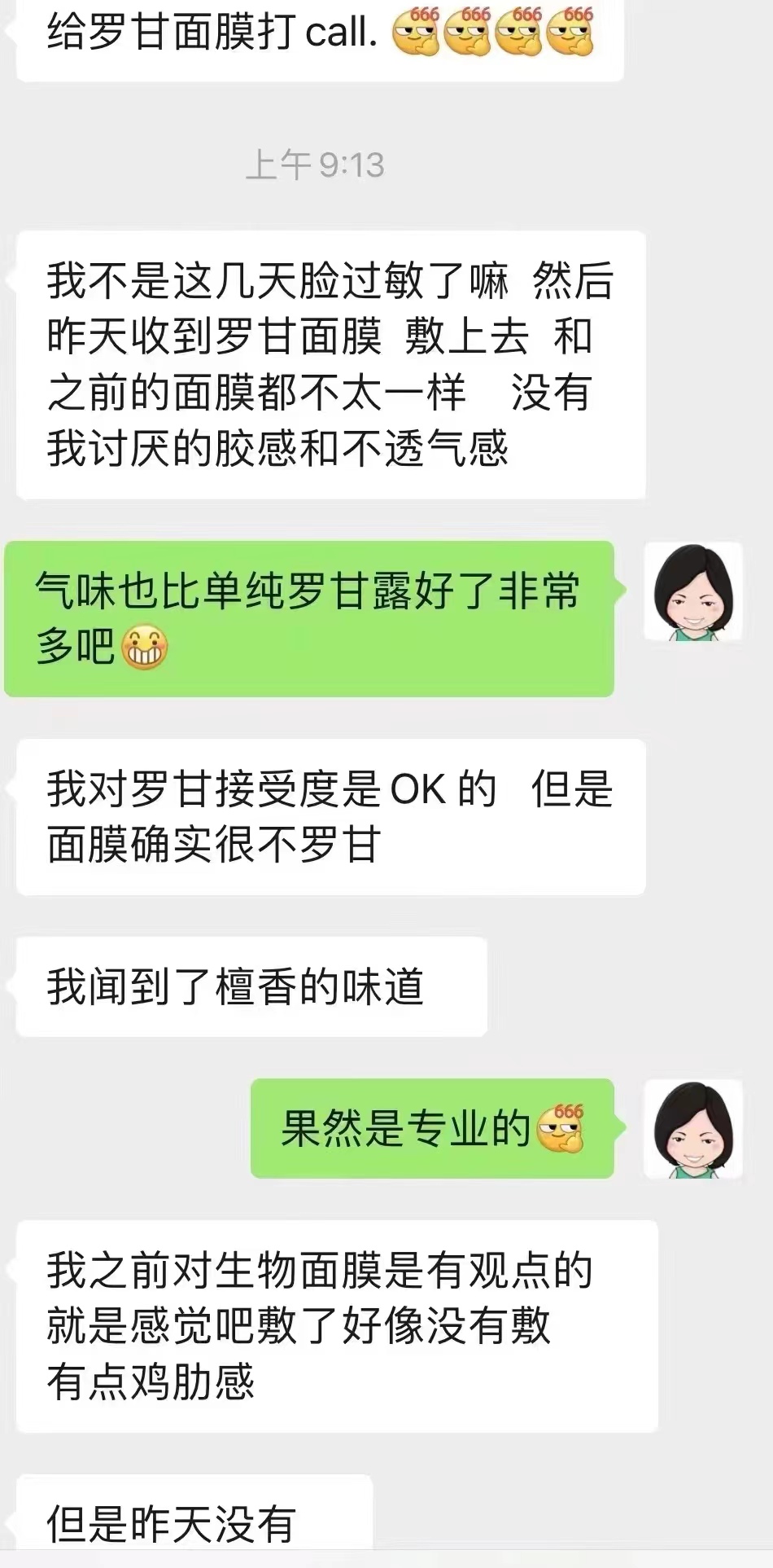 因为生病我已经非常久没正儿八经用过面膜了,平时最多就是玫瑰果油+纯净水湿敷,但1月份因为身上干痒脱皮严重,就求助了朋友,她给我搭了油,同时配了面膜,说是除了敷脸,还可以敷身上湿疹部位,开始我是拒绝的,但她极力保证绝不会过敏,我也就大胆一贴!结果,成了我现在难得会用的面膜。。。罗甘凉凉的,亢敏修复,降烫非常好,对湿疹也确实有帮助;玫瑰不挑人,紧致亢衰,非敏皮都可以闭眼入!而且,两款的媄白效果都不错!
