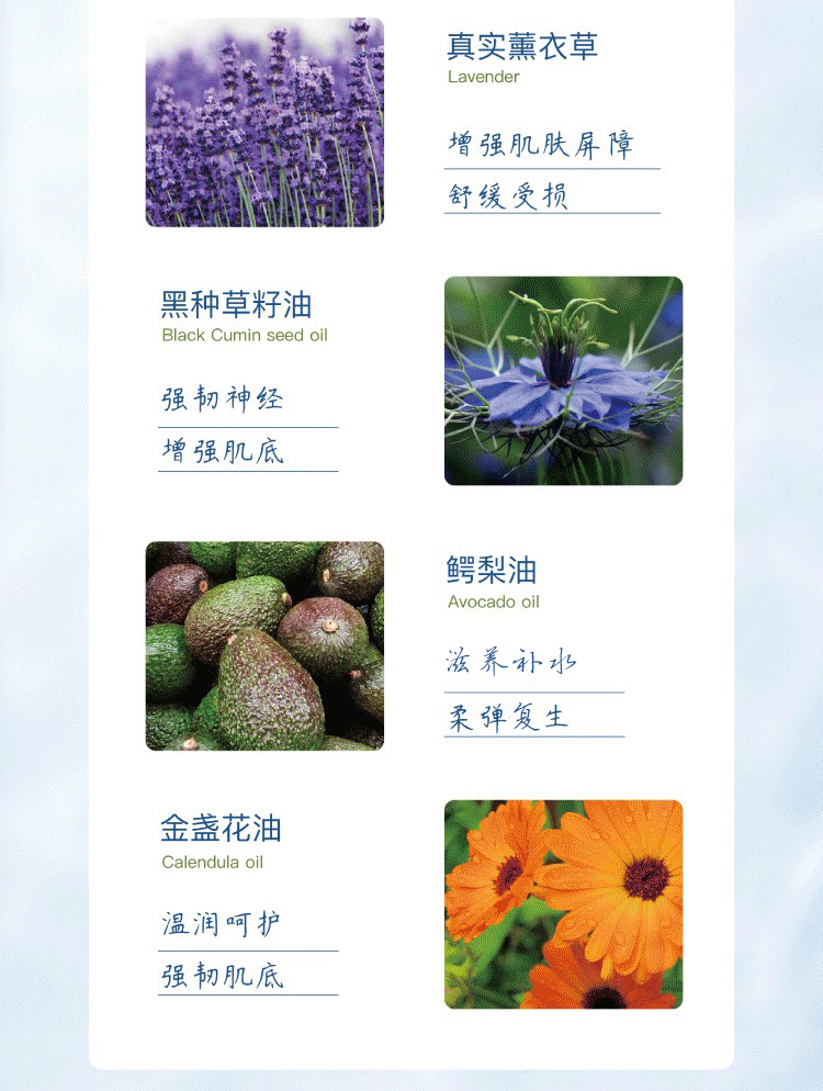 乳香精露(修复敏感)、天竺葵精露(平衡亢炎)和薰衣草精露(镇定修护),除此之外还添加了三大敏感肌肤修复植物油,包括能够强韧肌底的黑种草籽油,滋养补水的鳄梨油以及镇定修复肌肤的金盏花油。非常适合敏感肌、屏障受损肌以及易发红发烫的问题肌和痘肌,放心贴!