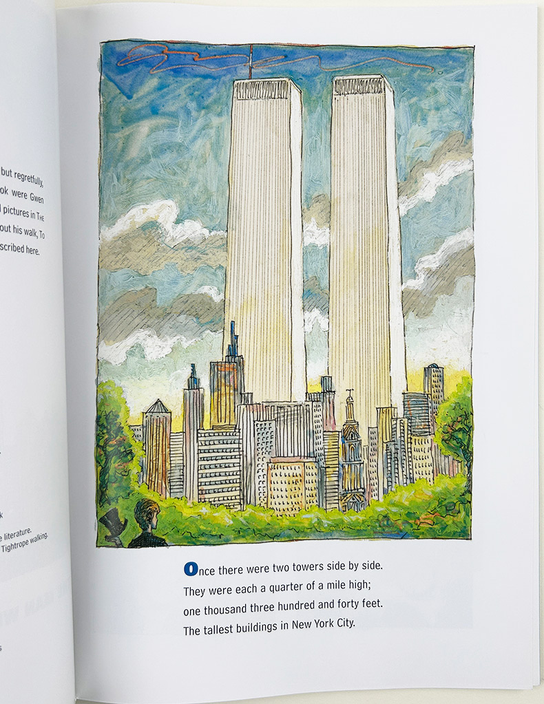 In 1974, French aerialist Philippe Petit threw a tightrope between the two towers of the World Trade Center and spent an hour walking, dancing, and performing high-wire tricks a quarter mile in the sky. This picture book captures the poetry and magic of the event with a poetry of its own: lyrical words and lovely paintings that present the detail, daring, and -- in two dramatic foldout spreads -- the vertiginous drama of Petit's feat.