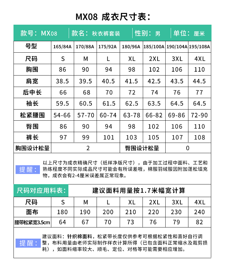 裁缝学苑MX08青少年棉秋衣秋裤纸样套装男装内衣圆领中领衣服样板