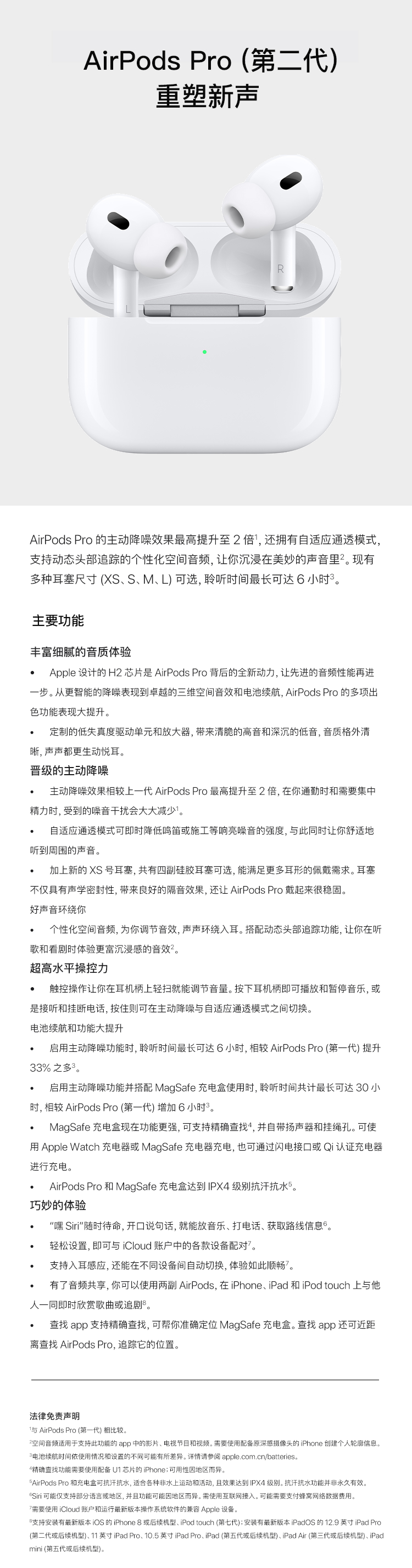 Apple AirPods Pro 2 蓝牙降噪耳机 H2芯片 主动降噪提升2倍 充电盒自带扬声器 内置U1芯片 支持无线充电 支持iPhone、ipad、apple watch