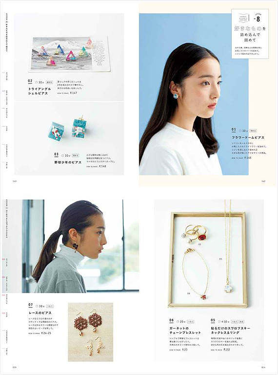 有192个彩色的页面和丰富的内容。用日文书写,但许多图片可能对读者有帮助,对初学者来说可能很容易理解。有150种项链、角砾岩、耳环、戒指和发饰等配件。本书展示了如何使用珍珠、天然石、金属件等标准材料制作各种风格的配饰。此外,它还展示了一些受欢迎的材料,如缩水塑料、粘土、UV树脂等。