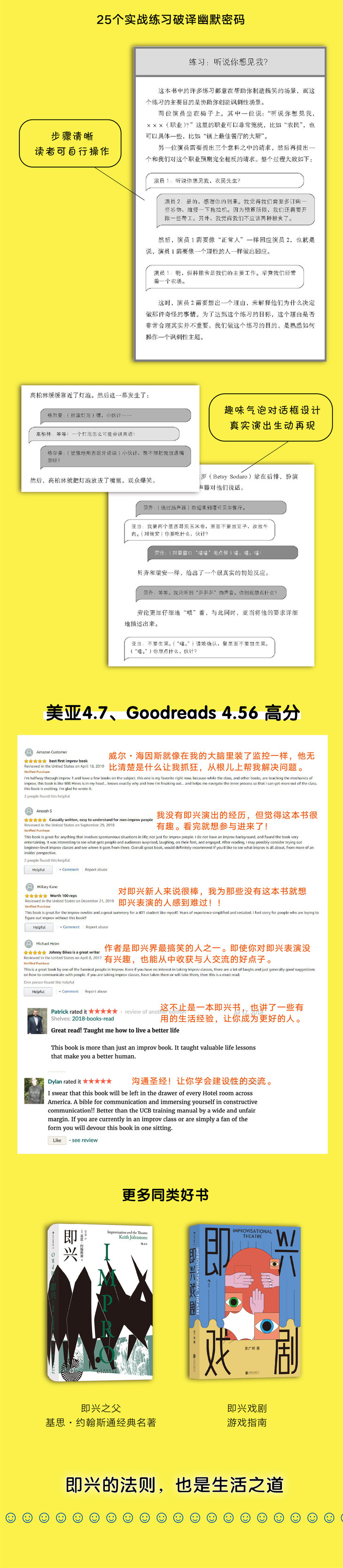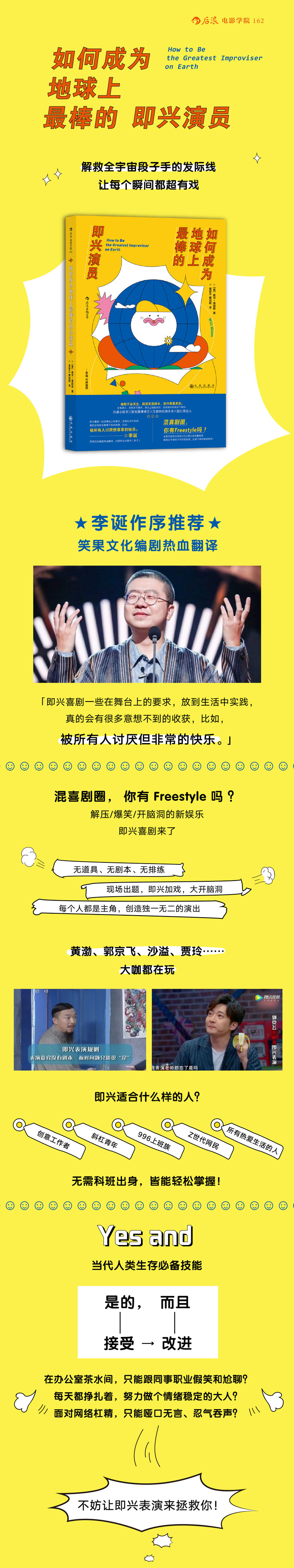 从面向观众在剧场空间正式表演,到与同事沟通、朋友聚会时幽默调侃、散发魅力,或迅速化解网络社交平台上的恶意攻击,即兴训练提供的随机应变小技巧都可以让你受益匪浅。