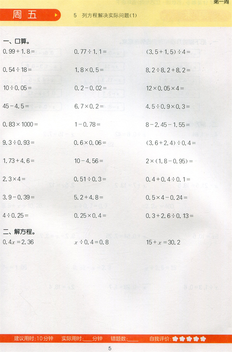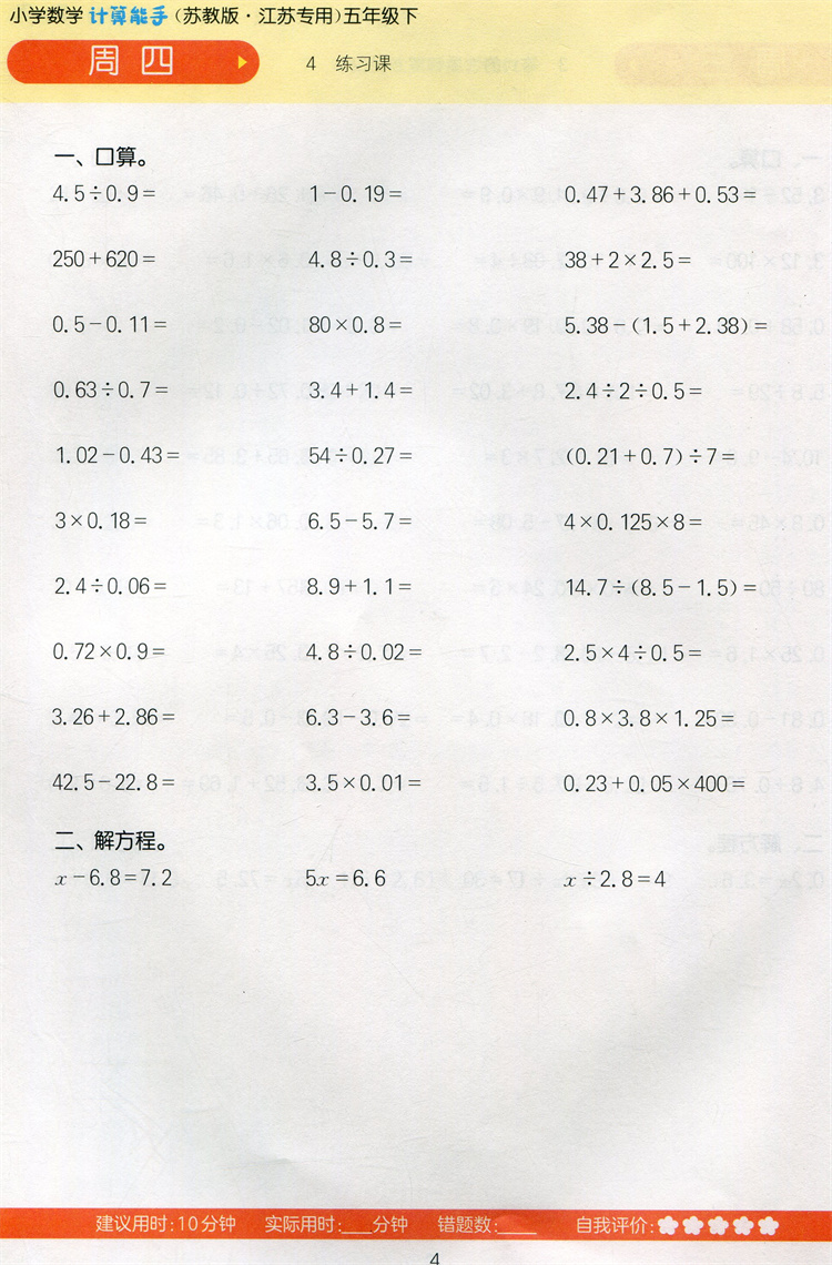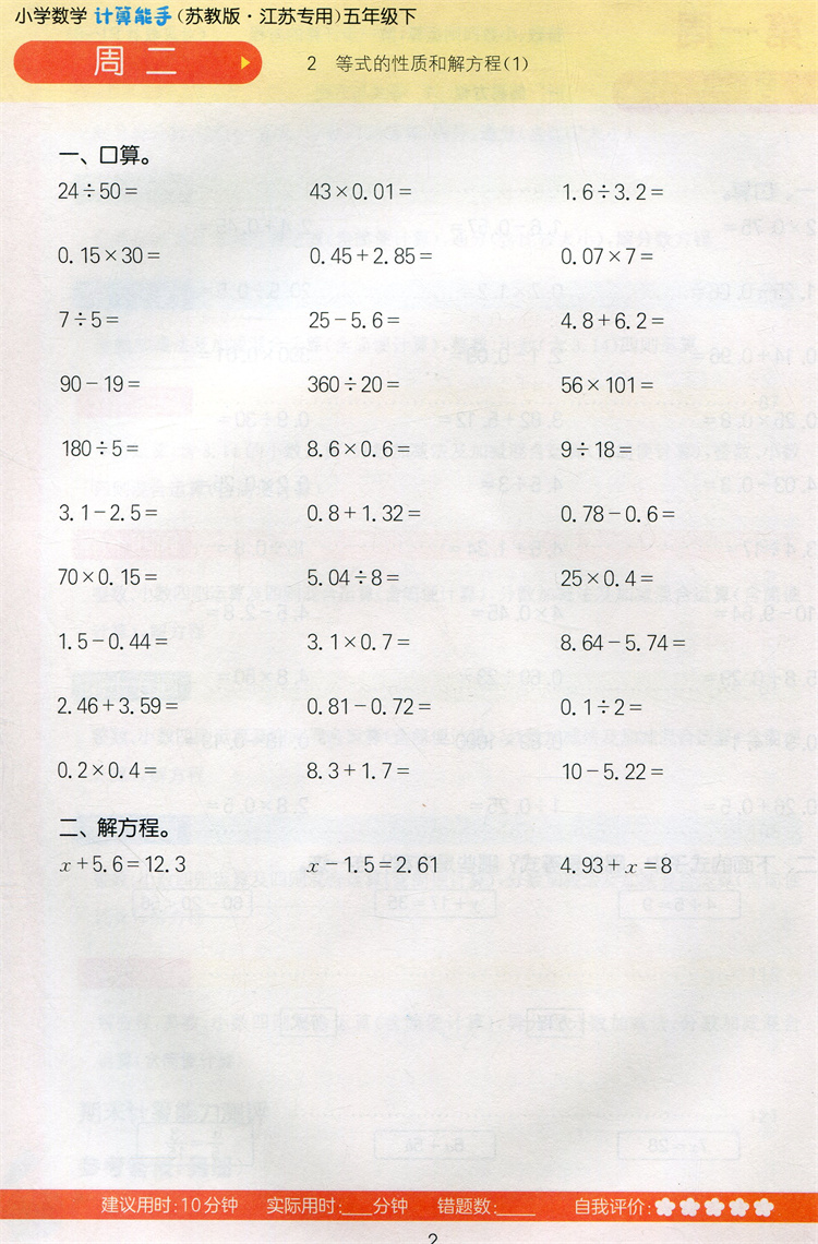2025年春小学数学计算能手 五年级下册 苏教版5下 口算估算笔算 江苏专用 含答案 朱海峰主编 通城学典 浙江教育出版社