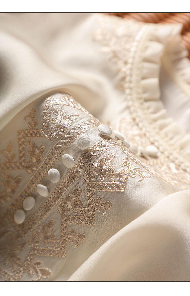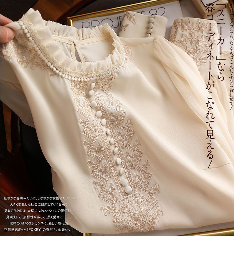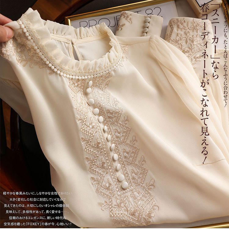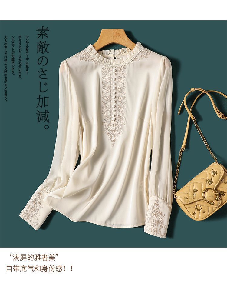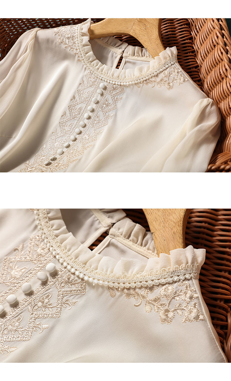 丁摩 刺绣衬衫女春秋季新款木耳边套头长袖T恤上衣复古5ZF-8165