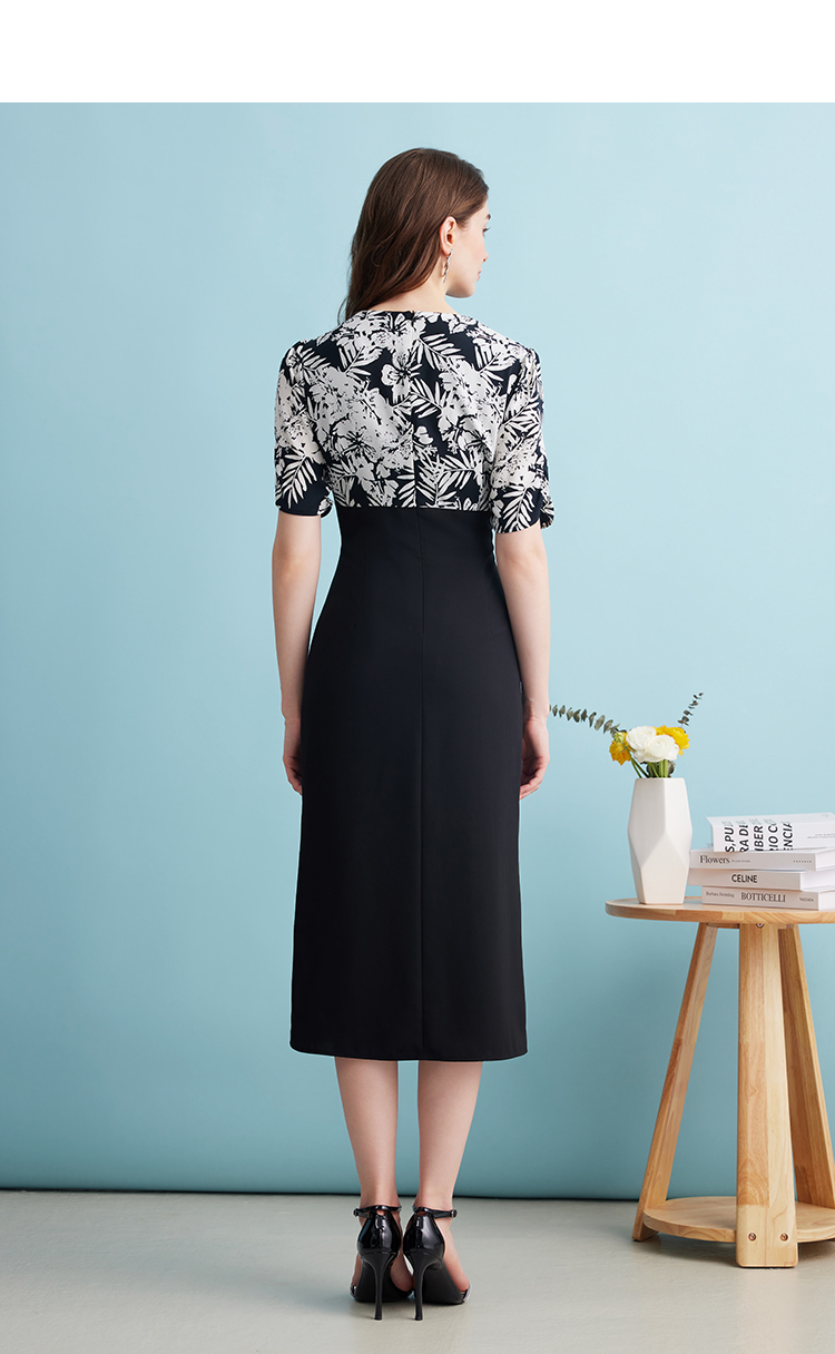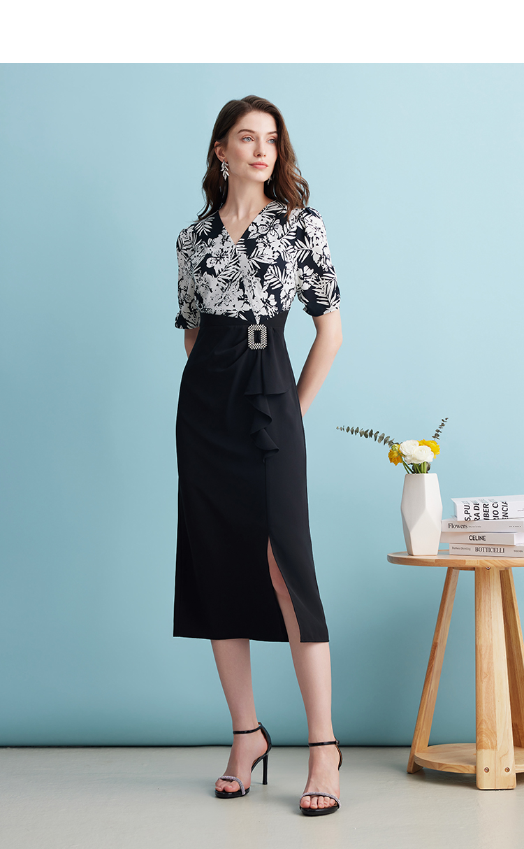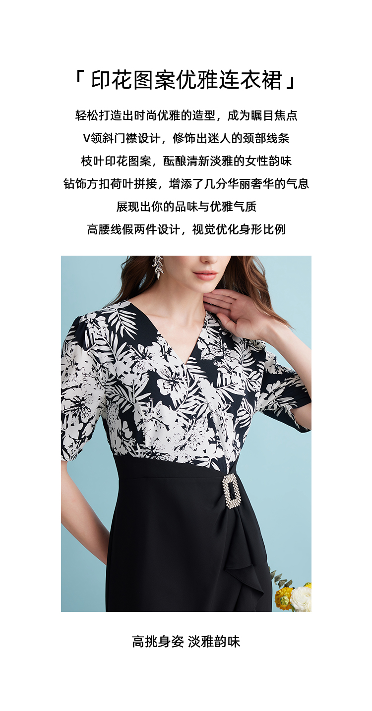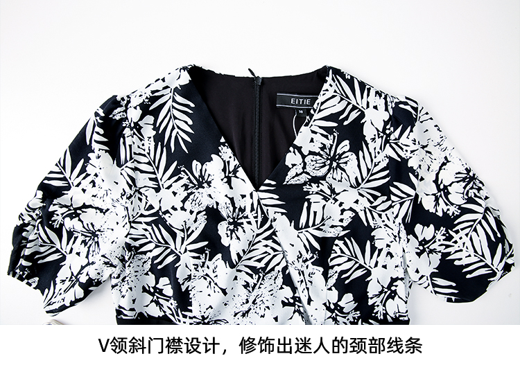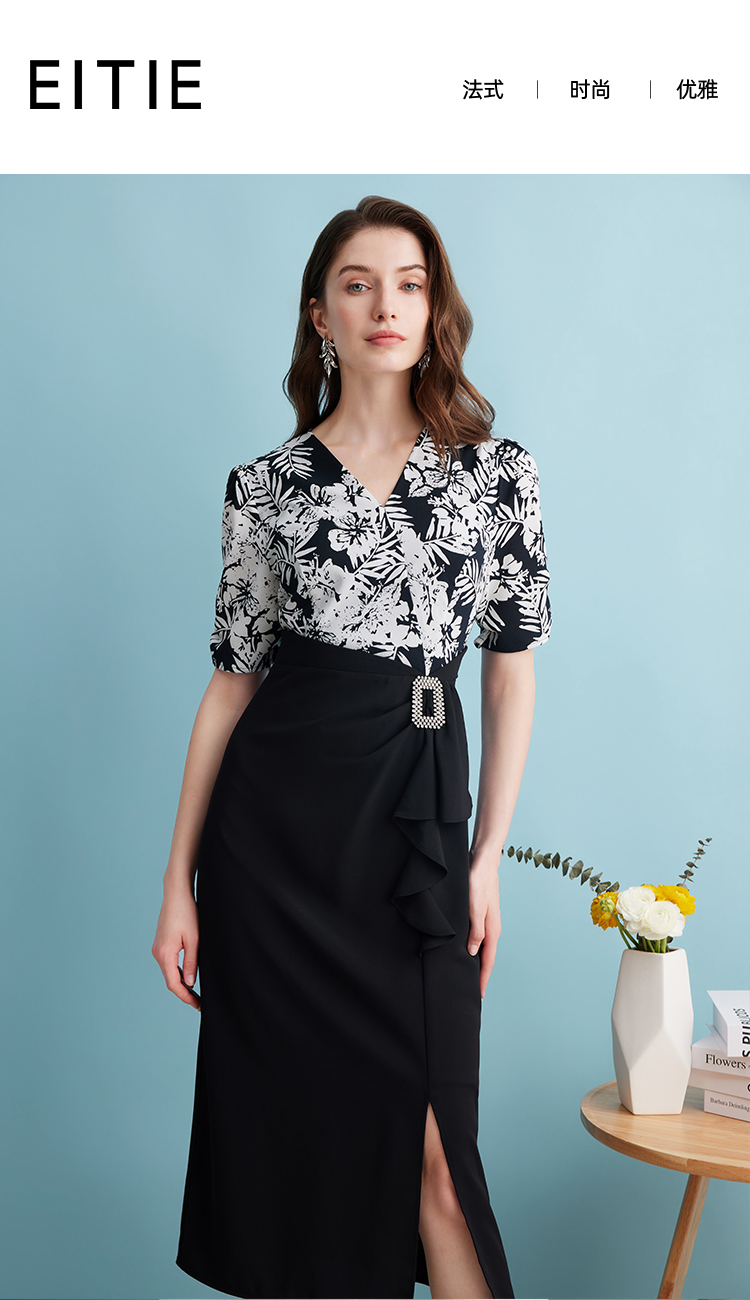 EITIE爱特爱夏季新款假两件印花收腰包臀开叉优雅通勤连衣裙B2407344