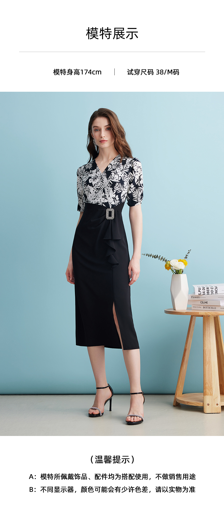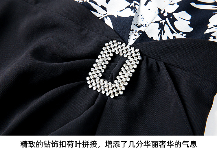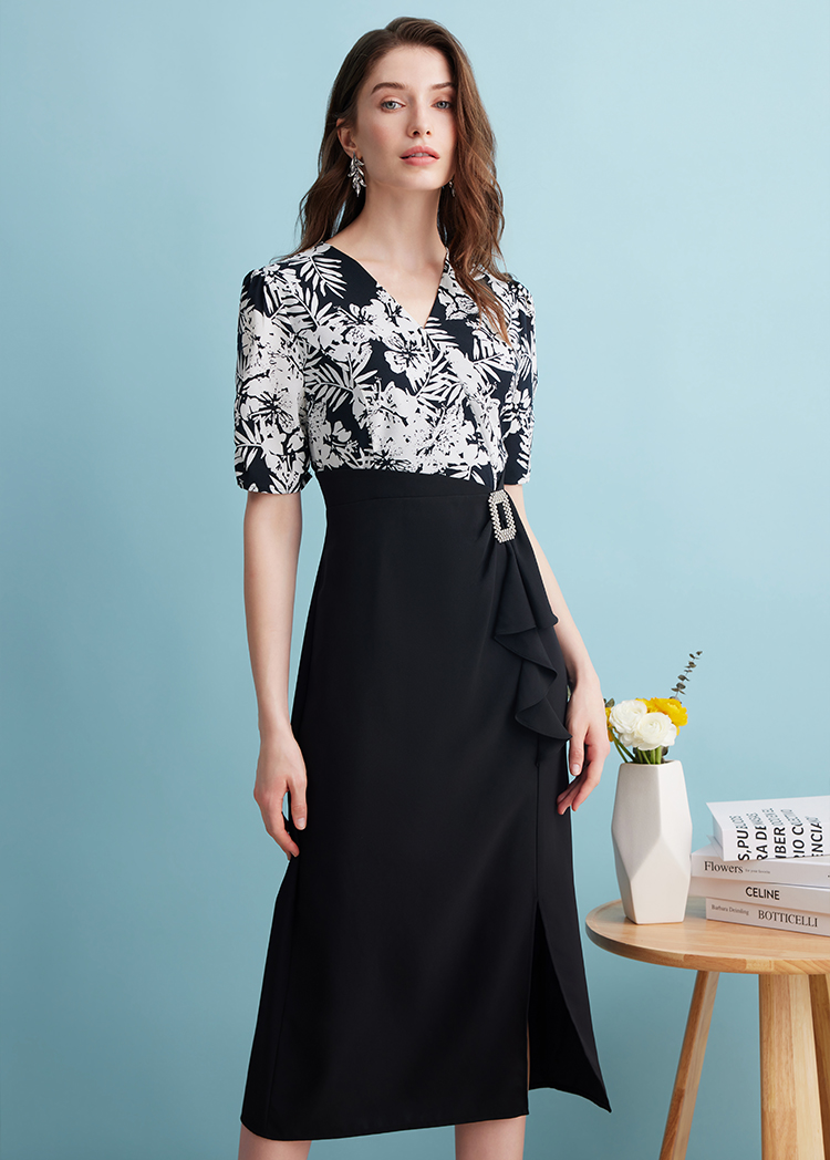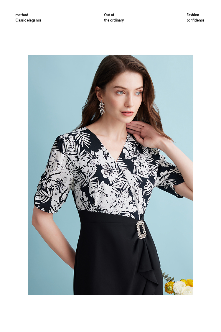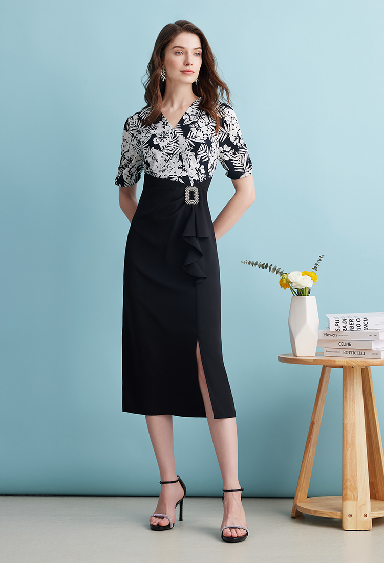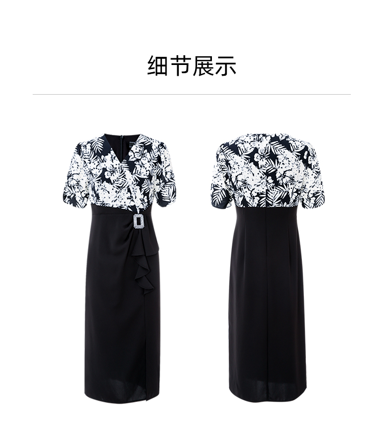 EITIE爱特爱夏季新款假两件印花收腰包臀开叉优雅通勤连衣裙B2407344