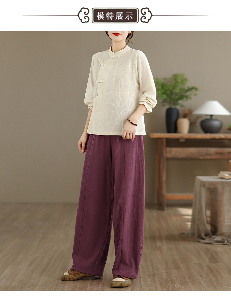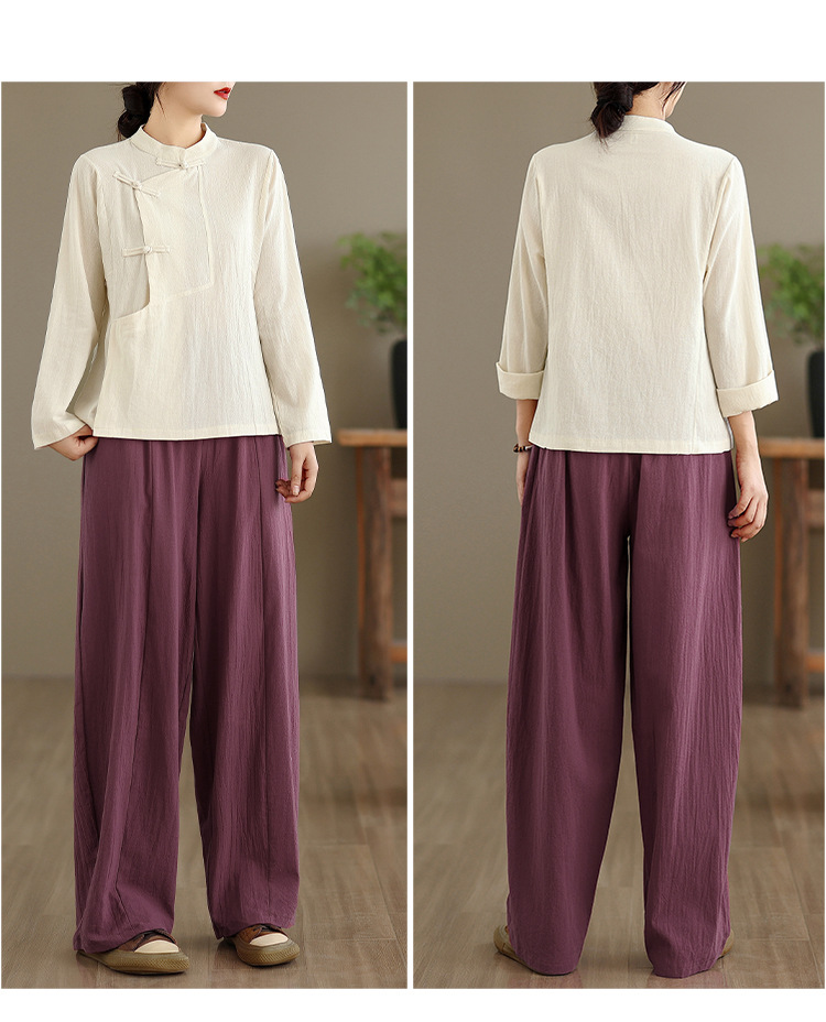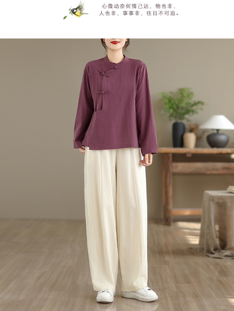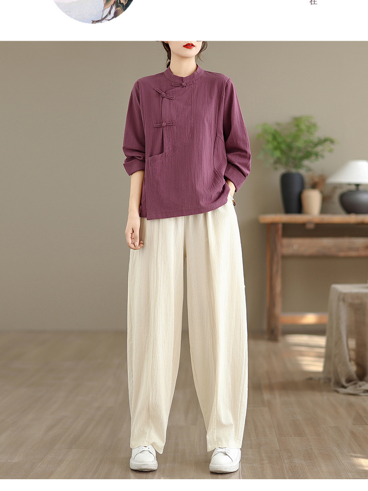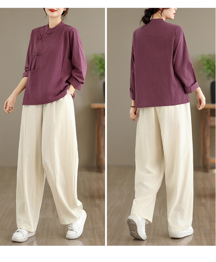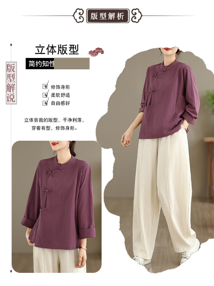 2025秋季新款复古民族风改良纯色文艺禅意茶服宽松长袖盘扣套装女