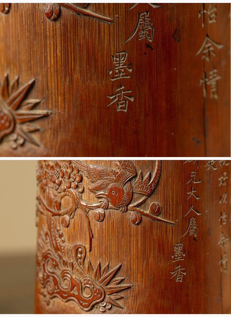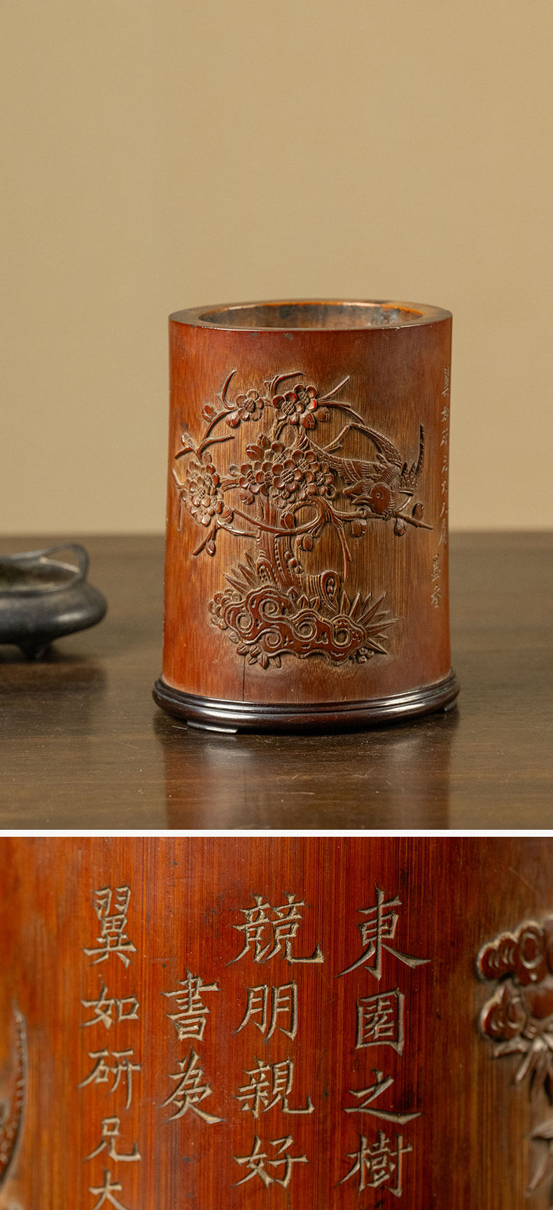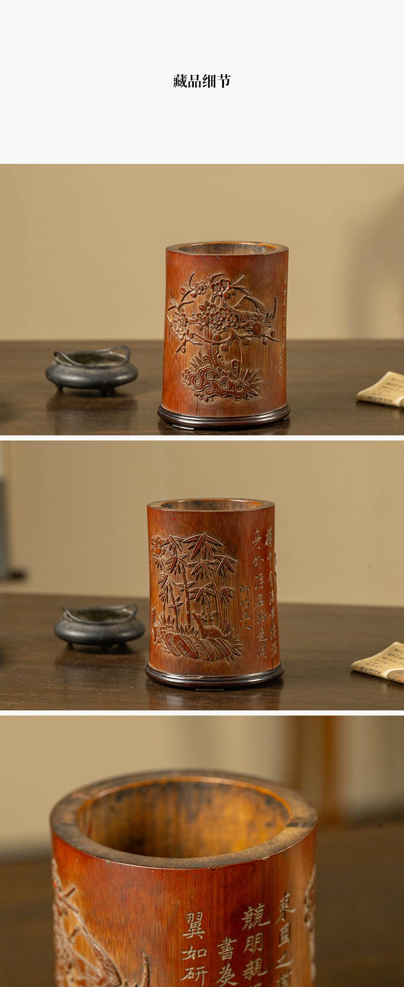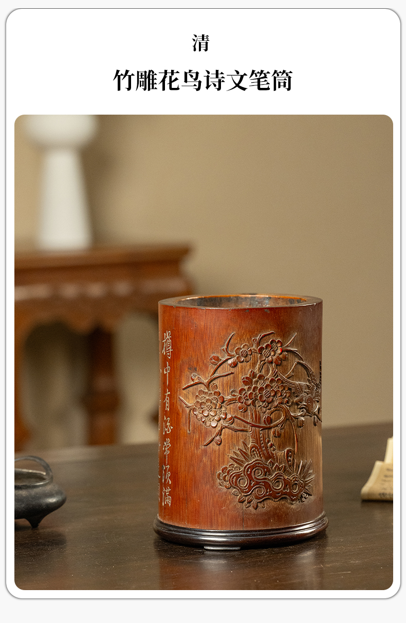 清 黄花梨百宝嵌花鸟诗文笔筒