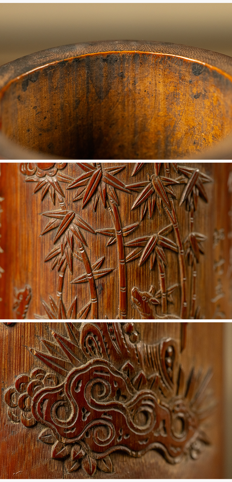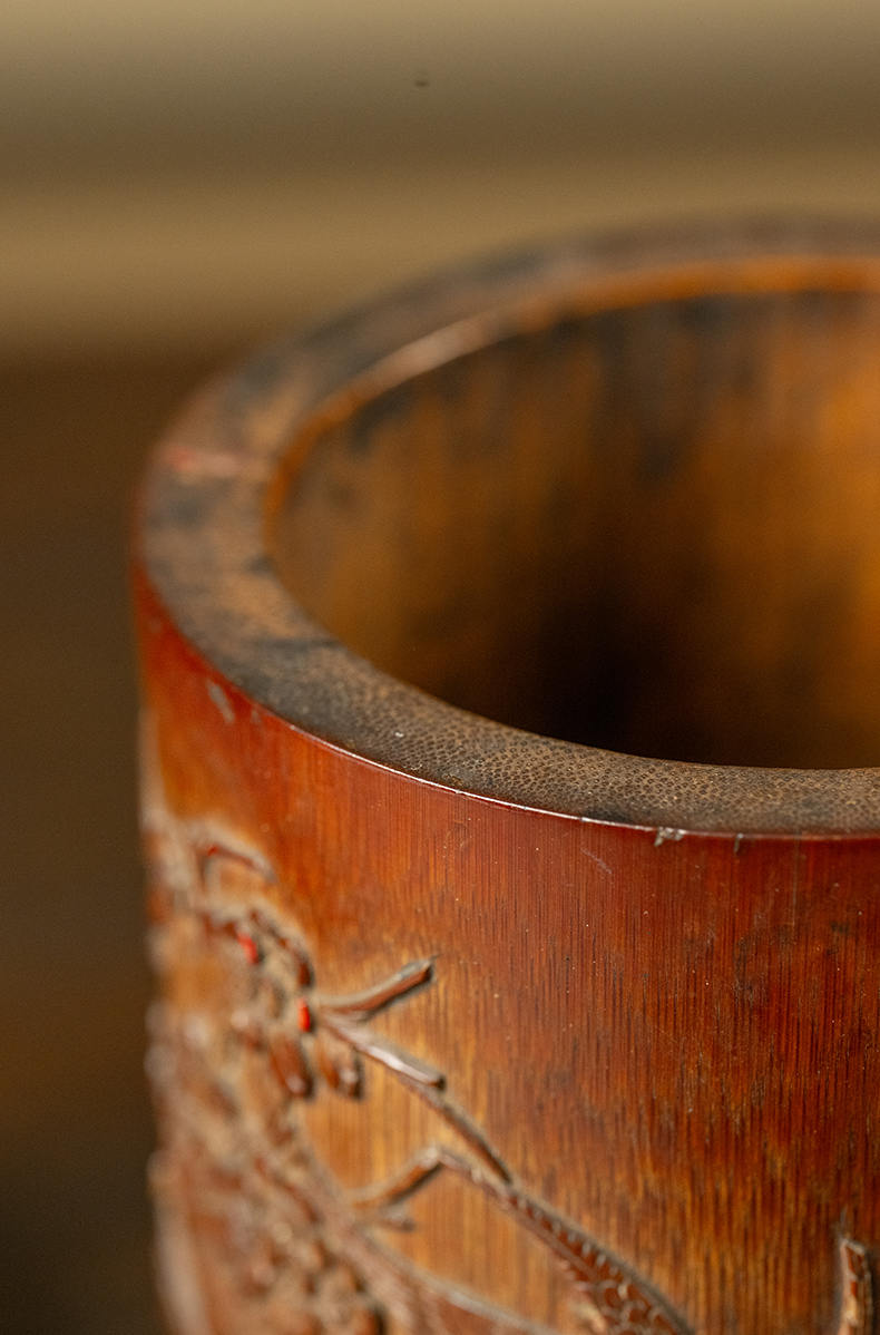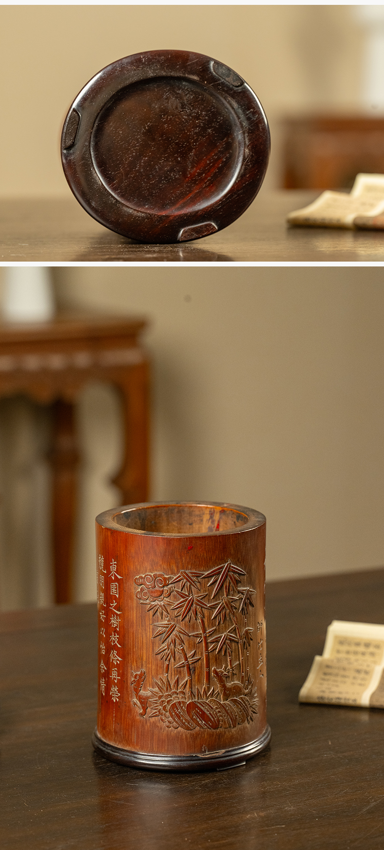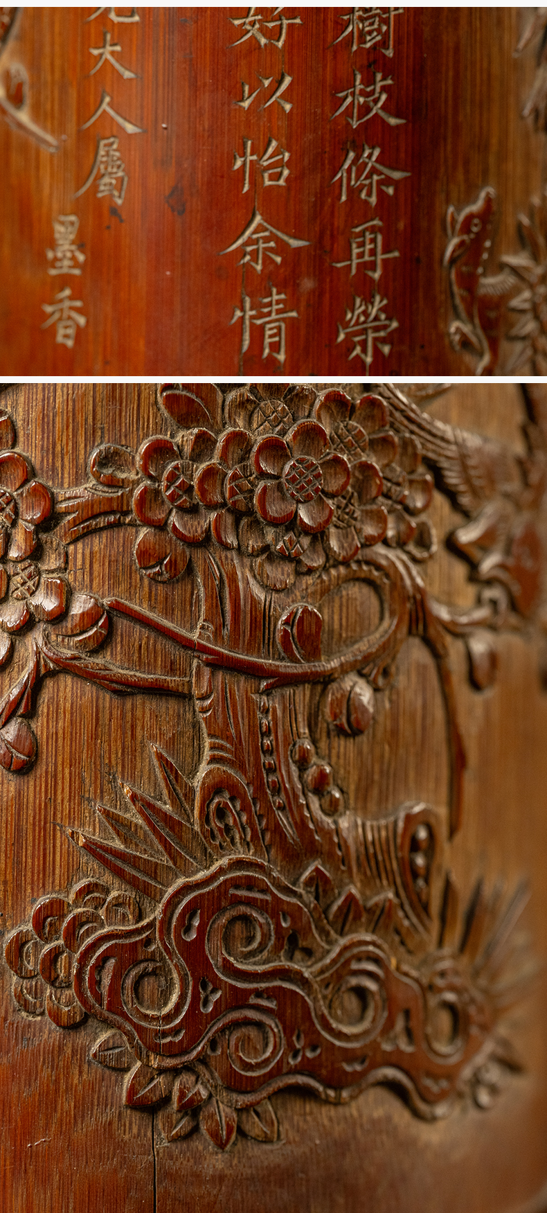 清 黄花梨百宝嵌花鸟诗文笔筒