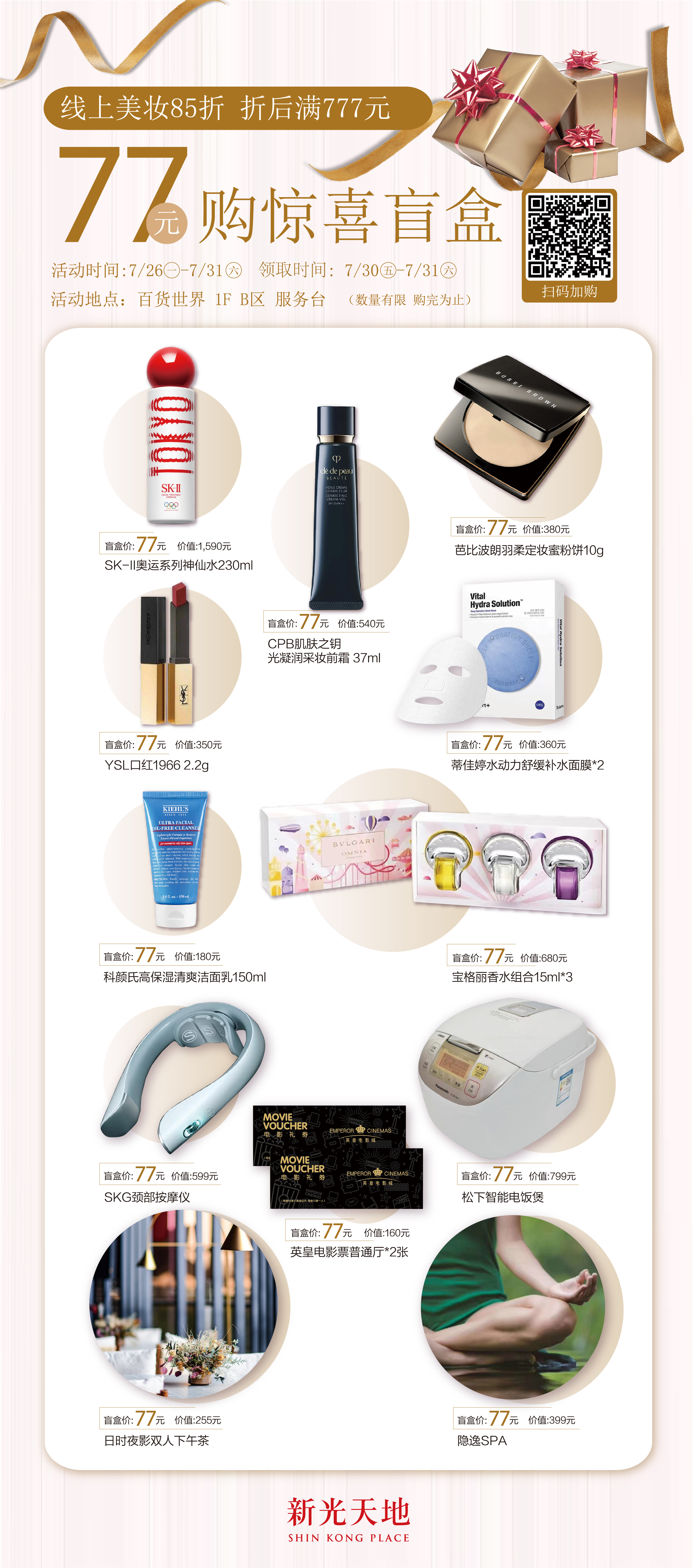 1.线上购买85折专区商品满777元可加77元换购美妆盲盒一份;