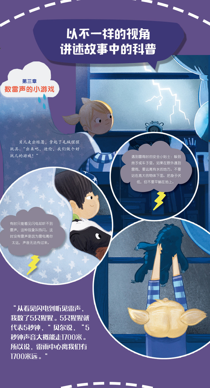 睡觉的时间到了,懂天气的女孩贝儿和表弟迪伦还在说悄悄话。轰隆!天空中突然电闪雷鸣。迪伦害怕起地躲了起来。贝儿告诉迪伦,只要明白雷雨的知识就不会害怕了。听完贝儿的解释后,迪伦晚上还会害怕雷电吗?