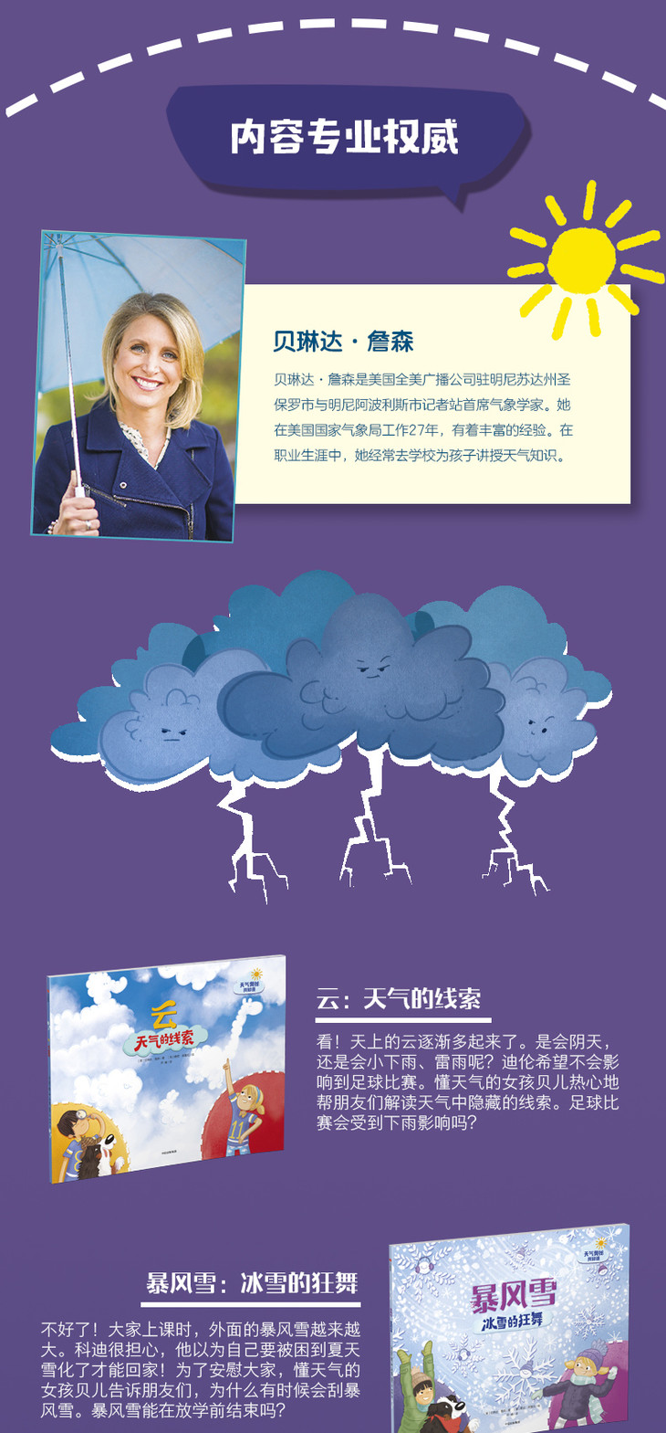 贝琳达·詹森,美国国家气象局气象播报员,二十余年的气象学从业经验,热衷于向孩子普及气象学知识,减少儿童面对天气变化时的恐惧心理。