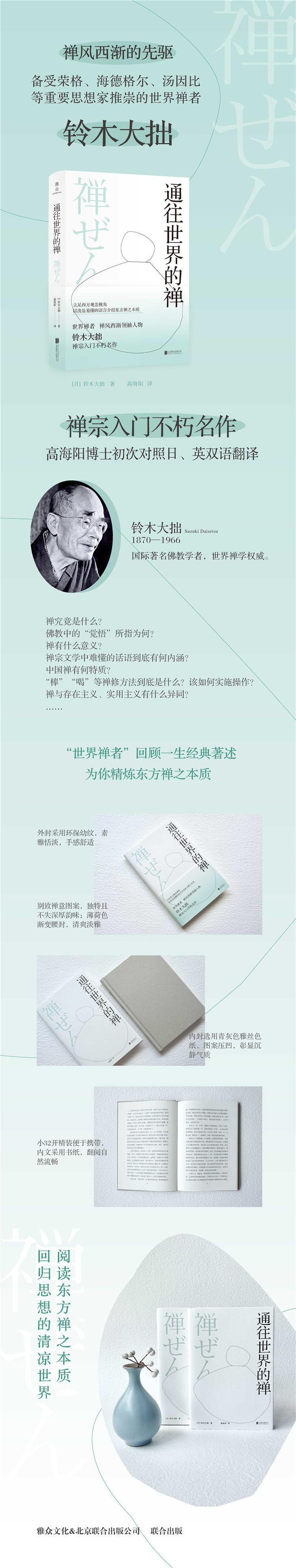 1891年游学东京,进入东京帝国大学(现东京大学)哲学科选科学习,同时在镰仓圆觉寺,随今北洪川参禅。1897年赴美国芝加哥,从事相关学问研究十一年。1909年回日本后,着力于向全世界推介禅学,传扬大乘佛教的思想。他一生著述宏富,除日文著作外,还用英文写作了大量有关禅宗的著作,在西方思想界引起了强烈反响,受到荣格、海德格尔和汤因比等重要思想家的极大推崇,赢得了极高的声誉以及“世界禅者”的美称。主要著书有《通往世界的禅》《东方的智慧》《禅与日本文化》等。
