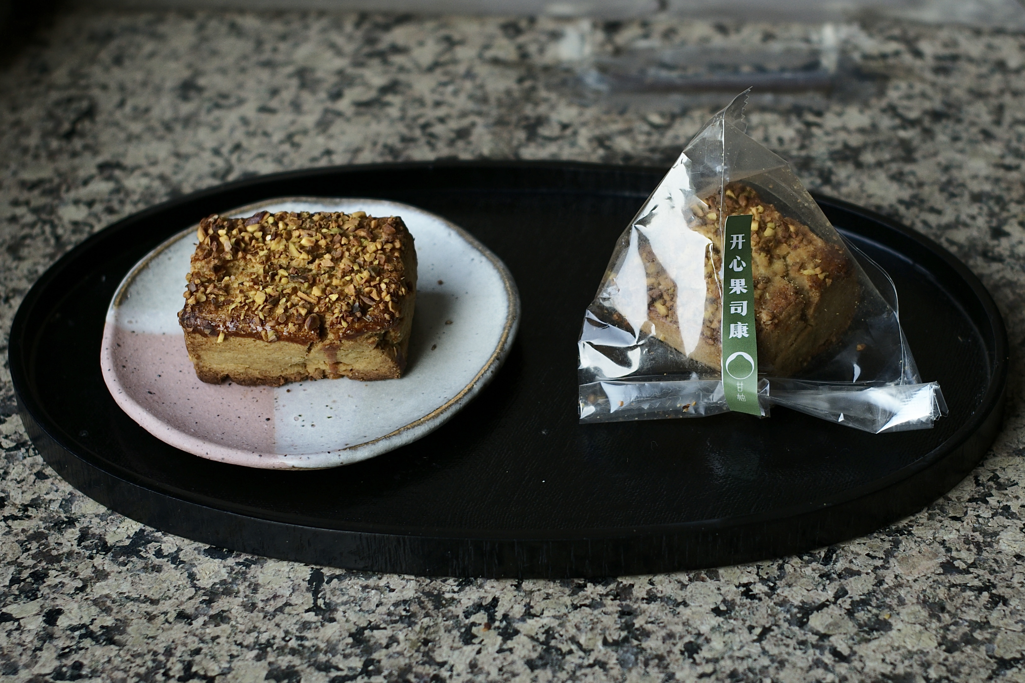 选用成熟开心果制作的纯开心果酱,色泽暗黄,风味醇厚,完整保留亦浓缩了开心果柔和的油脂香气,在这款司康中与黄油香平分秋色。顶部的烤得焦黄的开心果碎提供些许细碎的咀嚼感,虽然质地扎实却也不显干硬,常温之下口感也不逊色。