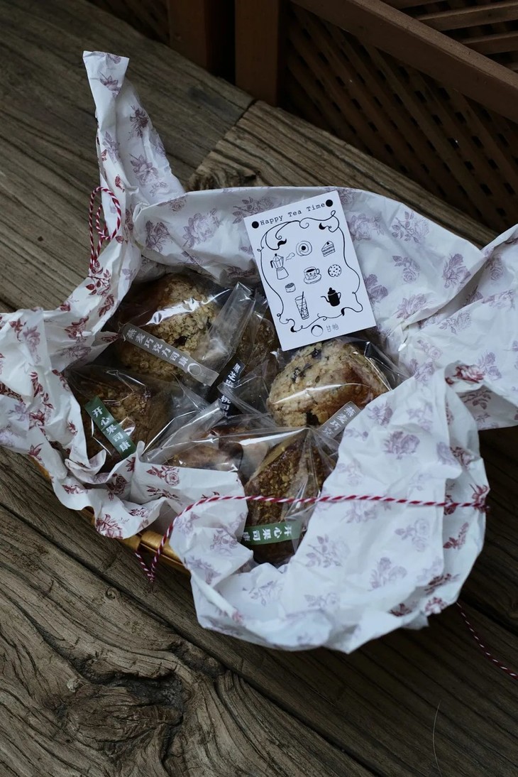 以便于携带的小篮子承载,每件司康均有独立封口小包装,特别适合在户外分享和食用。