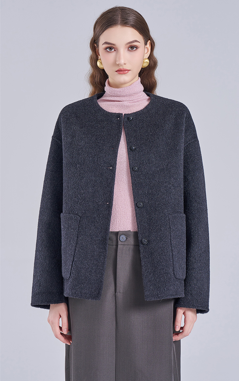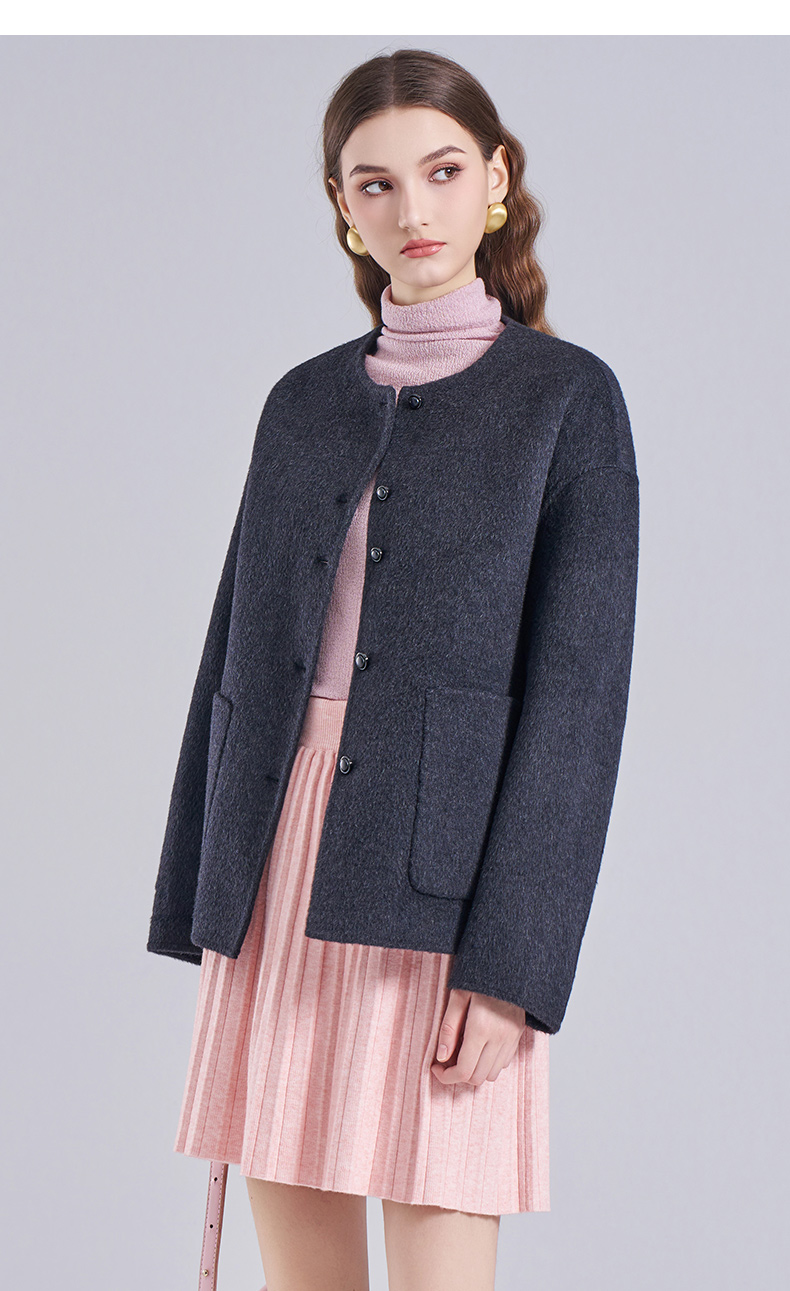 乔万尼2025冬新品软糯真丝驼绒双面呢羊毛短款无领高级感毛呢大衣ED4B745