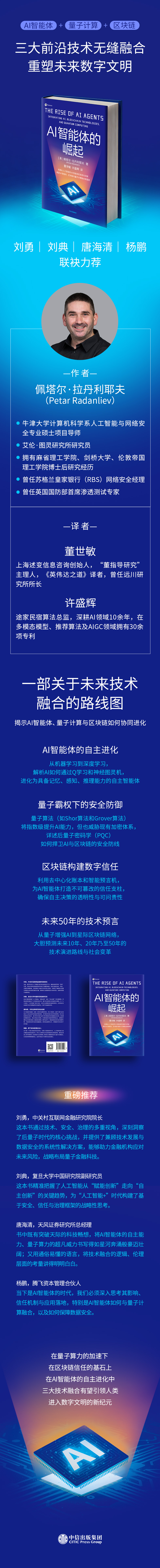 当下是一个重大的技术拐点时刻,也是AI智能体的时代,人工智能的能力在大模型出现后加速迭代,并为人们带来全方位的智能体应用及体验。我们须深入思考其影响、信任机制与应用落地,特别是AI智能体如何与量子计算融合,以及如何保障数据安全。这本书给出了实用的论证及建议。