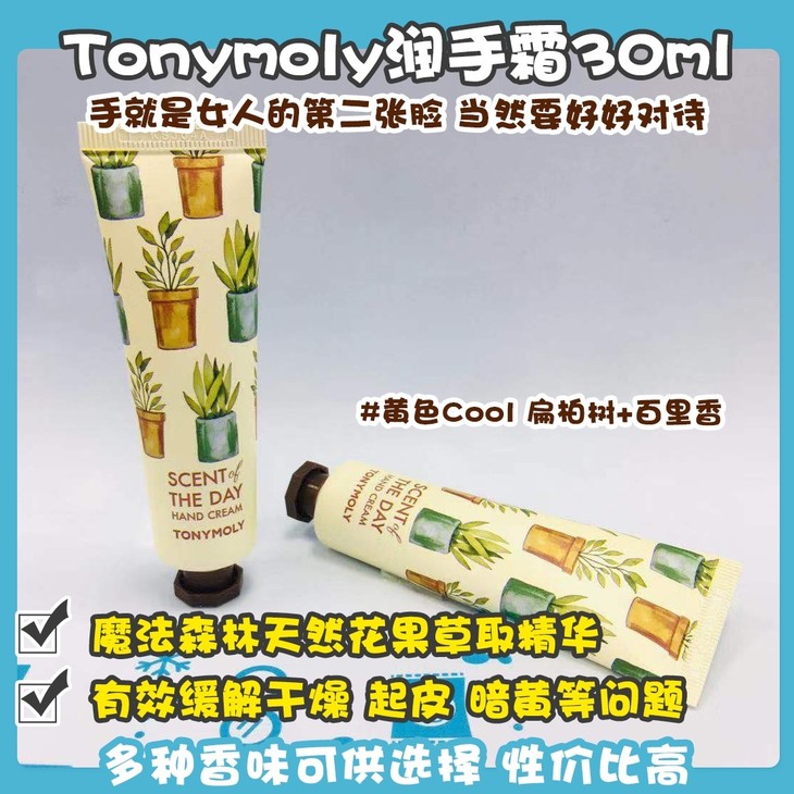 Tonymoly潤手霜30ml👍手就是女人的第二张脸,当然要好好对待🌹。魔法森林天然花果草取精华🌿,有效缓解干燥、起皮、暗黄等问题✨,加快角质层更新。加强滋润保湿💧,质地易推开,涂抹快速吸收💫,温和自然滋润双手🙌。多种香味可供选择,性价比高。 1#绿色Fresh,柠檬+柚子 (041056) 2#白色Romantic,郁金香+天竺葵 (041025) 3#蓝色Cozy,木棉 (041049) 4#粉色Sweet,水蜜桃 (041018) 5#黄色Cool,扁柏树+百里香