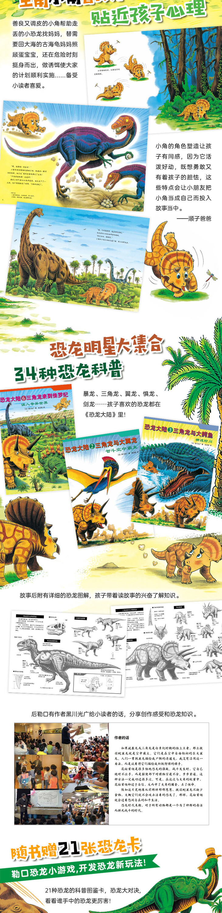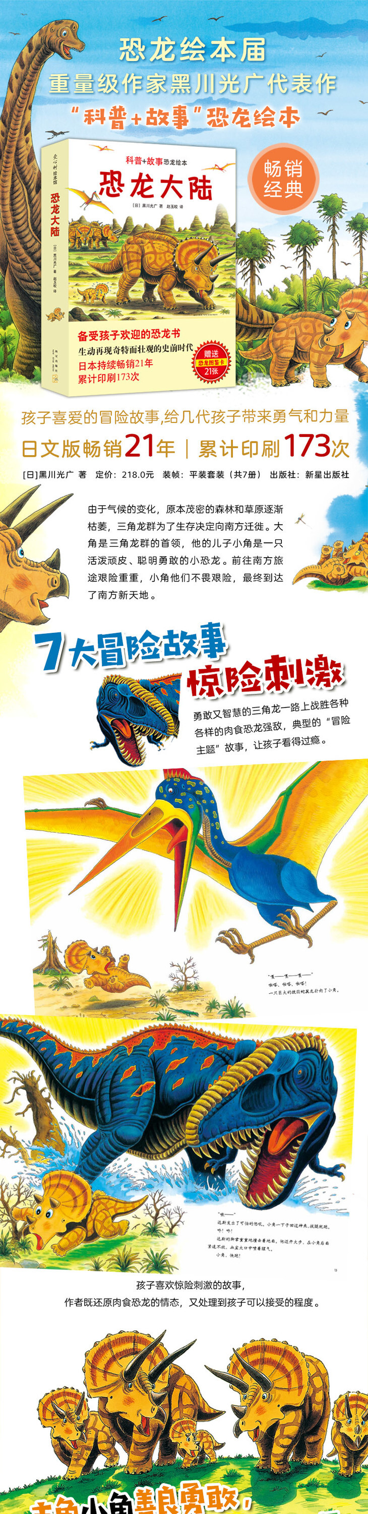 套装共7册,包括《恐龙大陆1:勇敢的三角龙》《恐龙大陆2:三角龙与大翼龙》《恐龙大陆3:三角龙与大鳄鱼》《恐龙大陆4:三角龙与暴龙》《恐龙大陆5:三角龙与大海龟》《恐龙大陆6:三角龙来到侏罗纪》《恐龙大陆7:三角龙的大决战》。