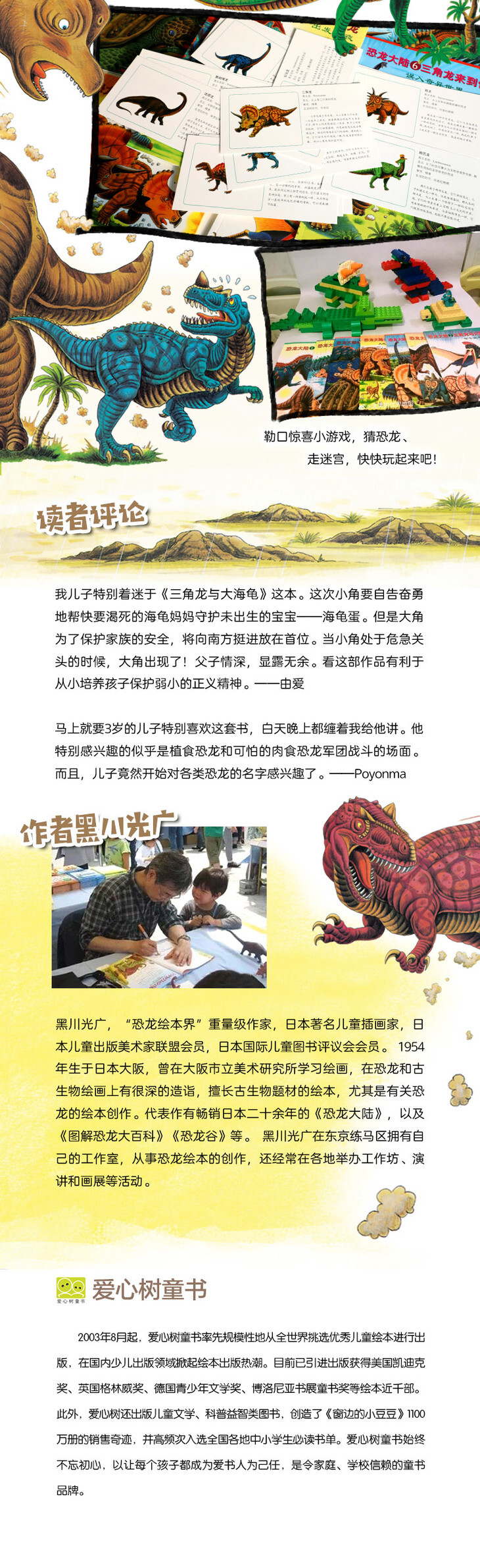 黑川光广,“恐龙绘本界”重量级作家,日本儿童插画家,日本儿童出版美术家联盟会员,日本***儿童图书评议会会员。 1954年生于日本大阪,曾在大阪市立美术研究所学习绘画,在恐龙和古生物绘画上有很深的造诣,擅长古生物题材的绘本,尤其是有关恐龙的绘本创作。代表作有畅销日本二十余年的《恐龙大陆》,以及《图解恐龙大百科》《恐龙谷》等。 黑川光广在东京练马区拥有自己的工作室,从事恐龙绘本的创作,还经常在各地举办工作坊、演讲和画展等活动。