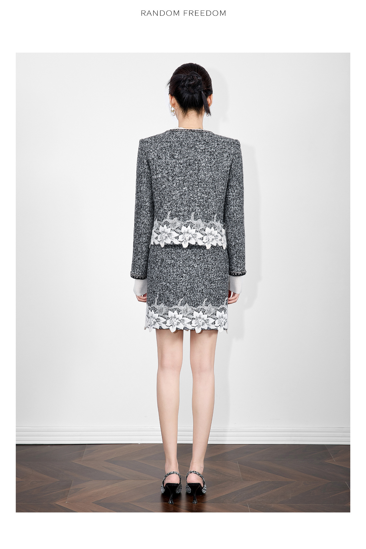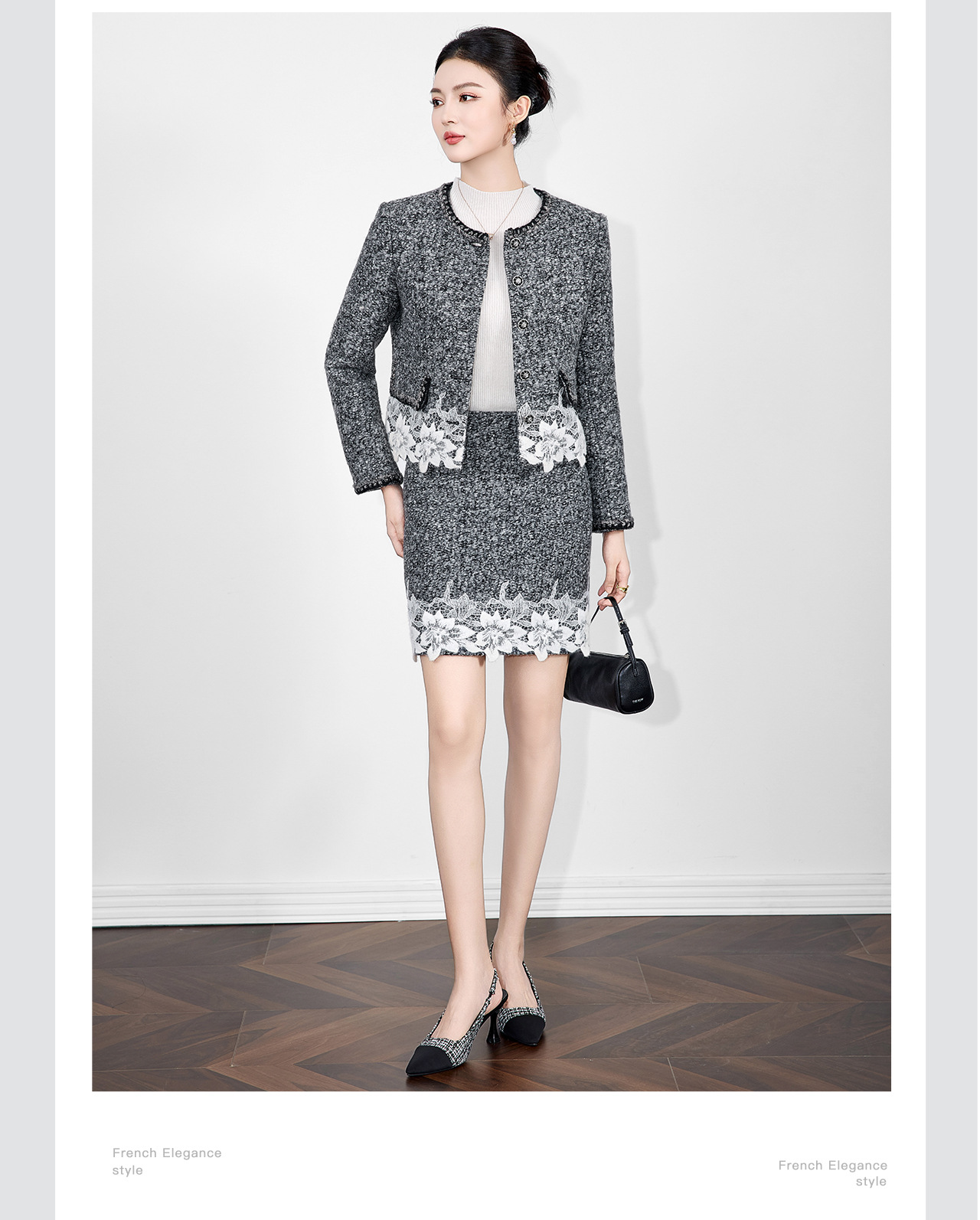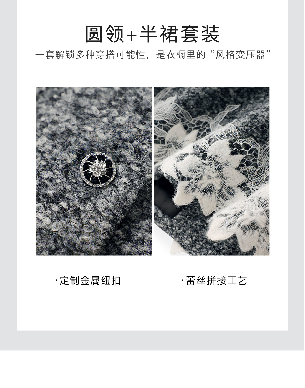 「高货wl」全新升级【铂金会员441/天猫599/差价158】(99051)洛诗琳2025冬季羊毛混纺蕾丝拼接小香风外套半身裙两件套