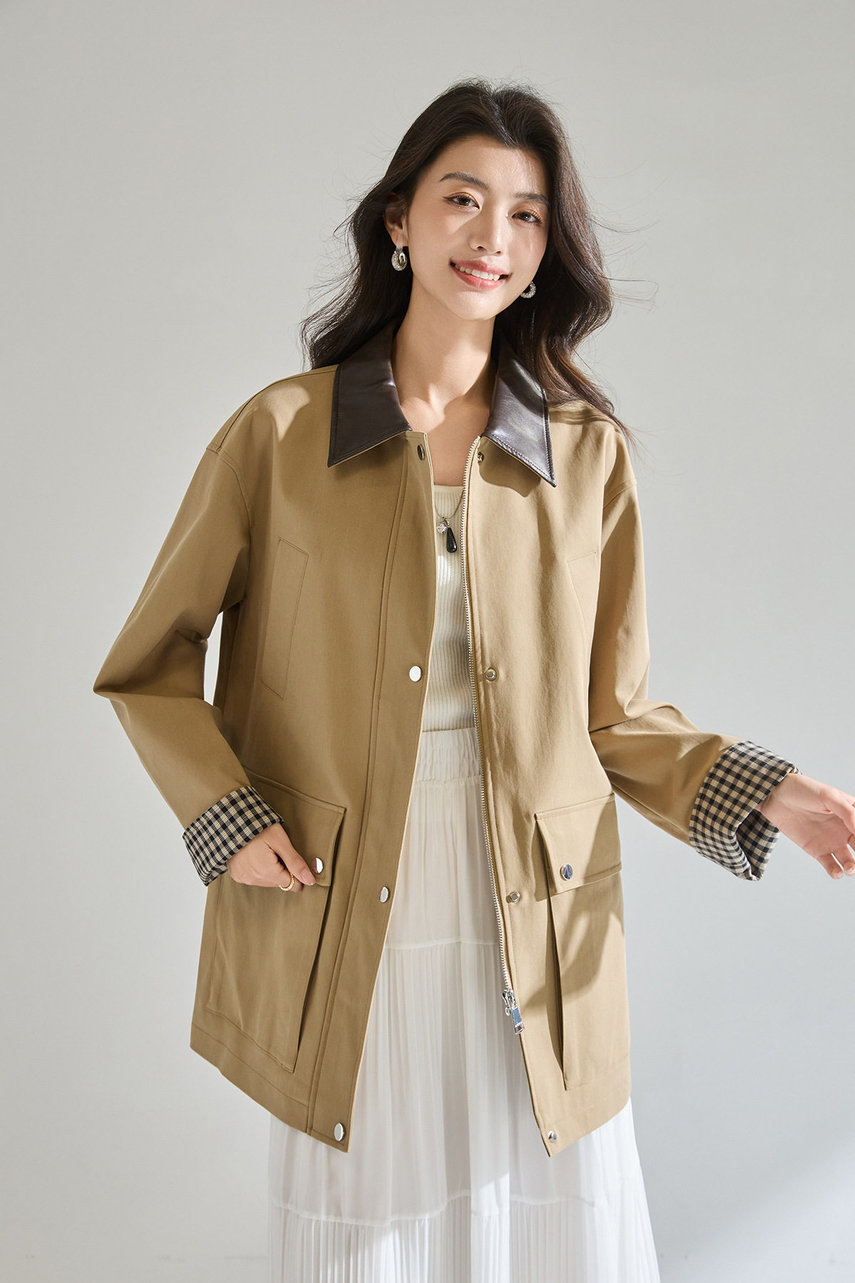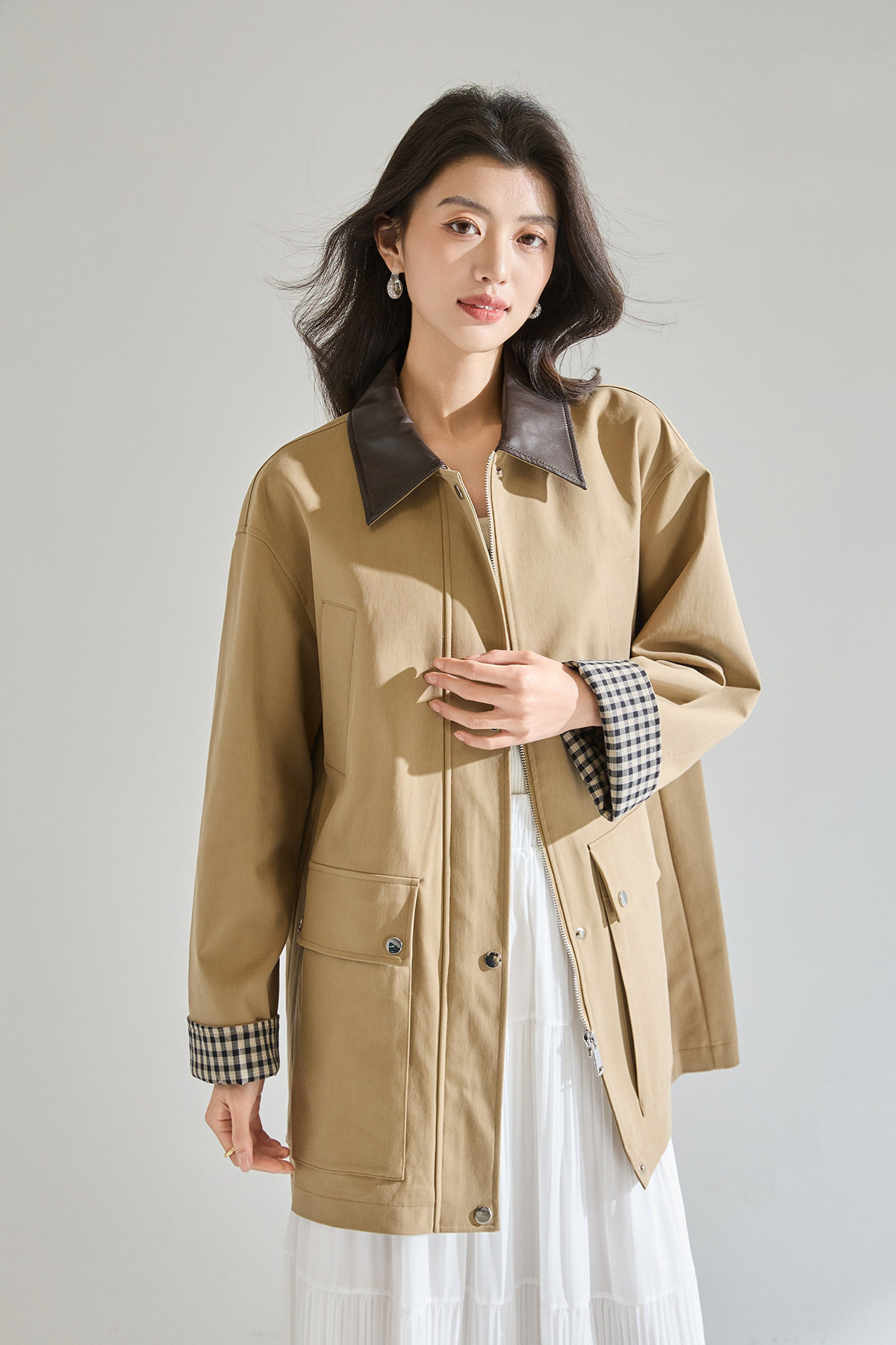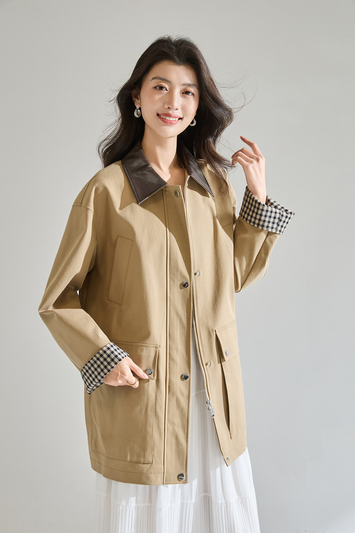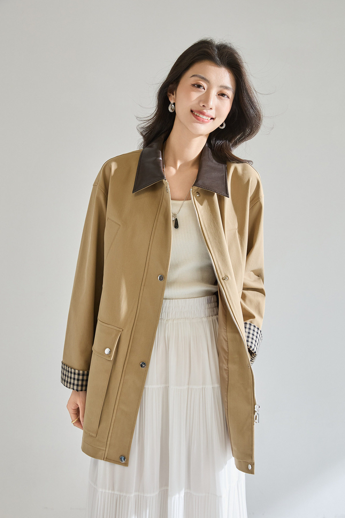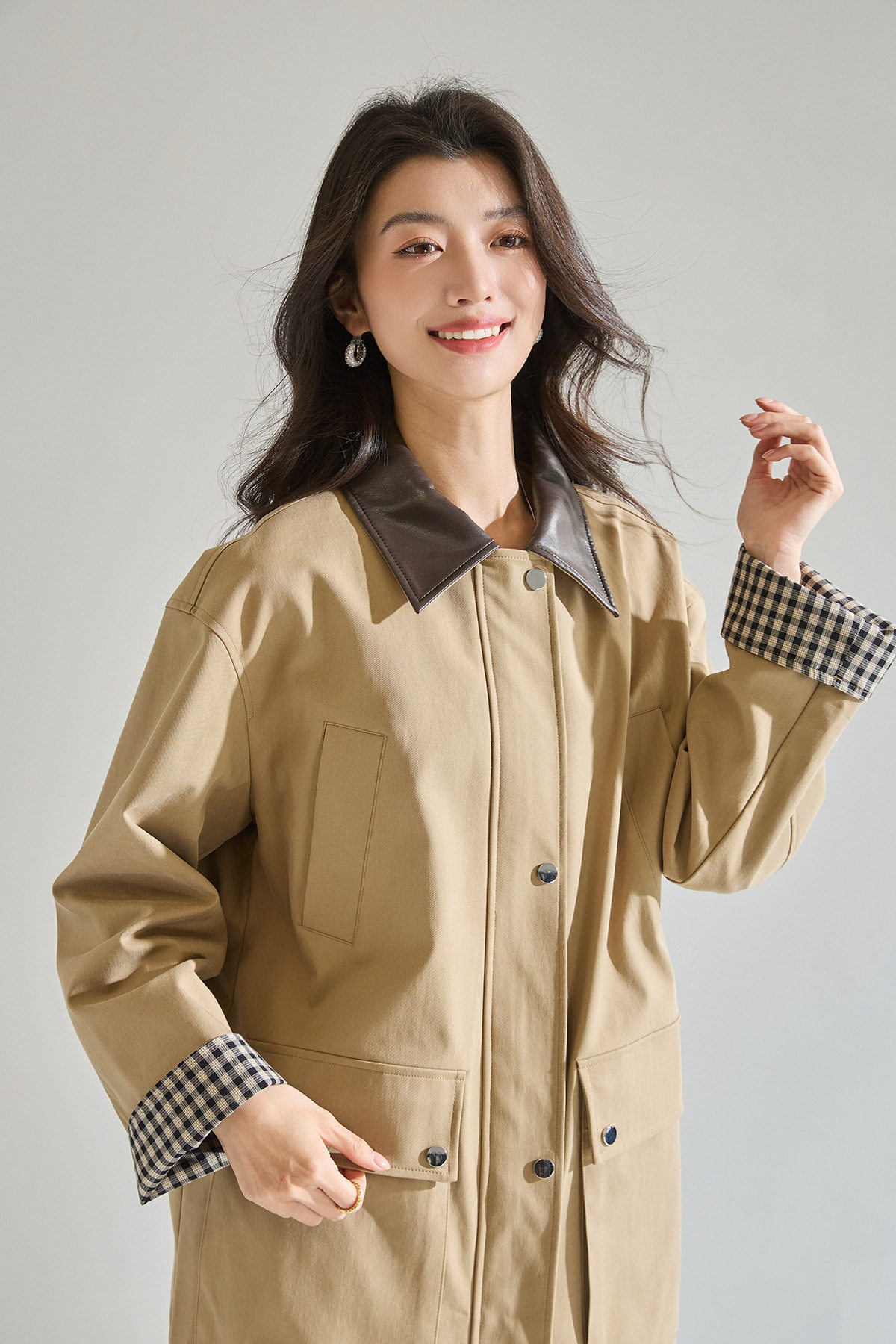 「高货sh」全新升级【铂金会员404/天猫549/差价145】(95550)洛诗琳2026春季气质巴恩风撞色PU皮翻领格纹拼接风衣外套