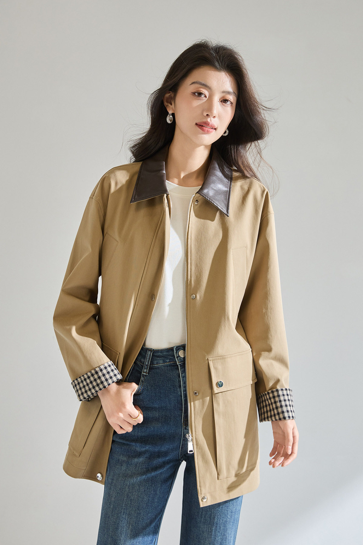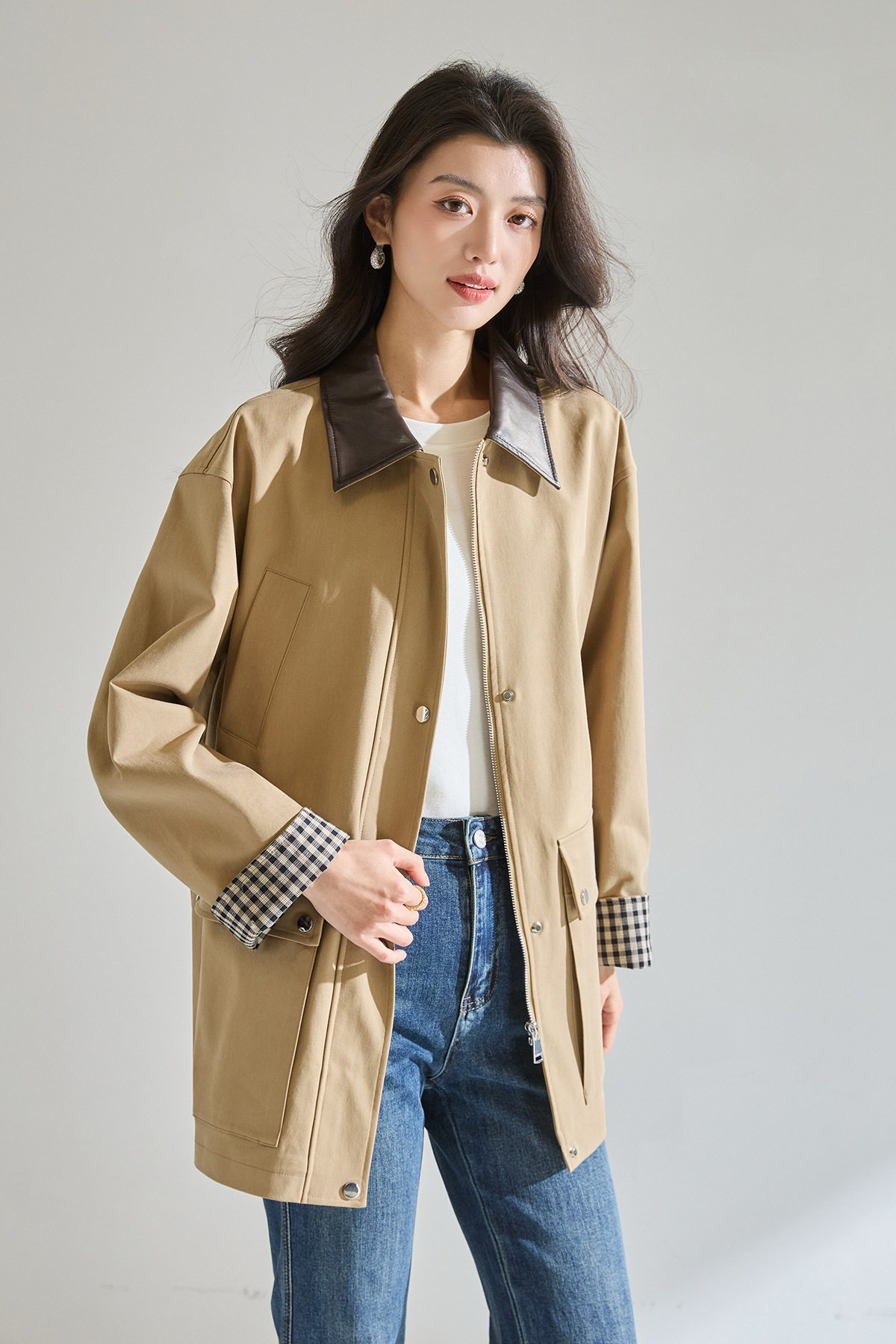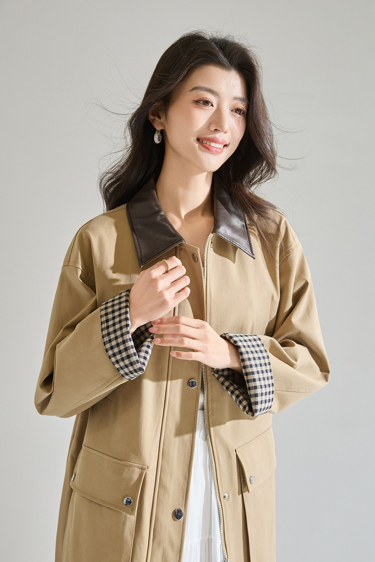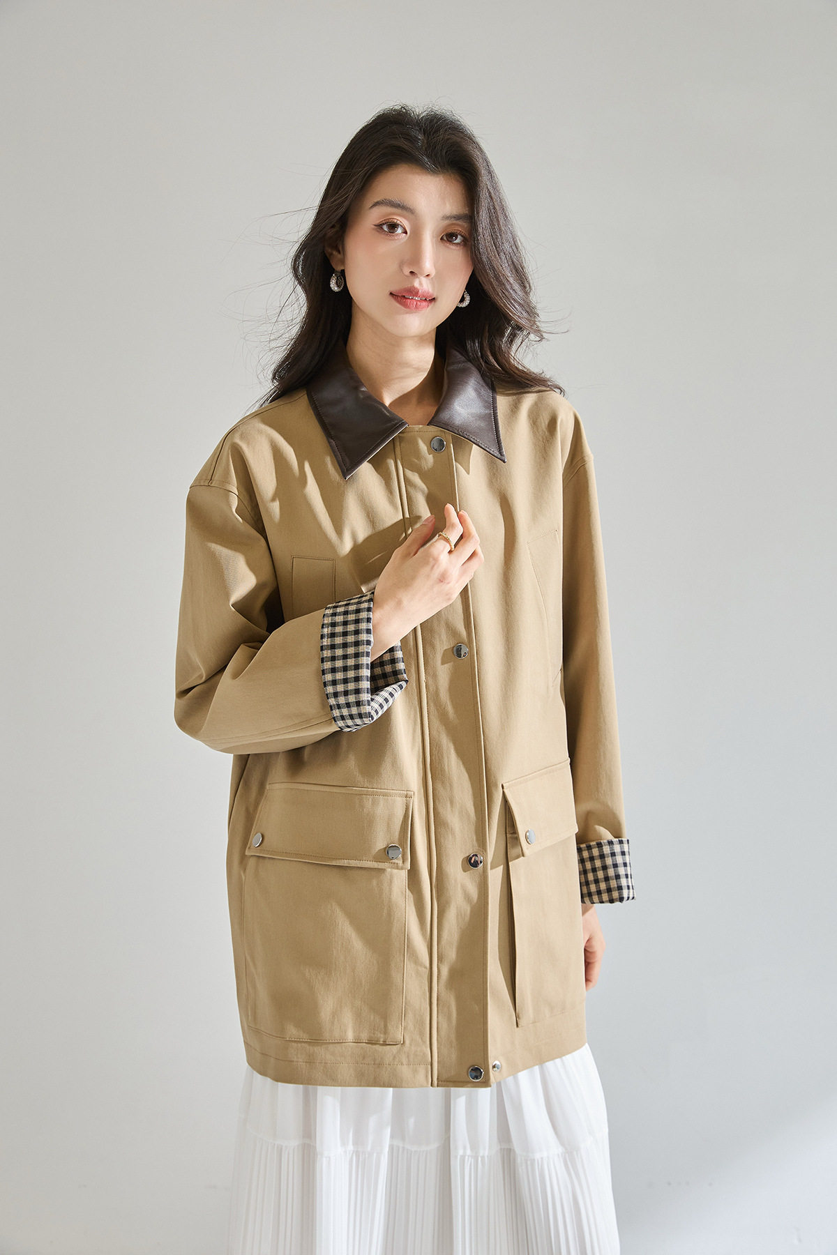 「高货sh」全新升级【铂金会员404/天猫549/差价145】(95550)洛诗琳2026春季气质巴恩风撞色PU皮翻领格纹拼接风衣外套
