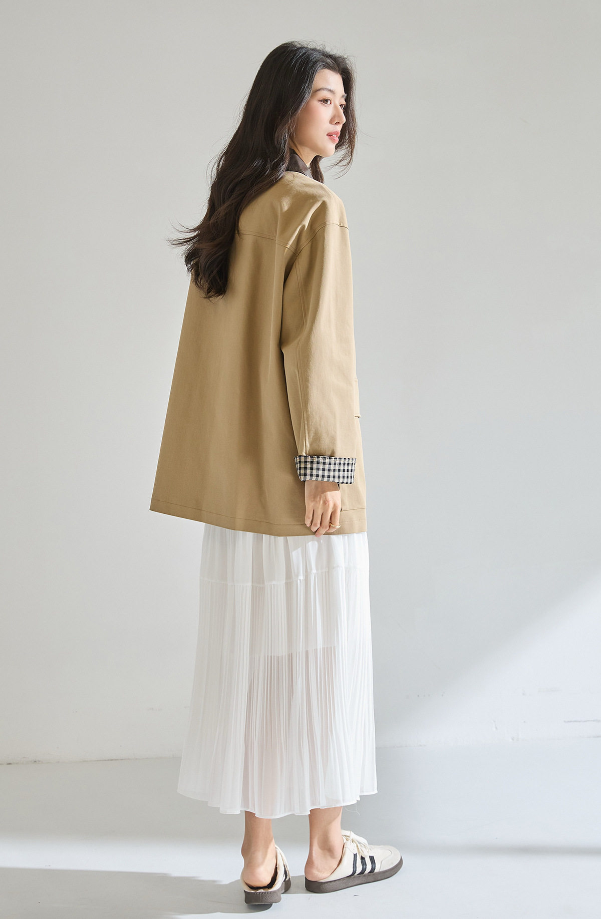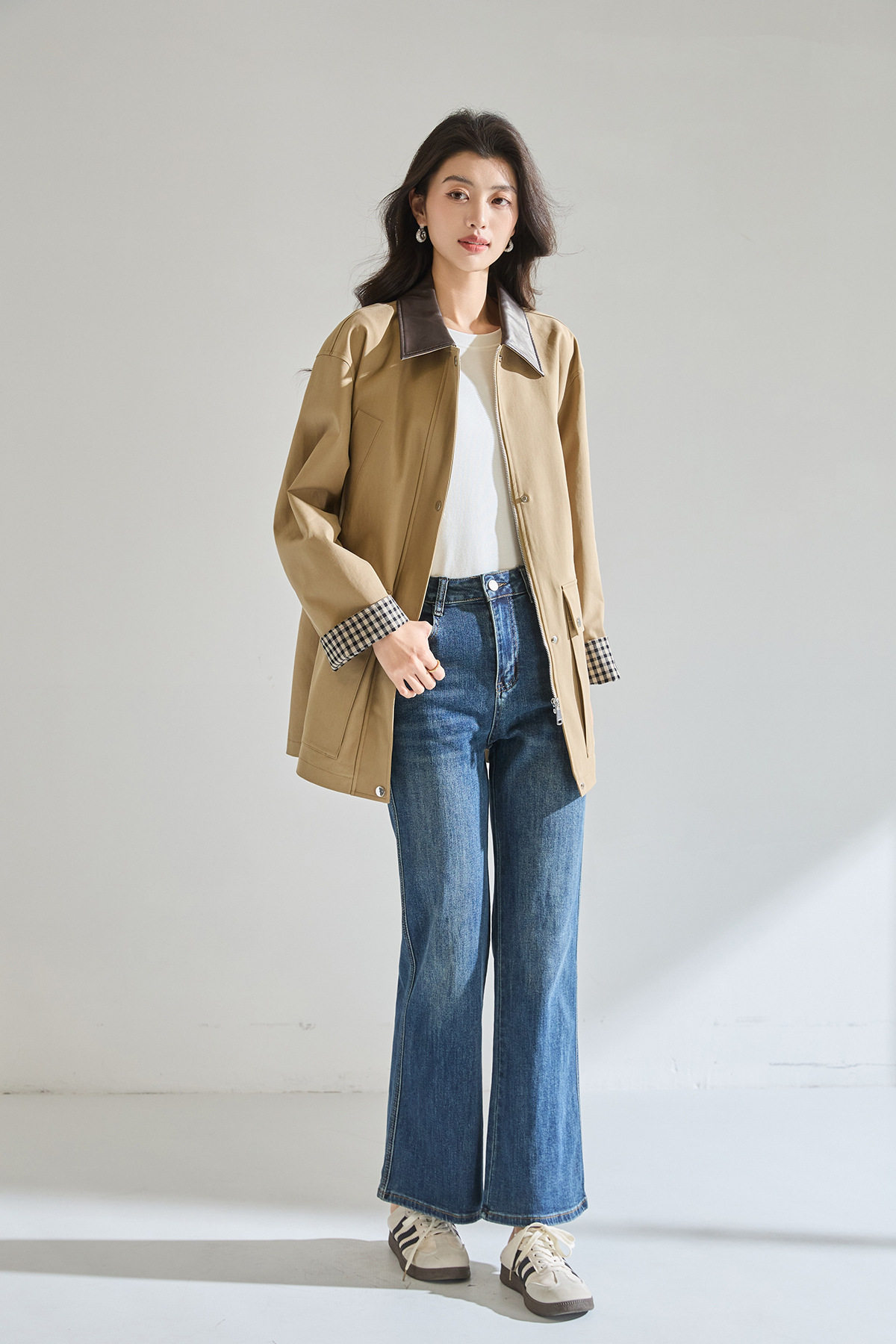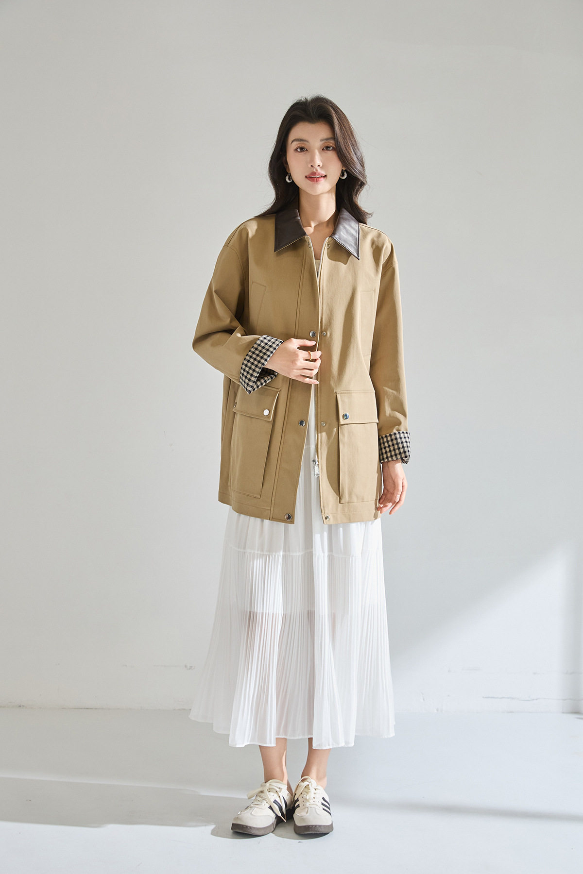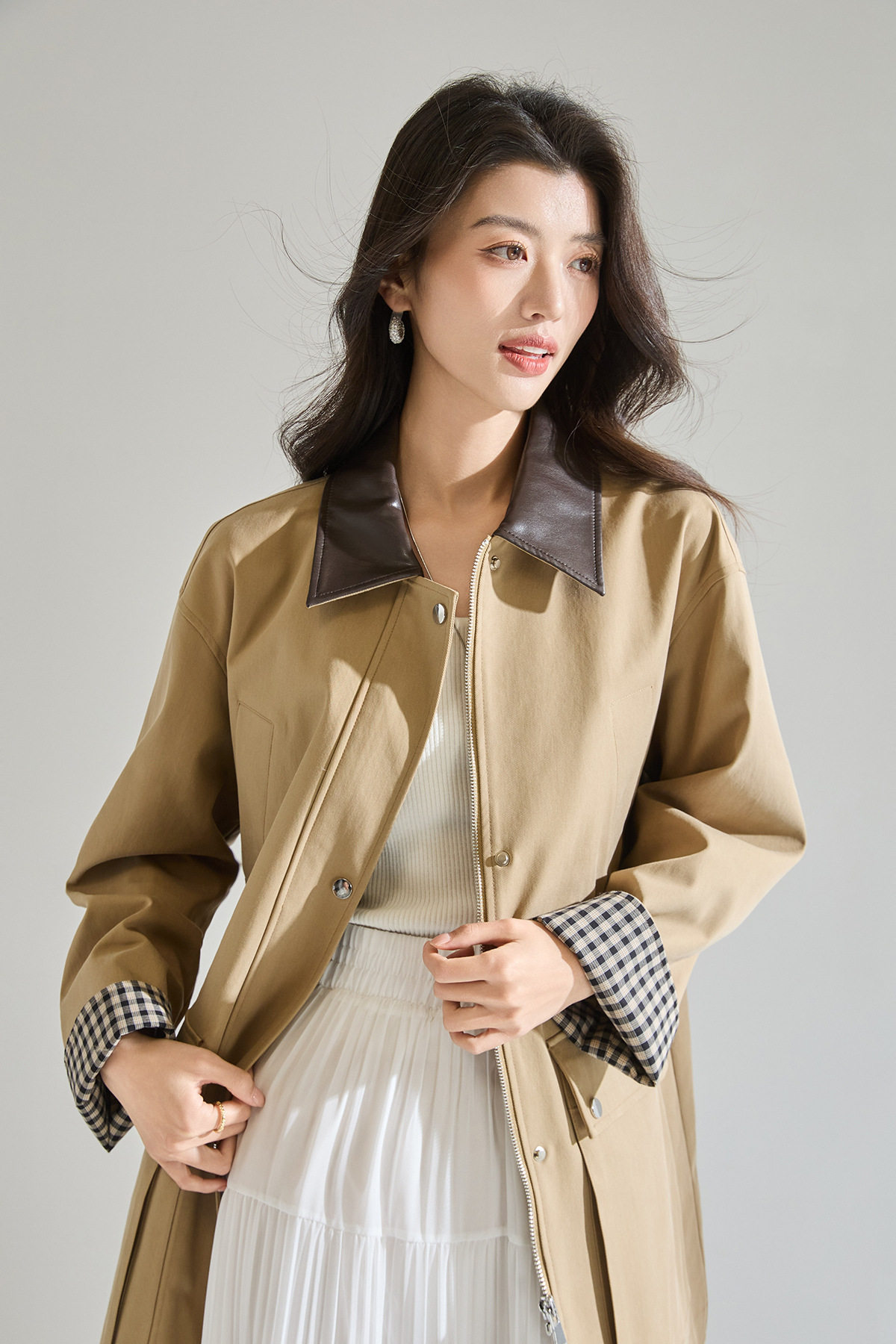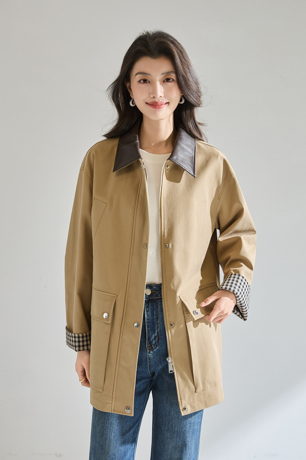 「高货sh」全新升级【铂金会员404/天猫549/差价145】(95550)洛诗琳2026春季气质巴恩风撞色PU皮翻领格纹拼接风衣外套