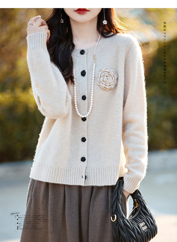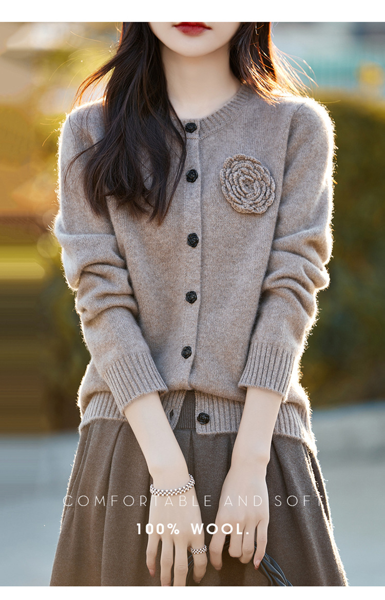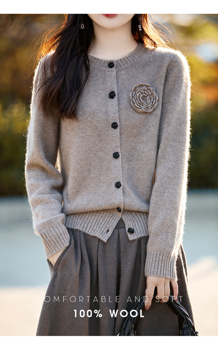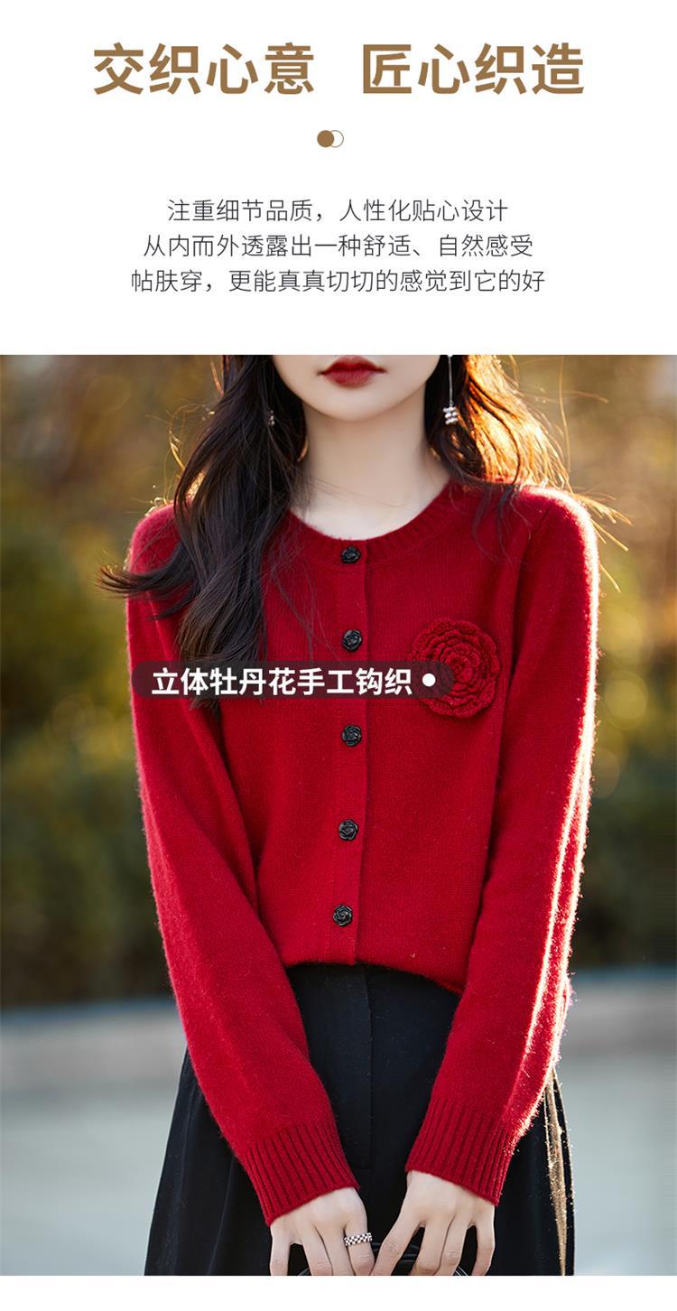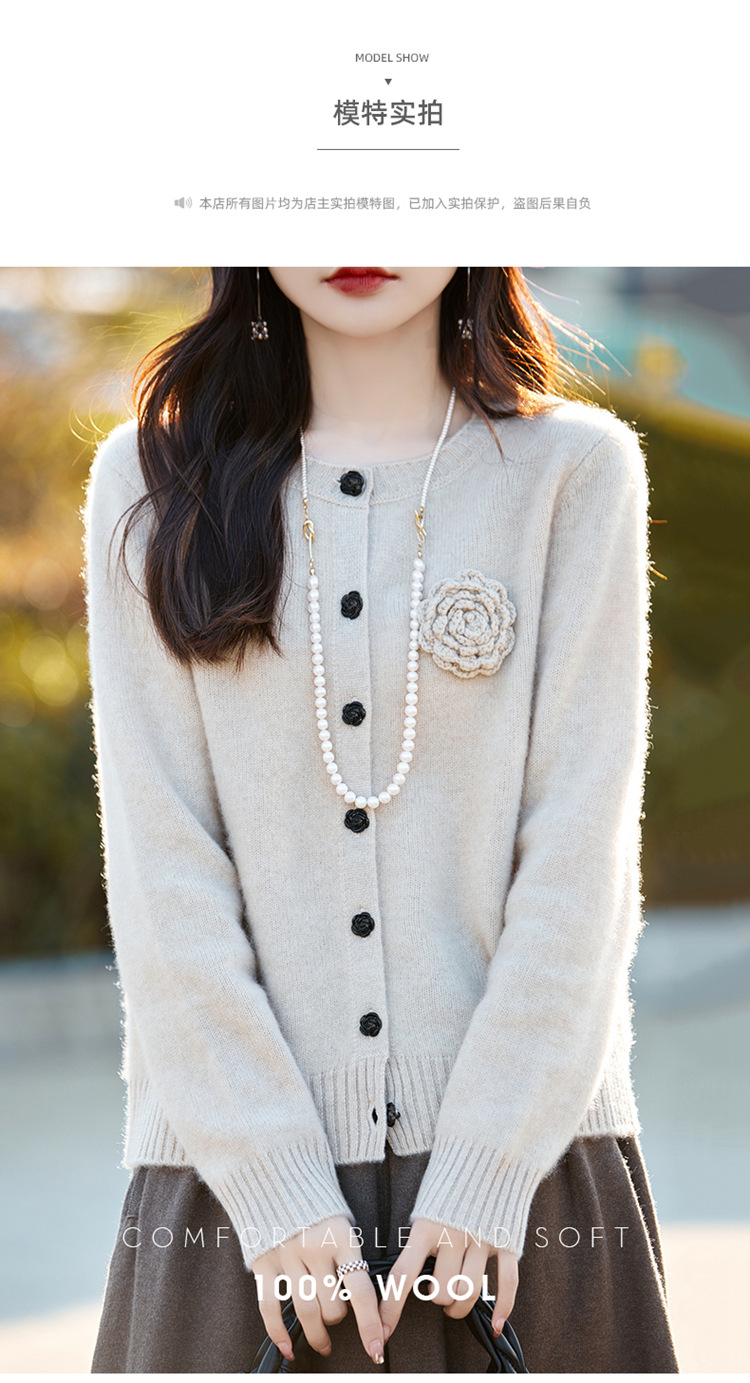 丁摩 100纯羊毛开衫女圆领重工钩花针织衫外套NS-3178