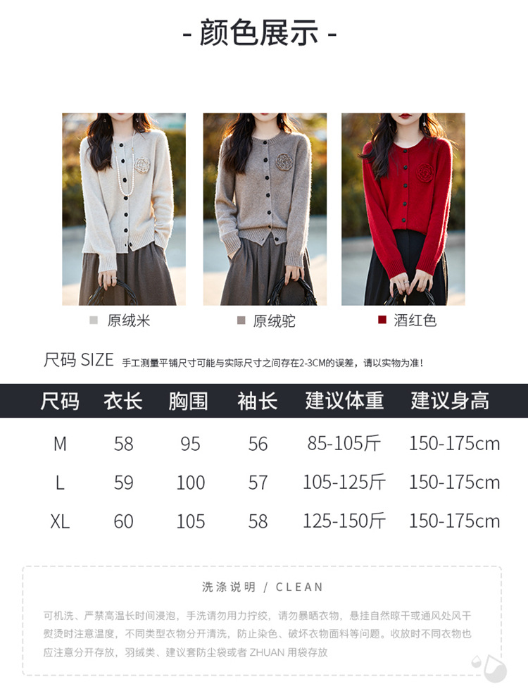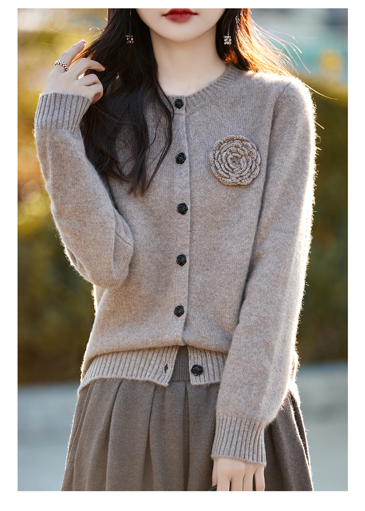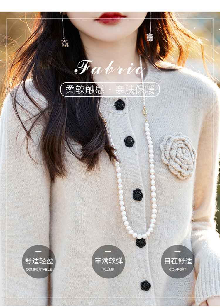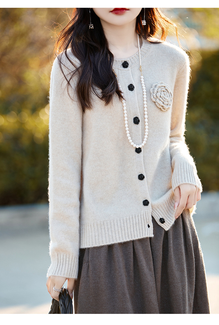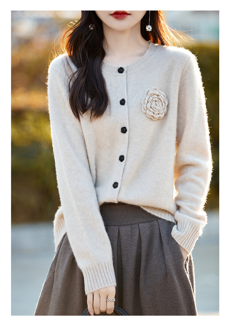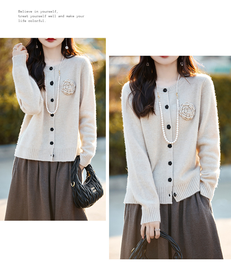 丁摩 100纯羊毛开衫女圆领重工钩花针织衫外套NS-3178