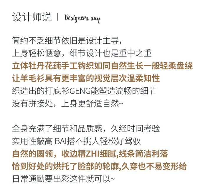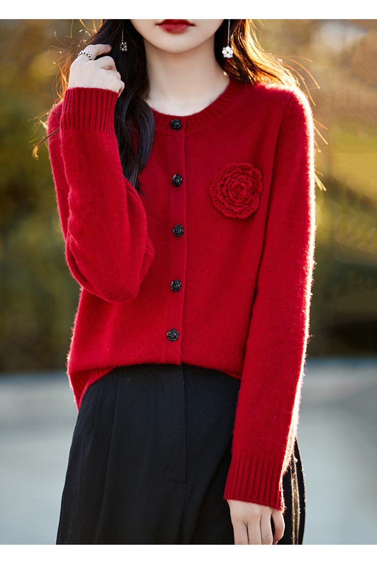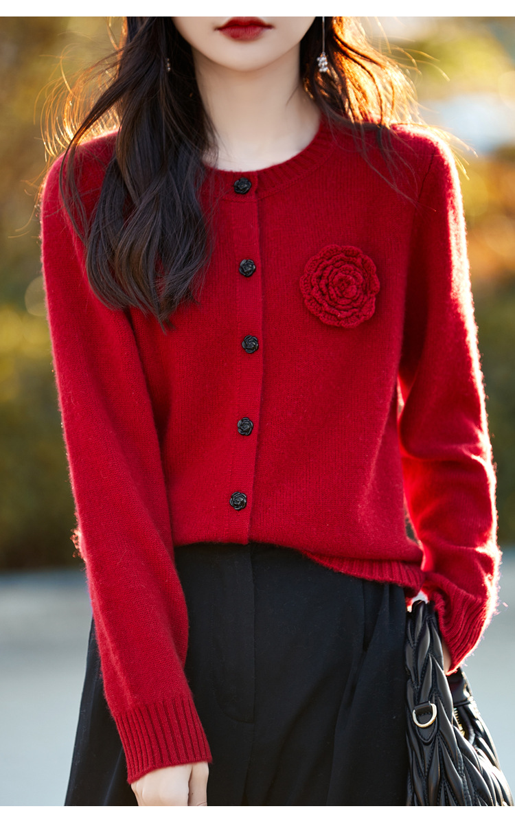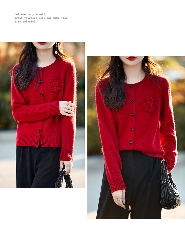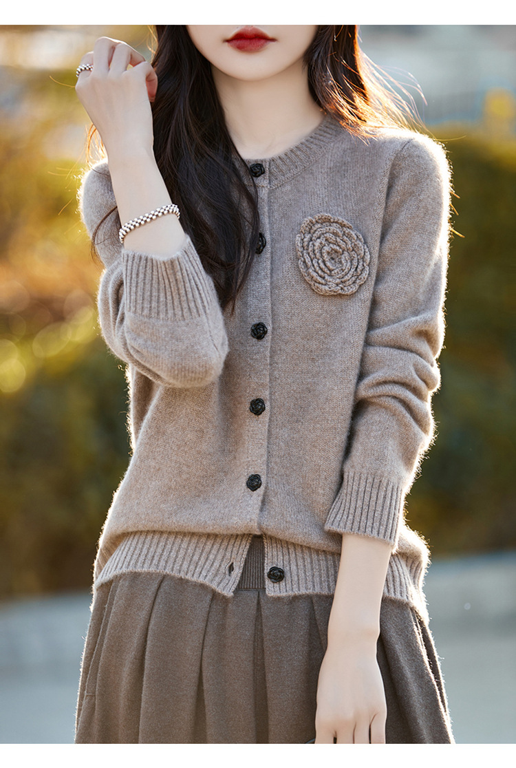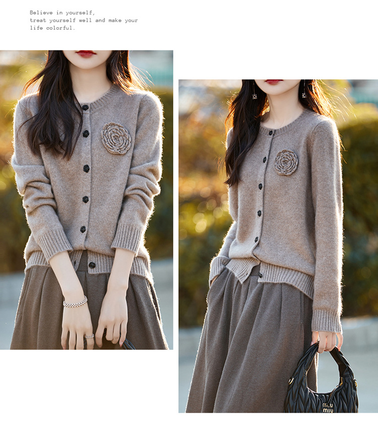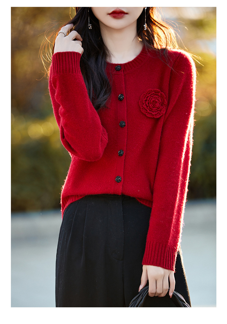 丁摩 100纯羊毛开衫女圆领重工钩花针织衫外套NS-3178