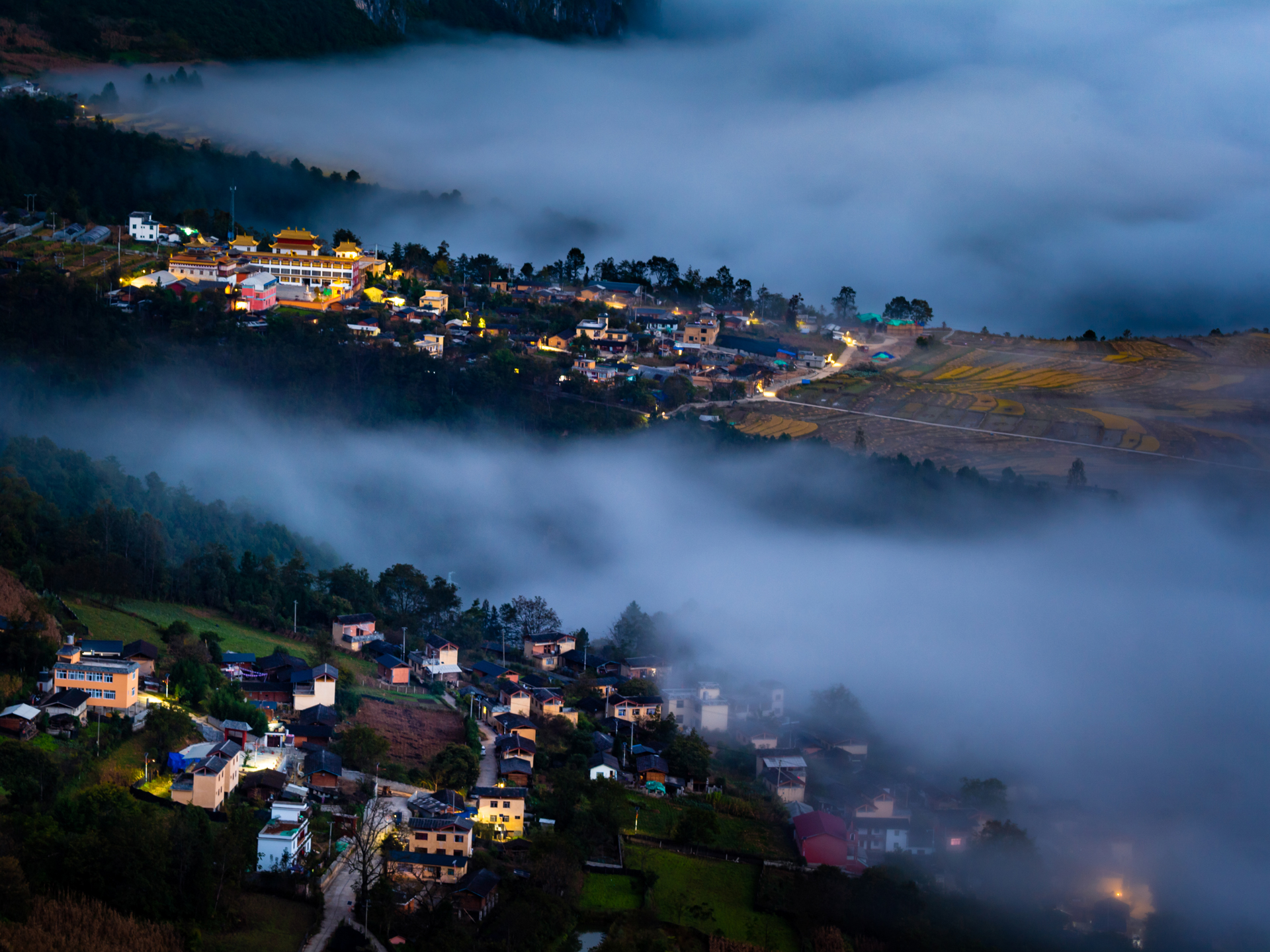 清晨拍摄丙中洛的晨雾,石门关全景;碧落雪山日出,雾里村、秋那桶拍摄人文创作、茶马古道遗址拍摄。下午前往普化寺拍摄人文、雪山及田园风光。