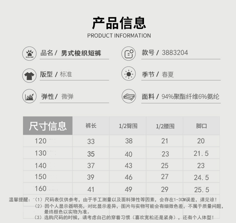 KELME卡尔美夏季男儿童足球运动短裤跑步健身训练速干透气五分裤