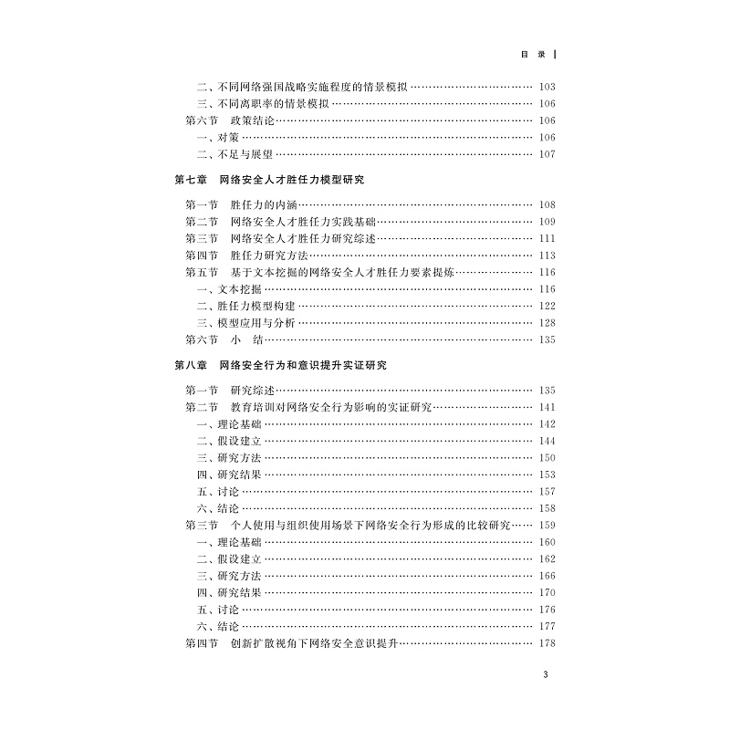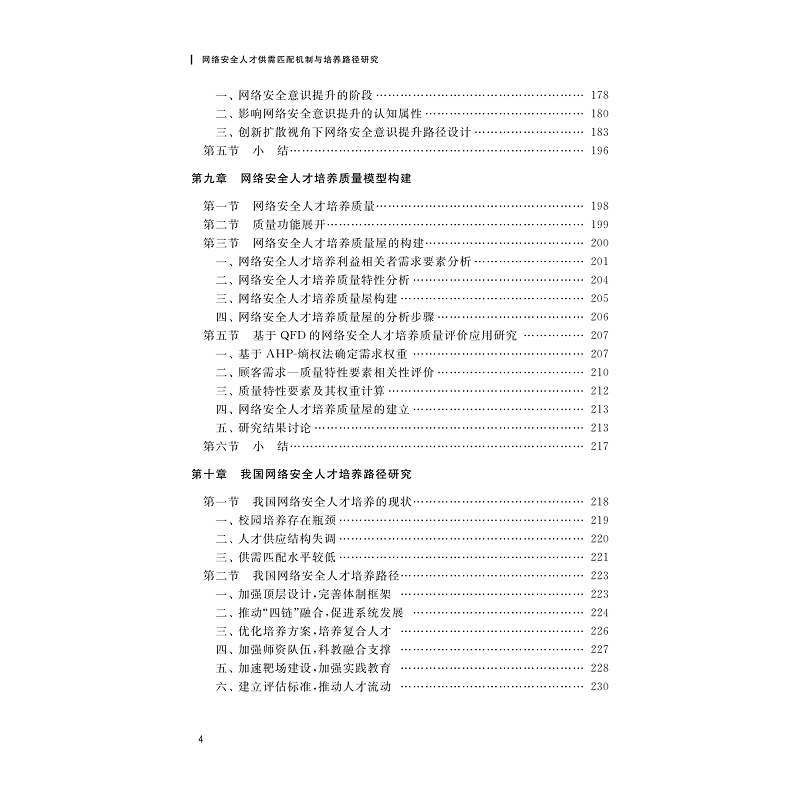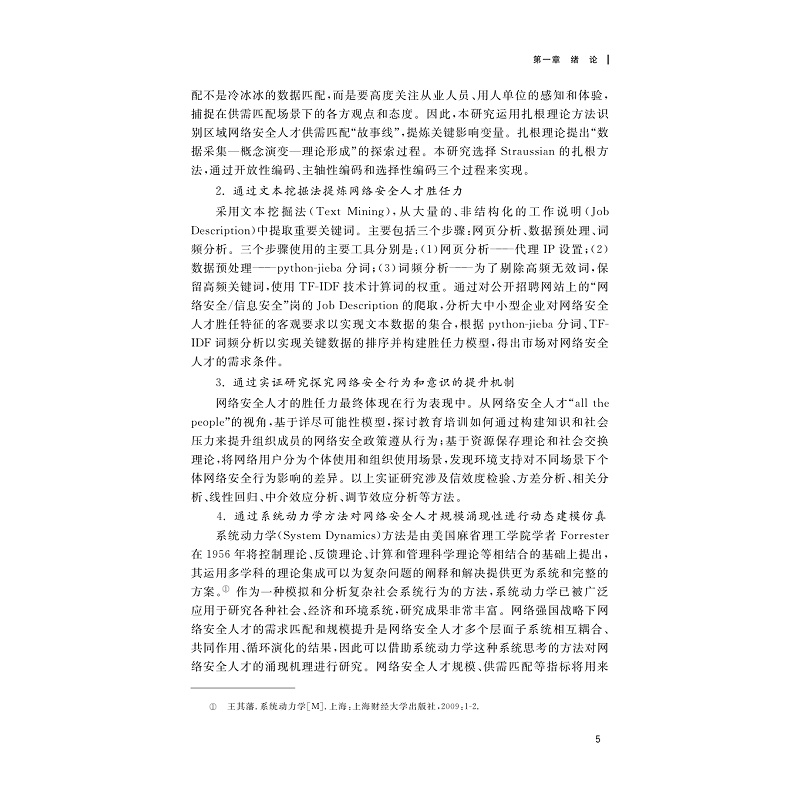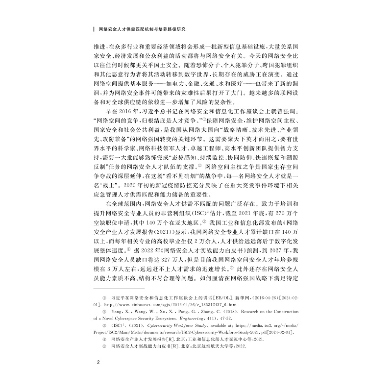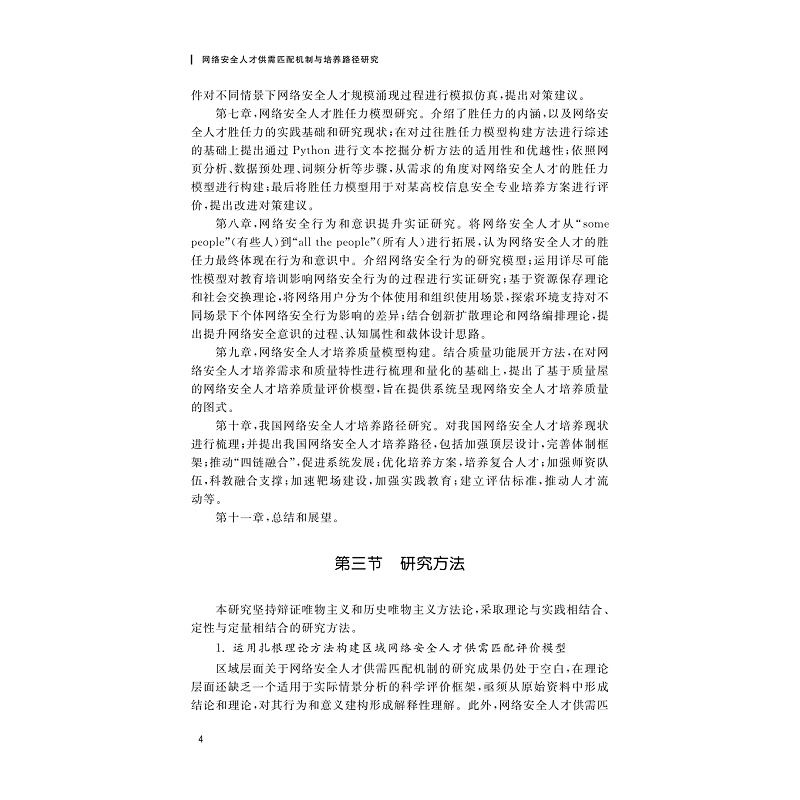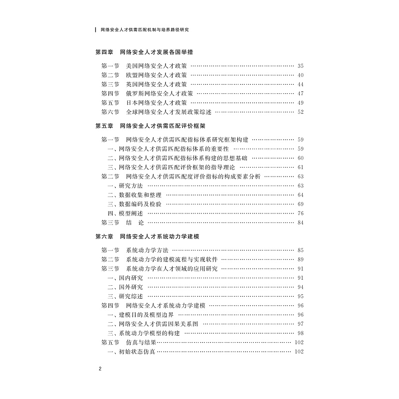 国家社科基金项目成果。本书介绍了网络安全人才、宏观人才管理等概念,并提出网络安全人才宏观管理的核心问题是供需匹配;介绍理论基础,如人力资本理论、新增长理论、人力资源规划理论、人-环境匹配理论等。采用科学文献计量方法,对网络安全人才研究领域的文献进行作者、机构、国家、关键词等方面可视化分析,归纳环境基础、发展规划、人才开发、人才流动、匹配效果等5个主范畴,构建区域网络安全人才供需匹配形成的“故事线”,并进行详细阐释。运用Vensim软件对不同情景下的网络安全人才涌现形态进行模拟仿真,提出对策建议,提出我国网络安全人才培养路径,包括加强顶层设计,完善体制框架。