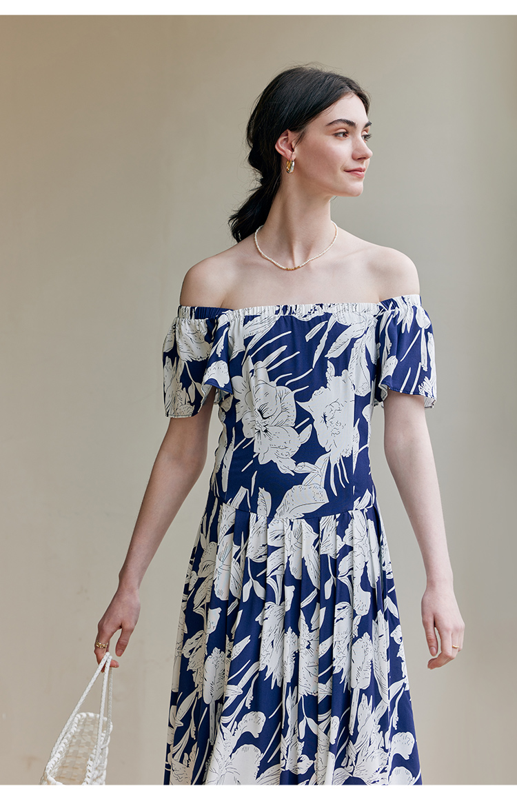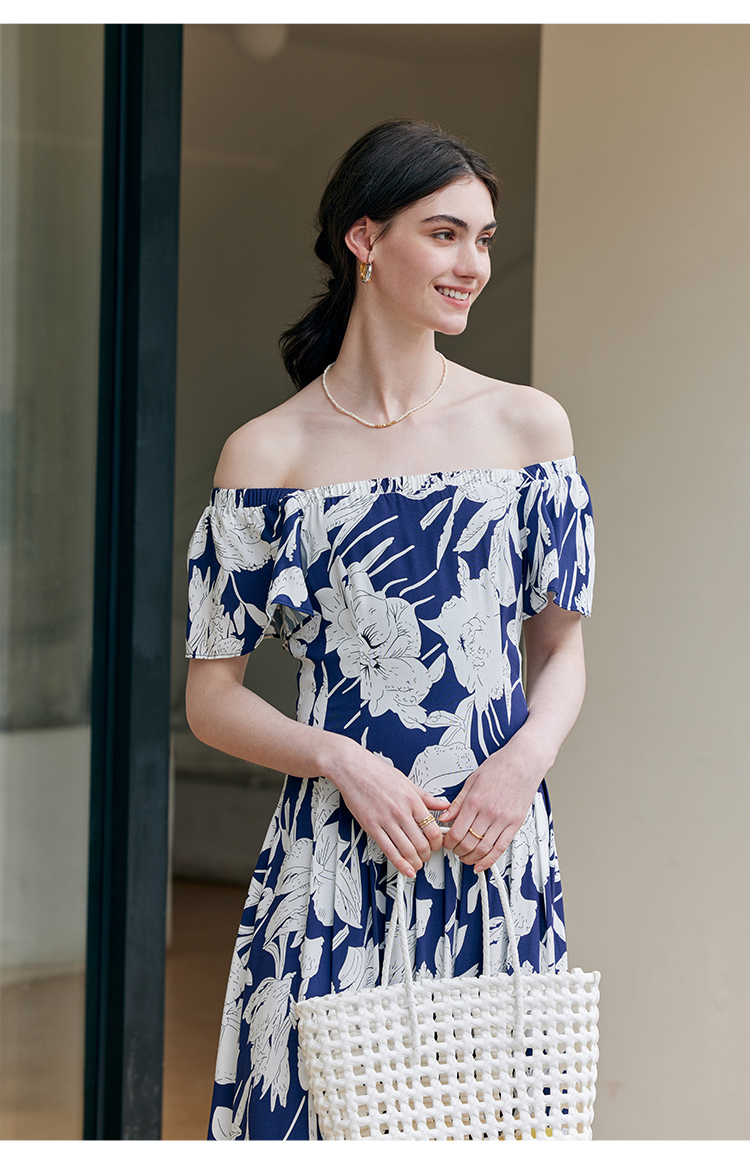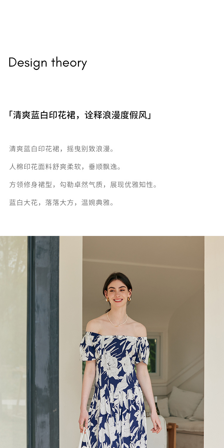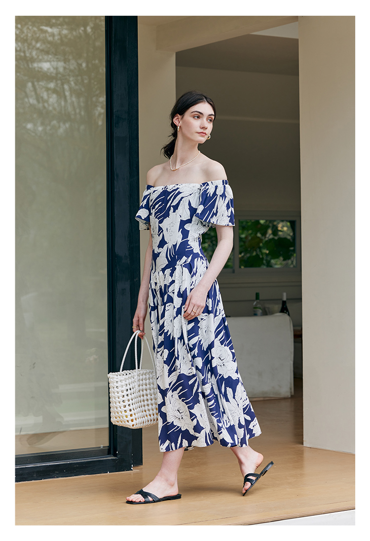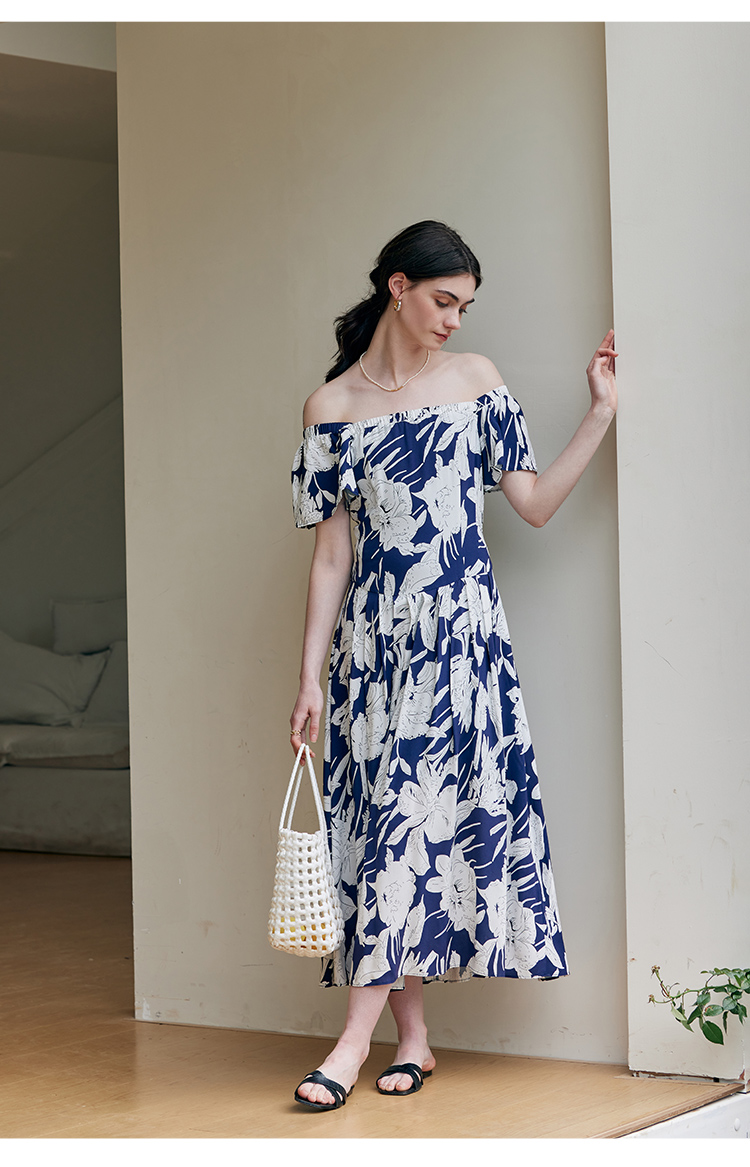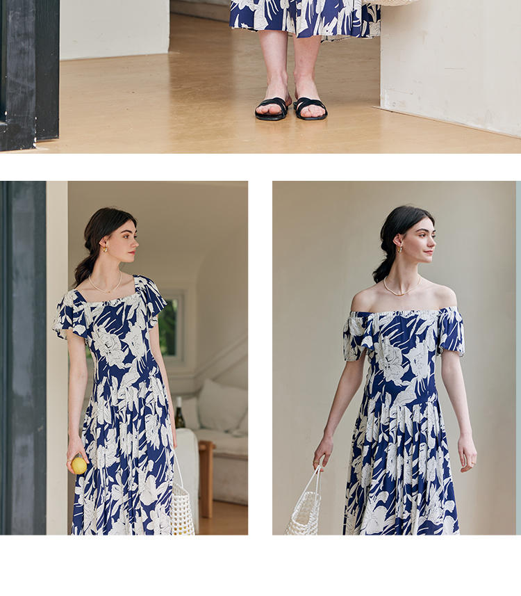 【周四精选福利】HeyDress法式印花连衣裙女夏季复古收腰度假风浪漫气质一字领裙子