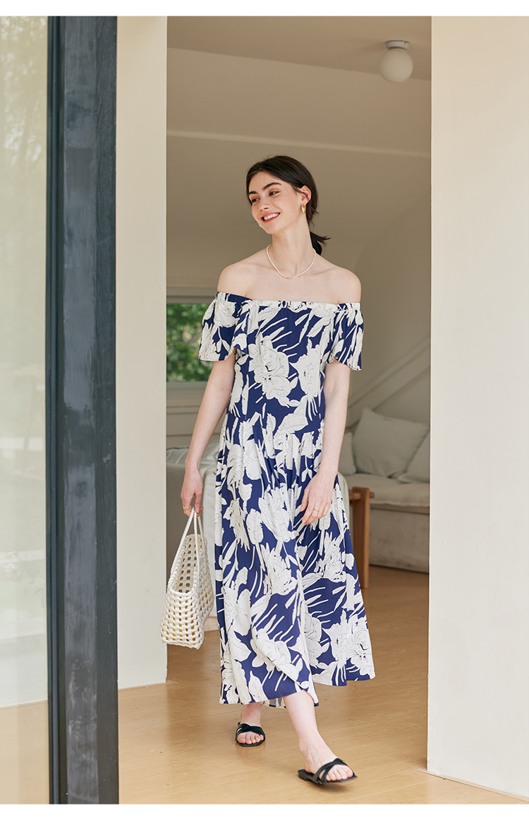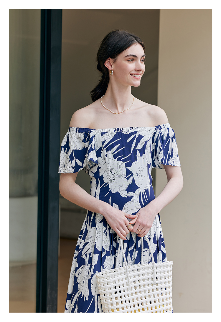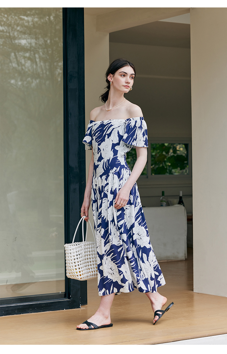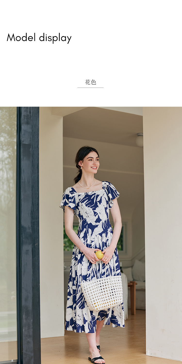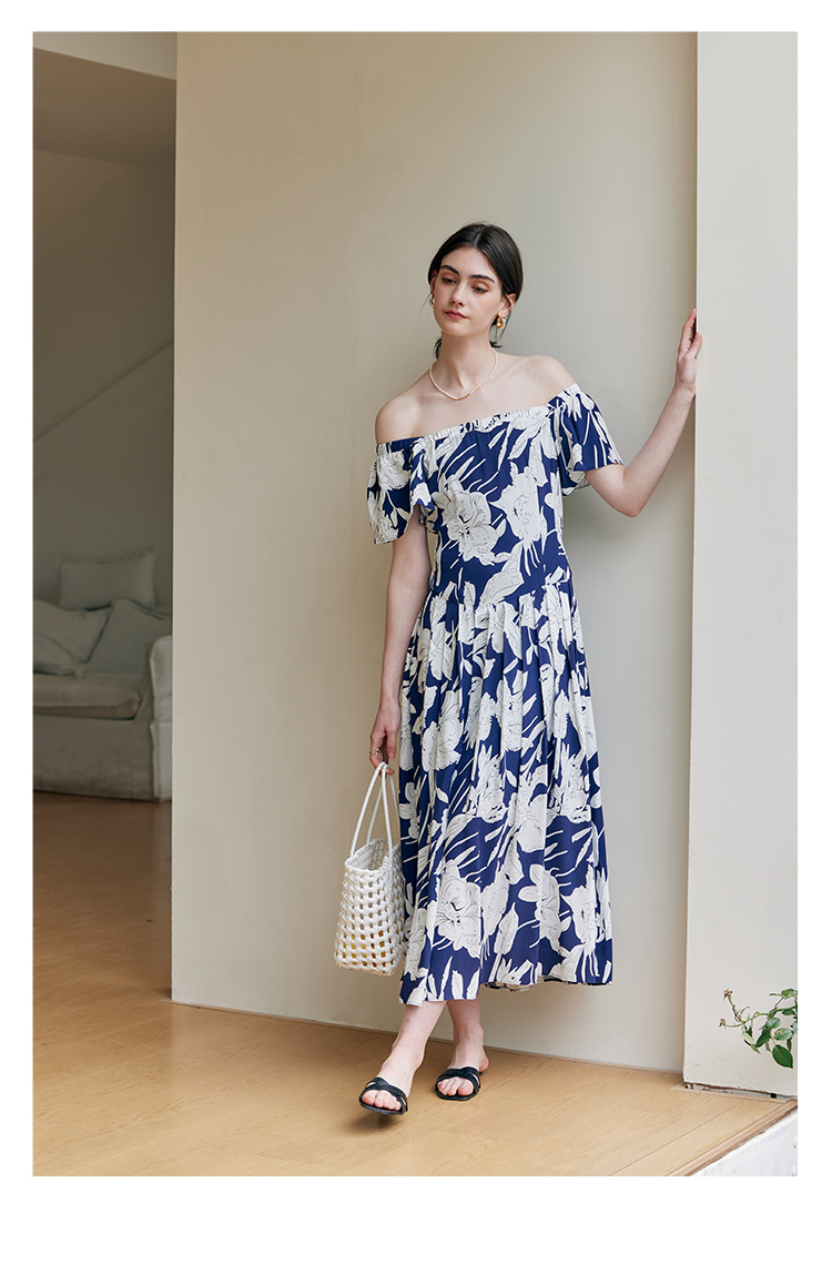 【周四精选福利】HeyDress法式印花连衣裙女夏季复古收腰度假风浪漫气质一字领裙子
