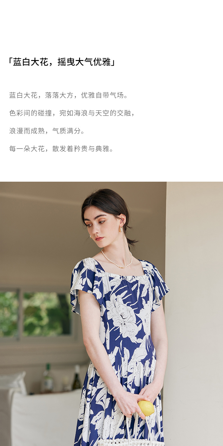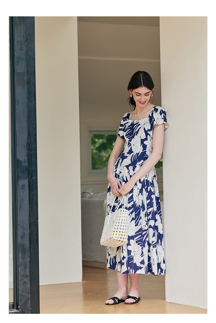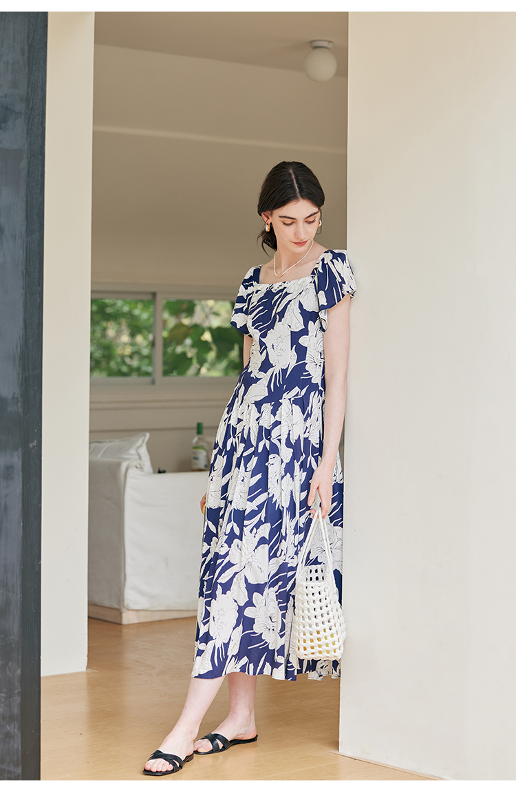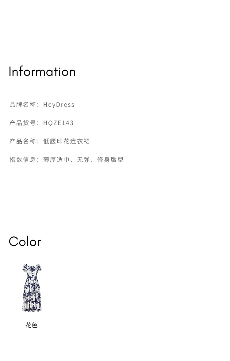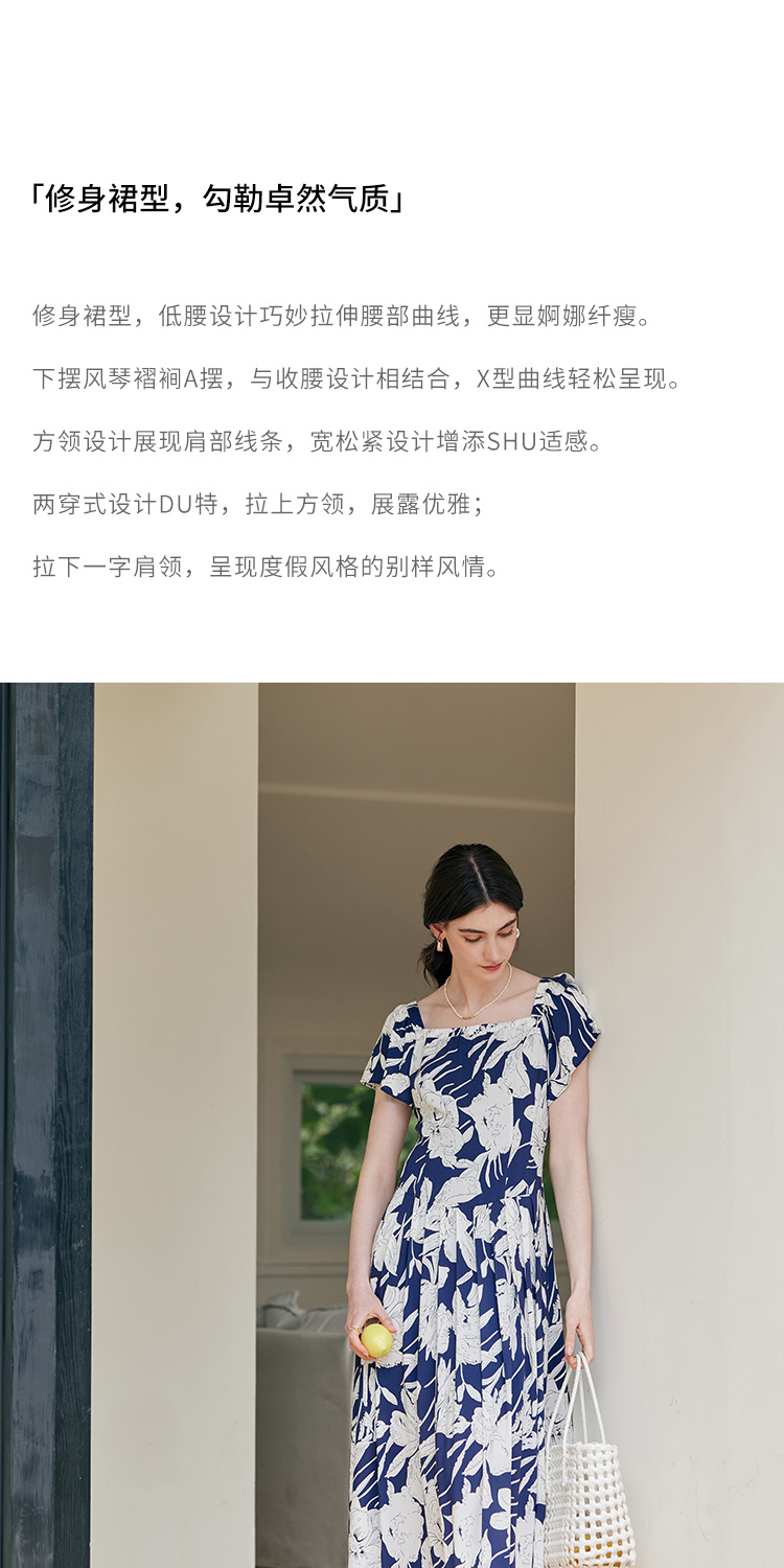 【周四精选福利】HeyDress法式印花连衣裙女夏季复古收腰度假风浪漫气质一字领裙子