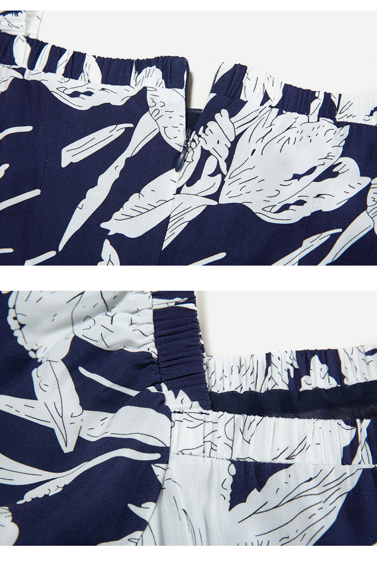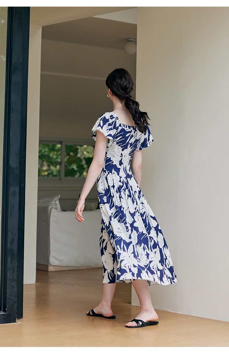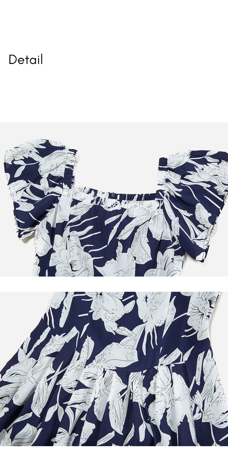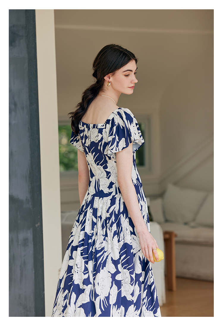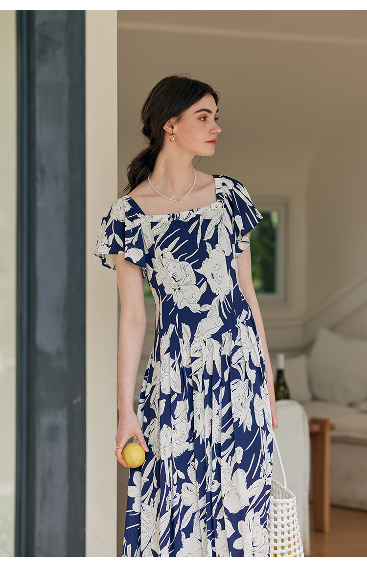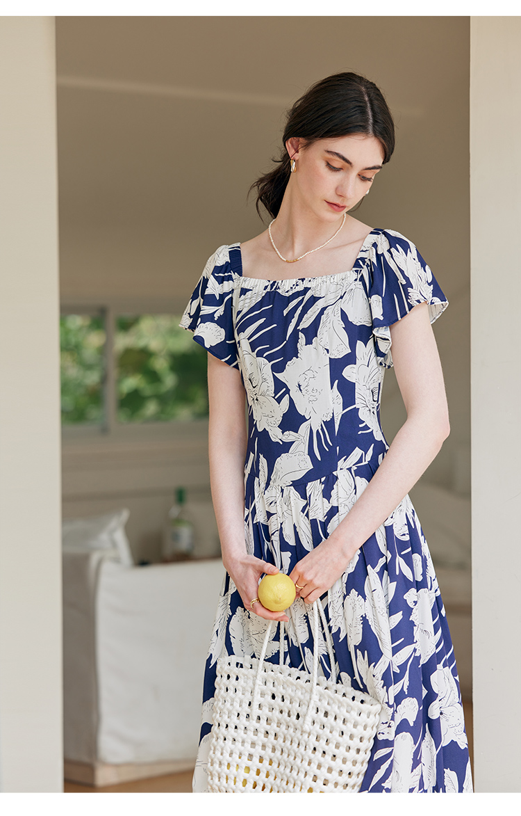 【周四精选福利】HeyDress法式印花连衣裙女夏季复古收腰度假风浪漫气质一字领裙子