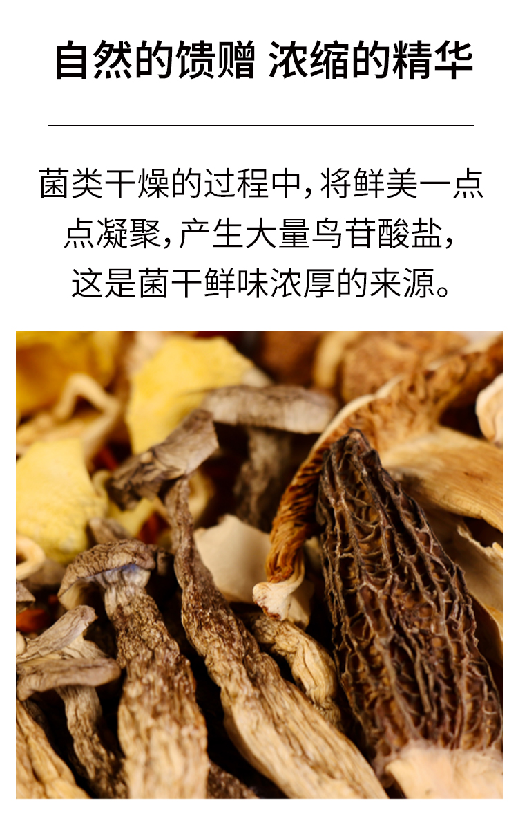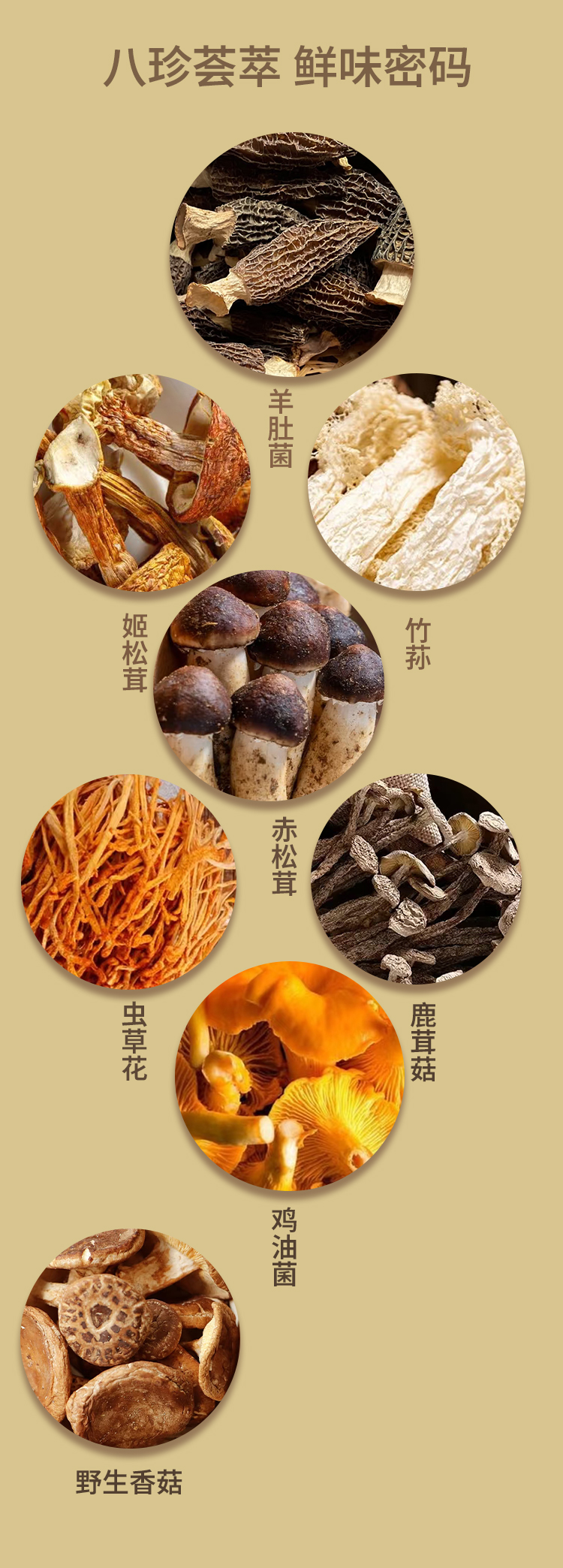 【配料表】羊肚菌,竹荪 野生香菇 ,赤松茸,鹿茸菇,姬松茸,虫草花,鸡油菌,大枣,枸杞