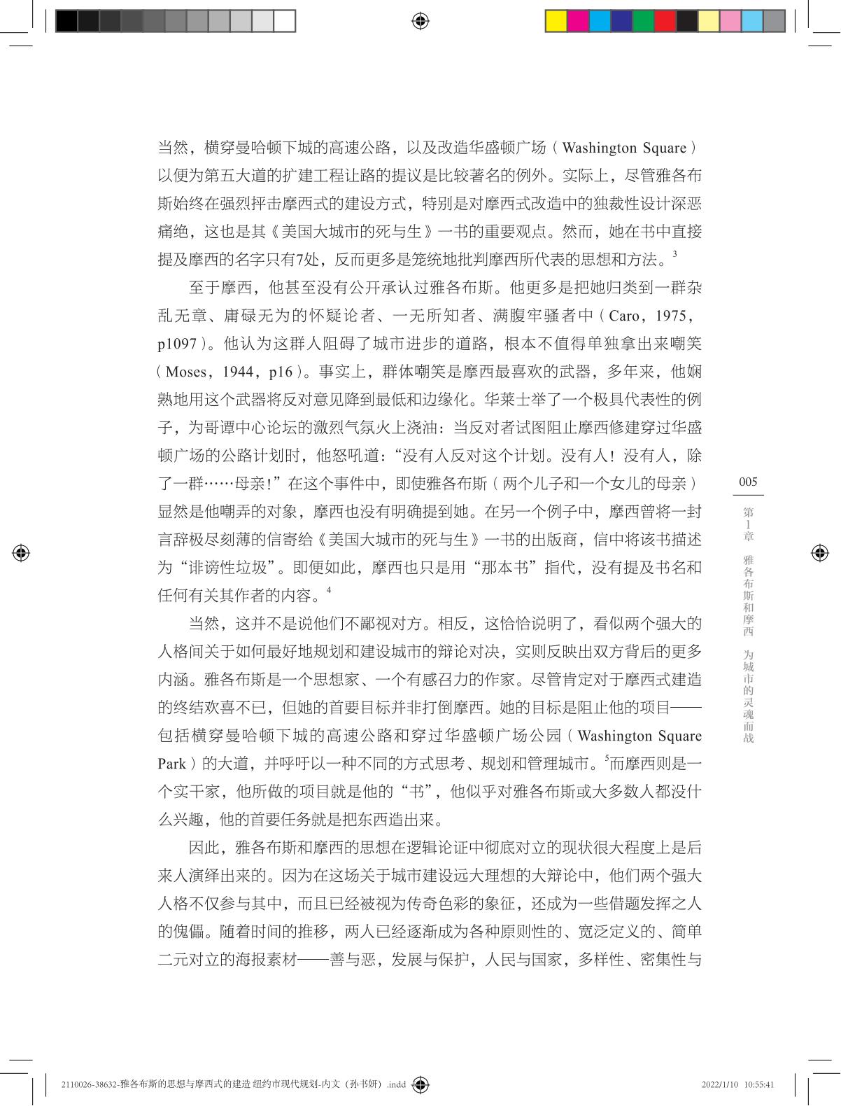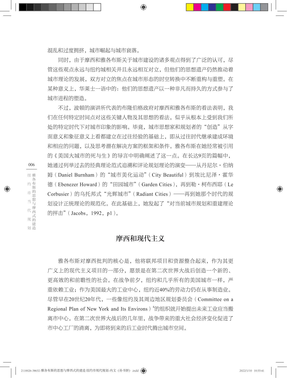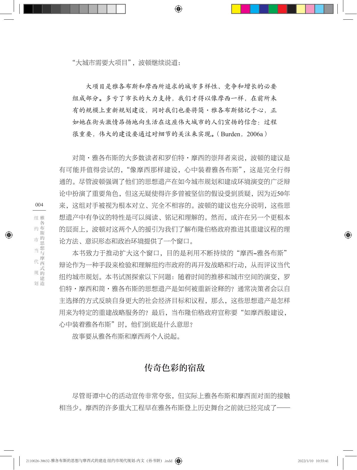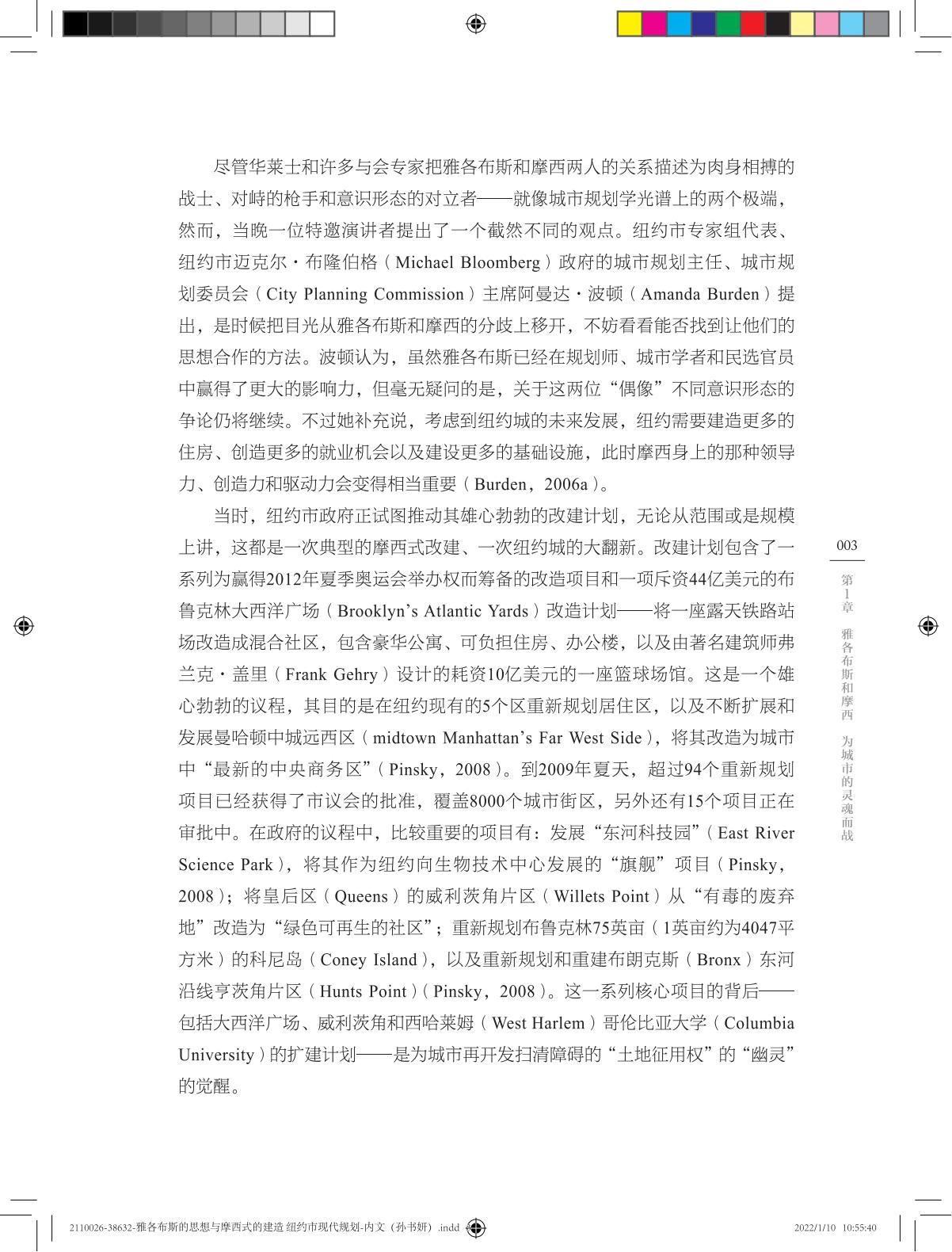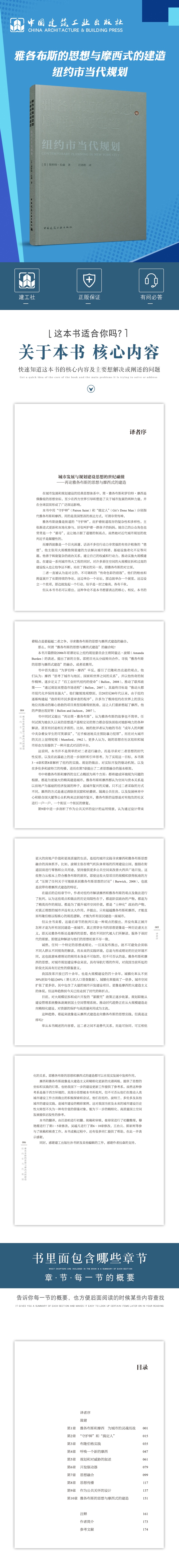 本书以摩西(1974)和雅各布斯(1960,1992)观点的描述作为开始,这种描述延伸到有关城市和区域规划以及城市设计中关于目的和手段的辩论。接着介绍了迈克尔·布隆伯格(Michael Bloomberg)市长的城市政府如何在制定城市发展议程中吸收了这些理念。落后于其他全球城市的威胁是诱发以寻求该议程公众支持的一种手段。本书覆盖了城市的努力,将摩西和雅各布斯的观点综合成一个连贯的学说,并以“像摩西与雅各布斯的思想”那样建设的真谛是什么的讨论作为总结。 虽然摩西从未当选任何公职,通过大规模的旧城改造和基础设施项目,一个经常被比喻为奥斯曼男爵再造巴黎的过程,他在纽约城市现代化的过程中取得了巨大成功。 雅各布斯则重视混合的土地用途和建筑类型、街道上的眼睛和非正式网络的作用在城市发展中的重要性。她的思想尤其影响了一直寻求内城“充满活力”的社区的城市设计师,以及今天和我们在一起的新传统和精明增长的城市设计思想。 规划师们正在调和摩西关于“supaprojects”与雅各布斯关于详细邻里城市设计之间的竞争性叙述。在市长迈克尔·布隆伯格的管理下,阿曼达·博登(Amanda Burden)用他的重建议程使纽约成为主要的全球城市。