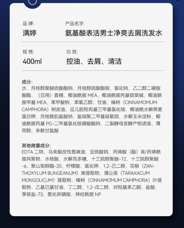 氨基酸男士净爽去屑洗发水400ml——加入会员下单享8折,满69元送满婷清满保湿洁面乳,满119元送祛痘控油沐浴乳