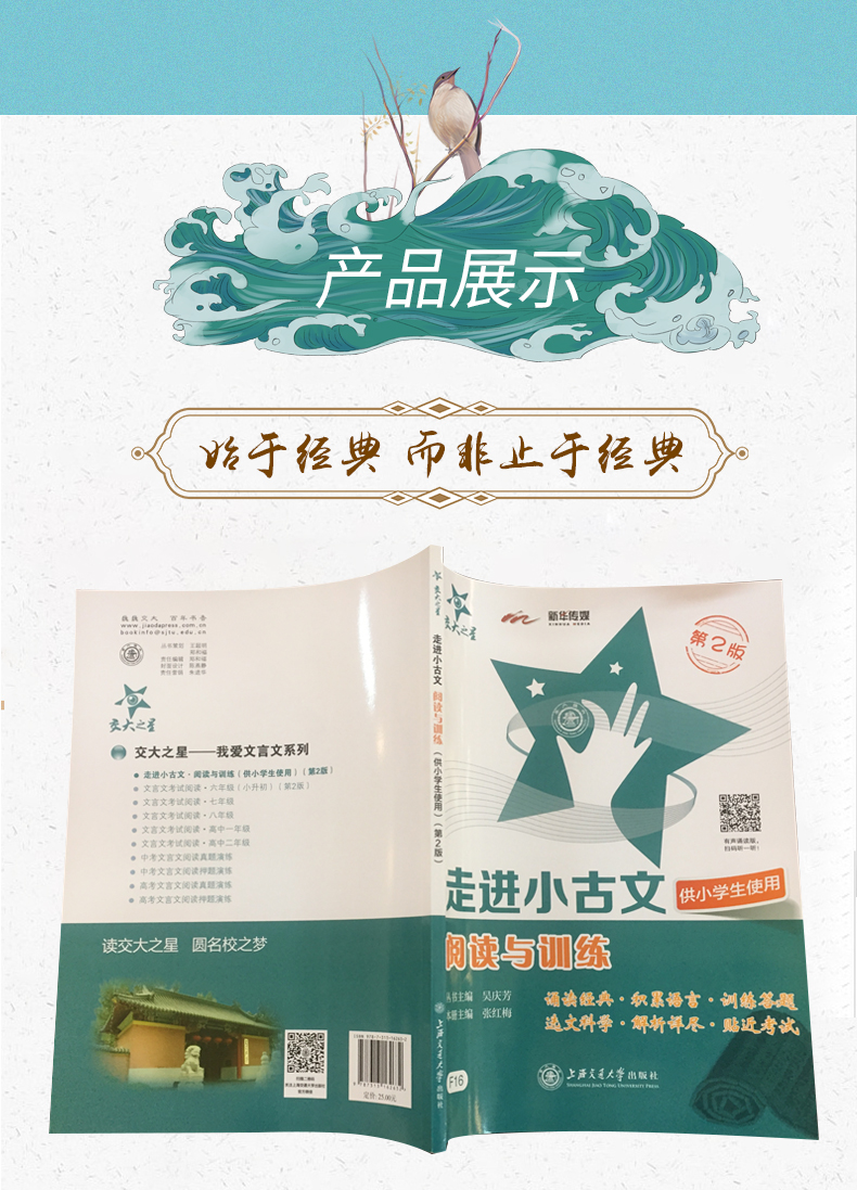 《交大之星——走进小古文·阅读与训练(供小学生使用)(第2版)》是“交大之星——我爱文言文”系列产品之一。《交大之星——走进小古文·阅读与训练(供小学生使用)(第2版)》共分三个部分:第一部分为小学生如何学好文言文的指导;第二部分为经典文言文阅读训练,精选寓言故事、成语故事、历史故事、神话传说、论辩与散句等经典小古文,每篇小古文下设有:诵读与训练、作者与作品、注释与译文。《交大之星——走进小古文·阅读与训练(供小学生使用)(第2版)》内容实用、取材新颖、解析详尽,可作为小学生文言文阅读训练之用,也可供小学语文教师教学参考。