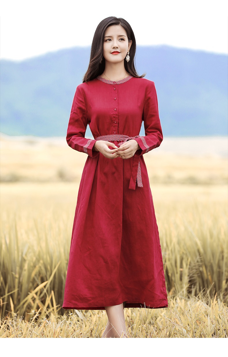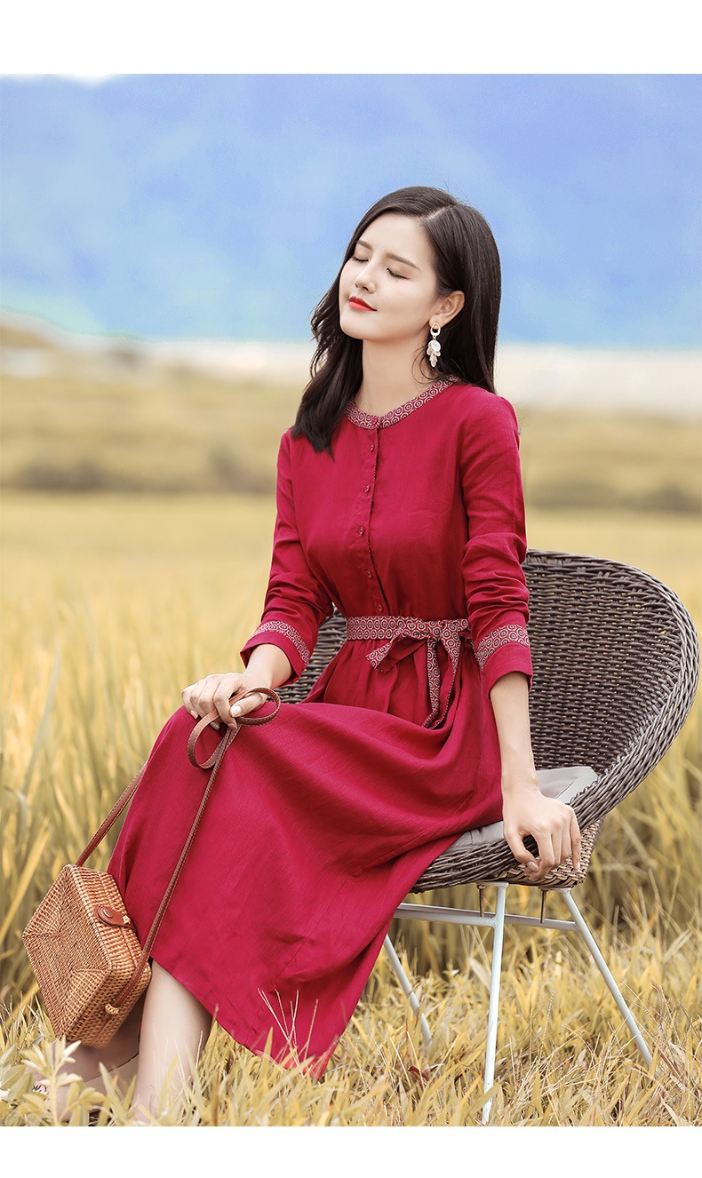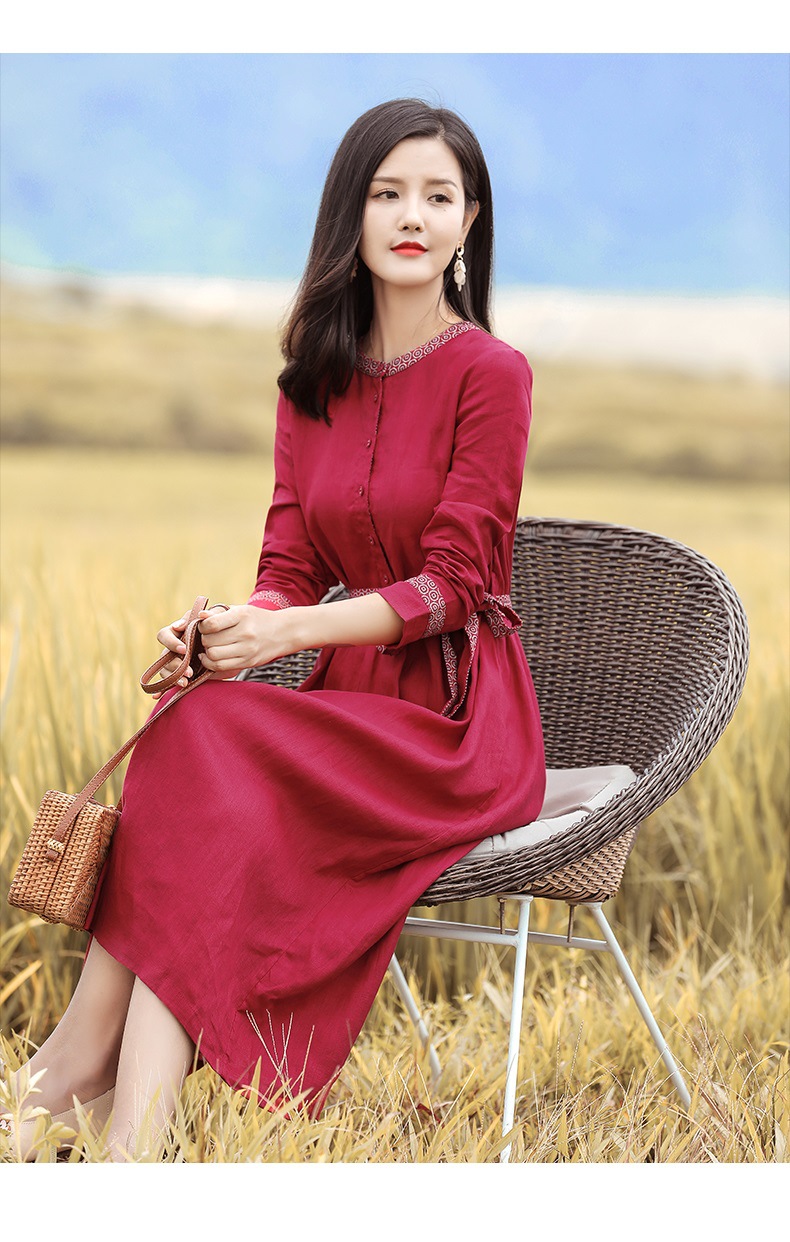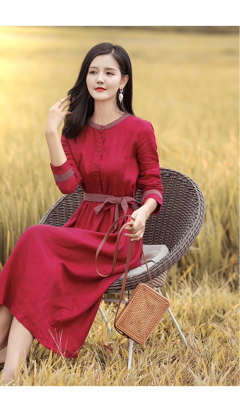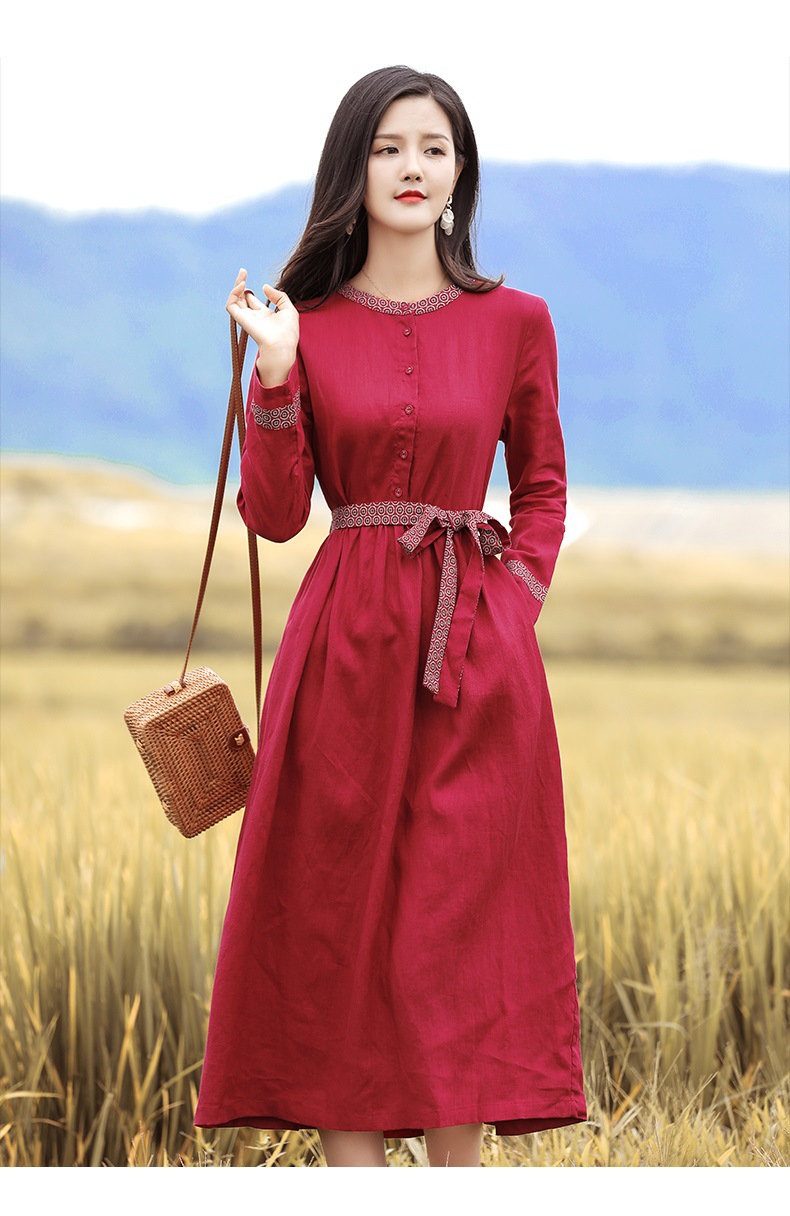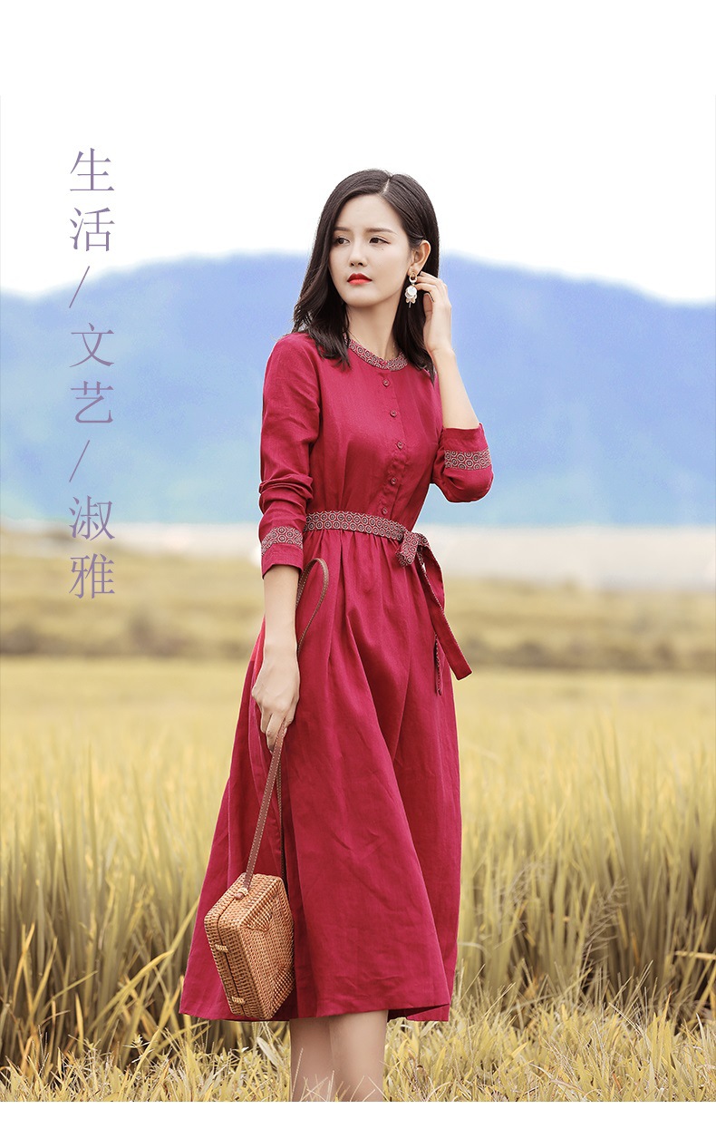 HM-S129秋季新款复古大气酒红色亚麻连衣裙长袖中国风系带棉麻A字裙长裙
