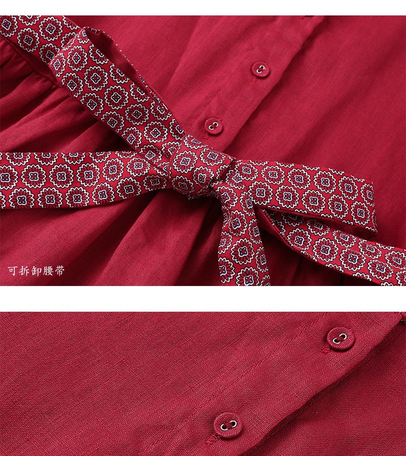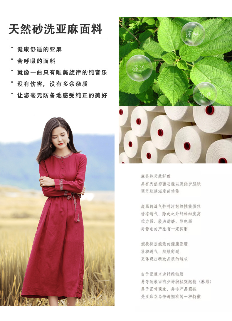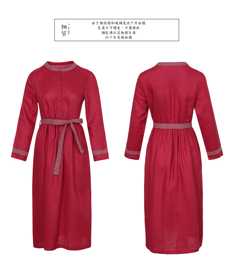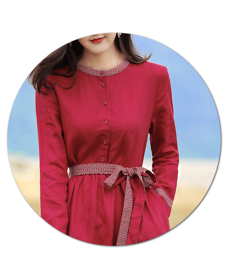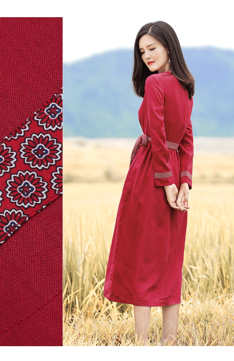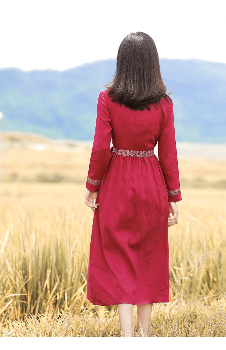 HM-S129秋季新款复古大气酒红色亚麻连衣裙长袖中国风系带棉麻A字裙长裙