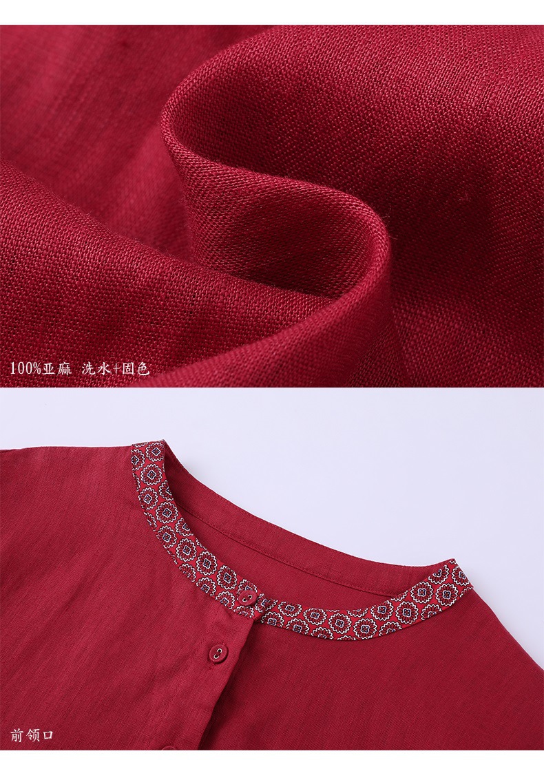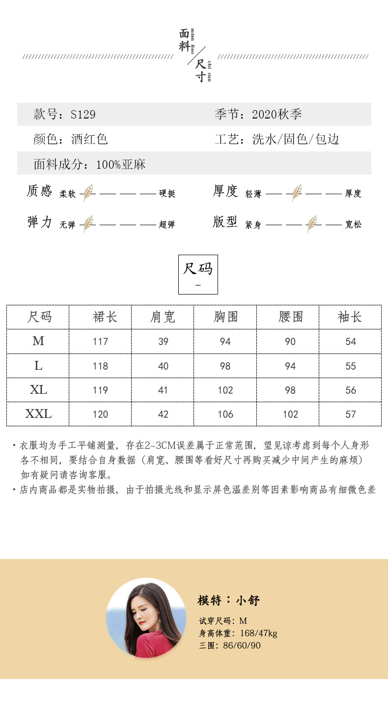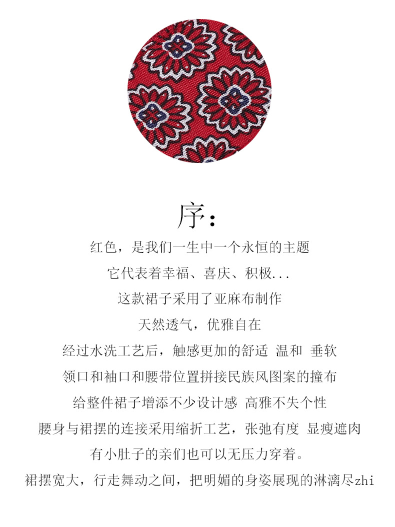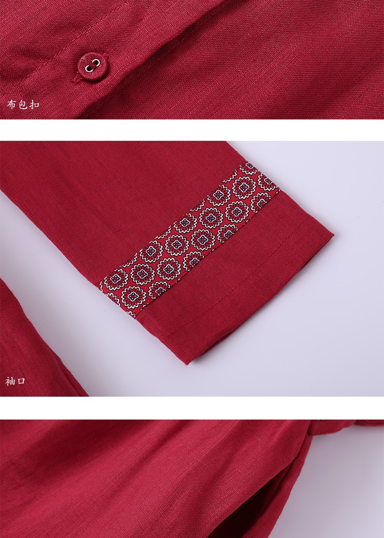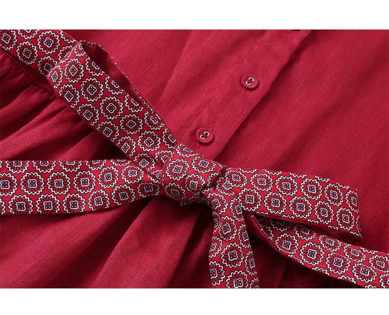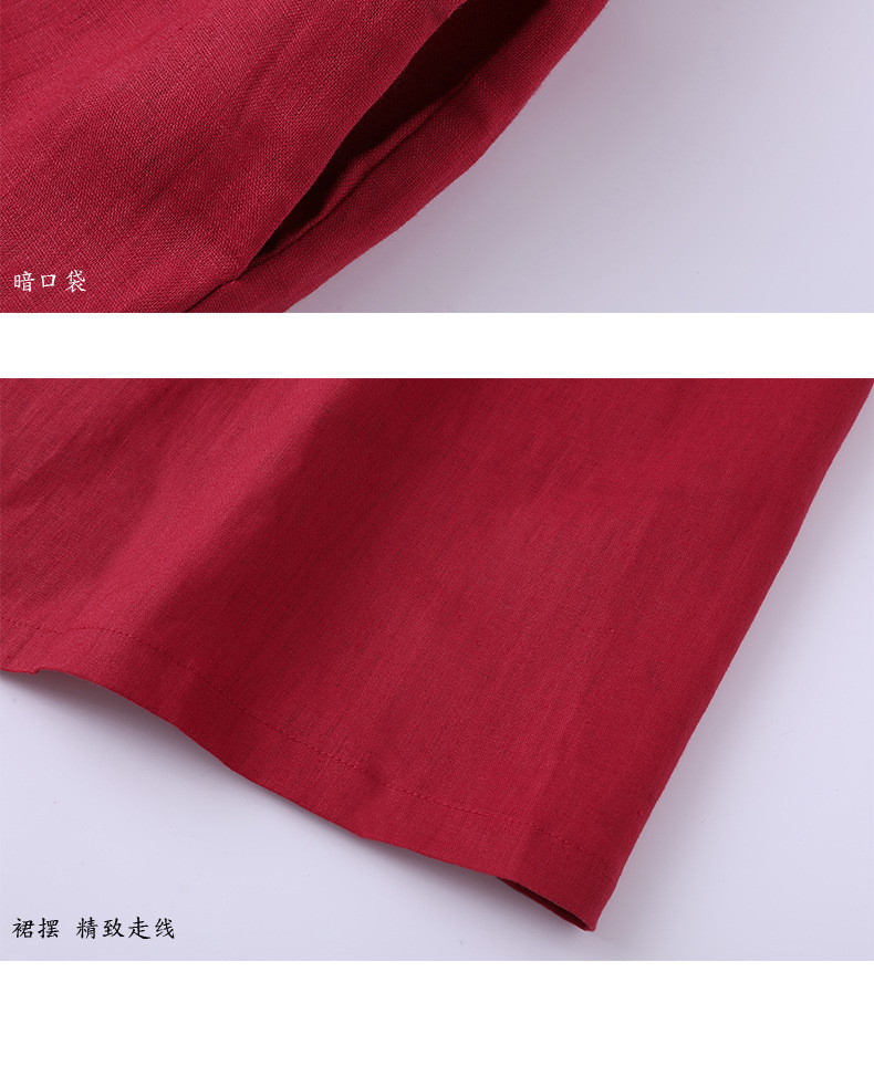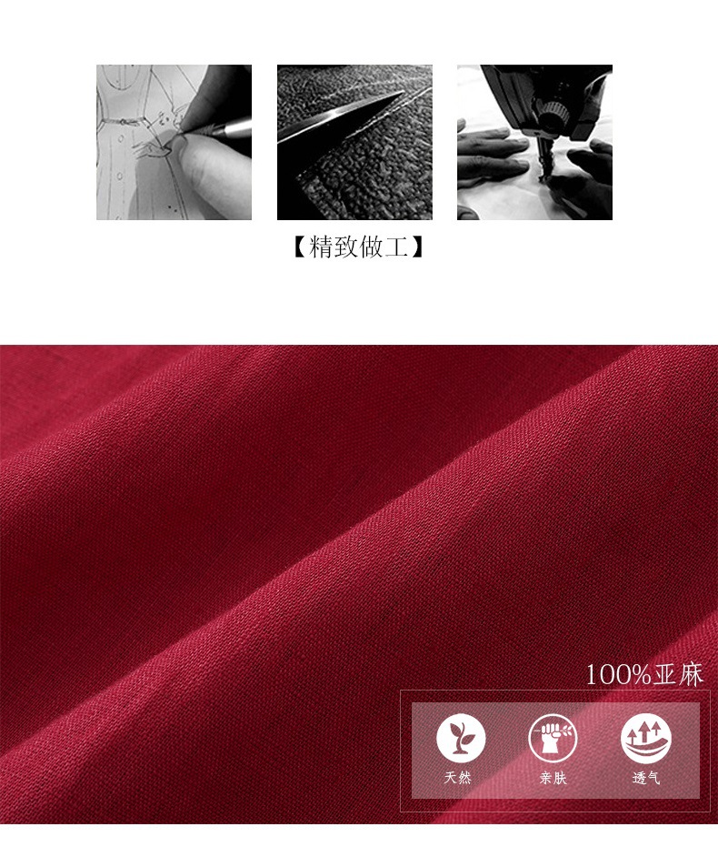 HM-S129秋季新款复古大气酒红色亚麻连衣裙长袖中国风系带棉麻A字裙长裙
