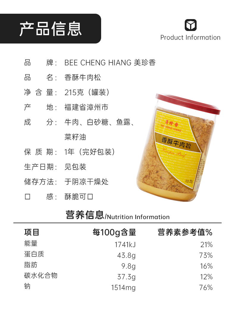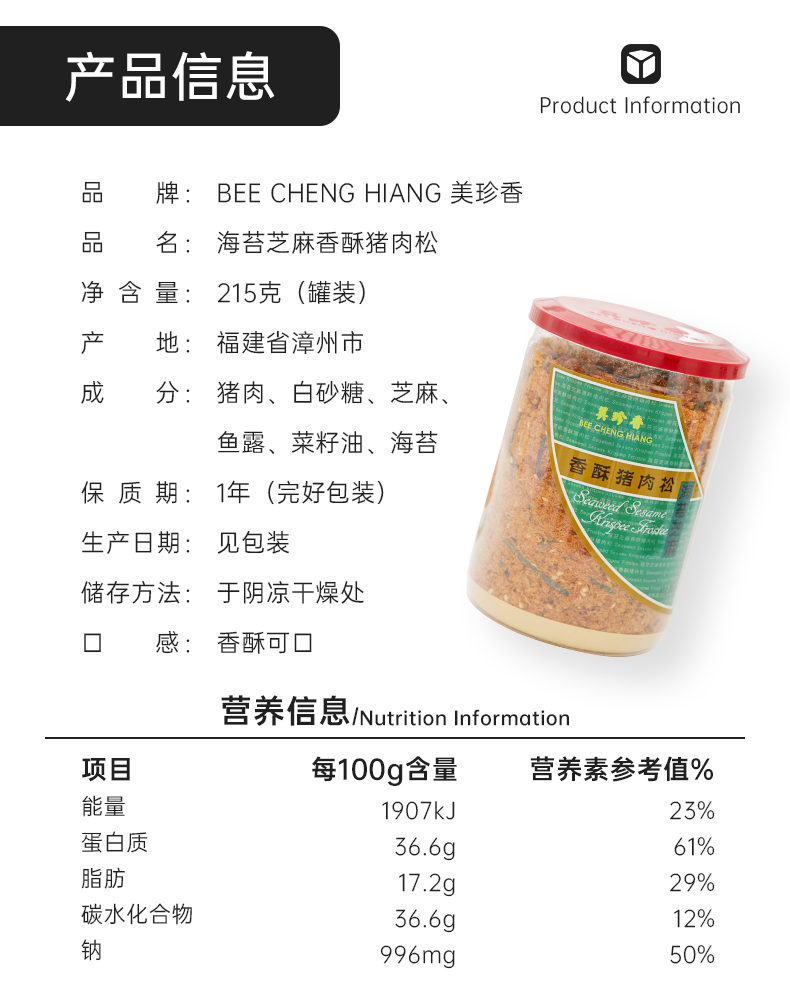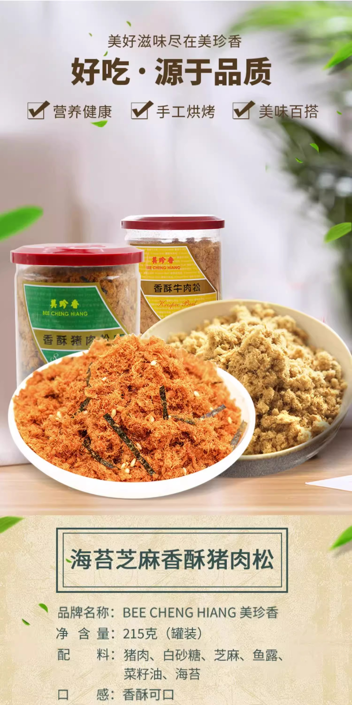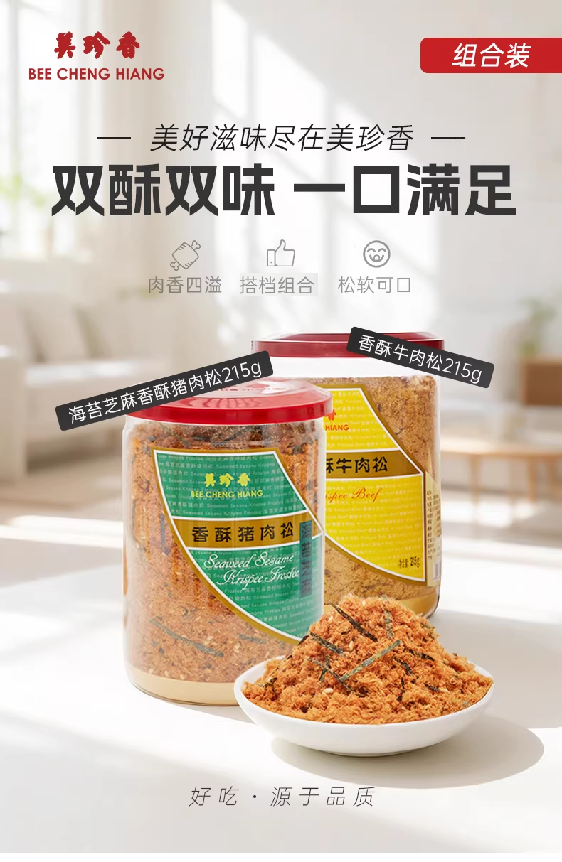 【组合】美珍香 海苔芝麻香酥猪肉松215g+香酥牛肉松215g组合